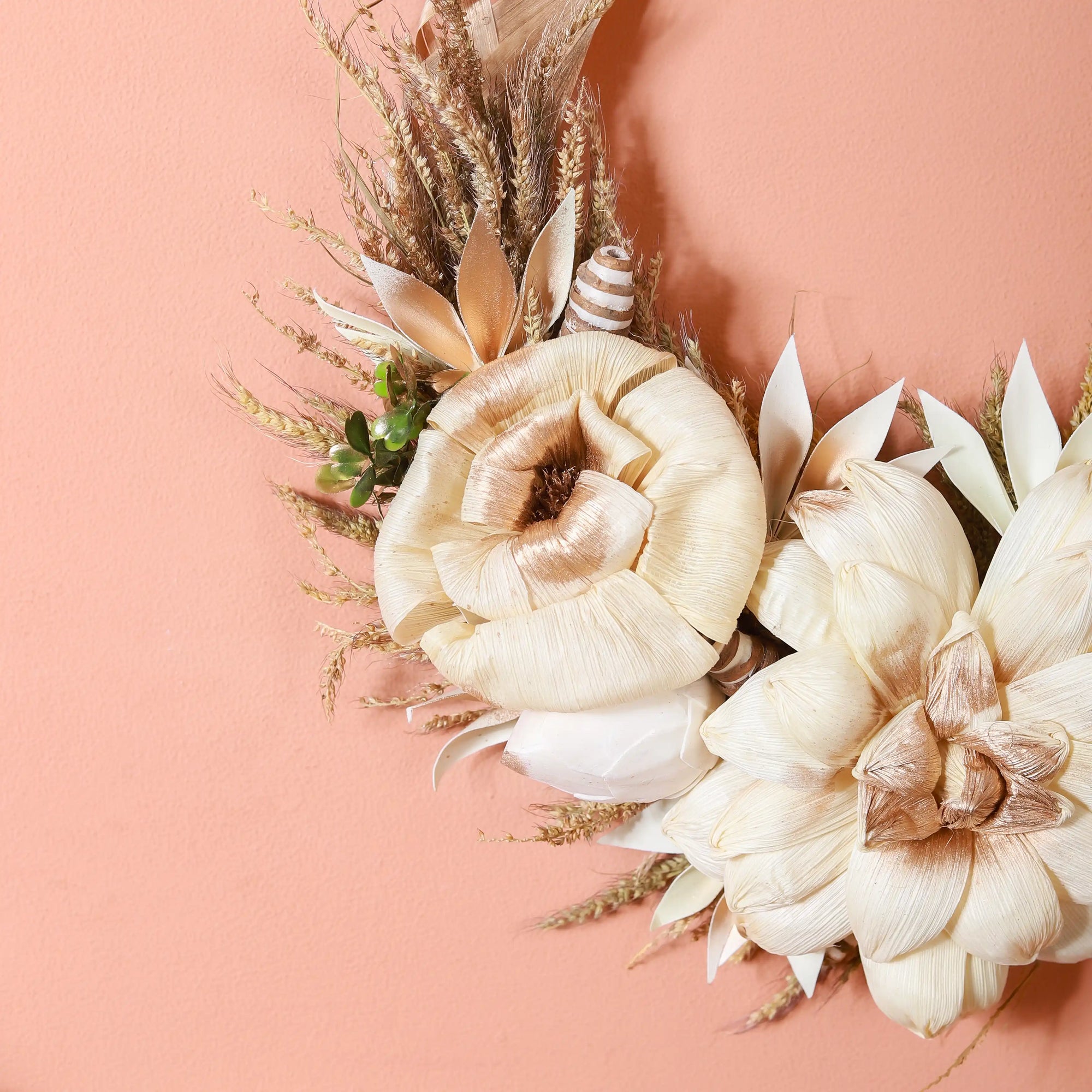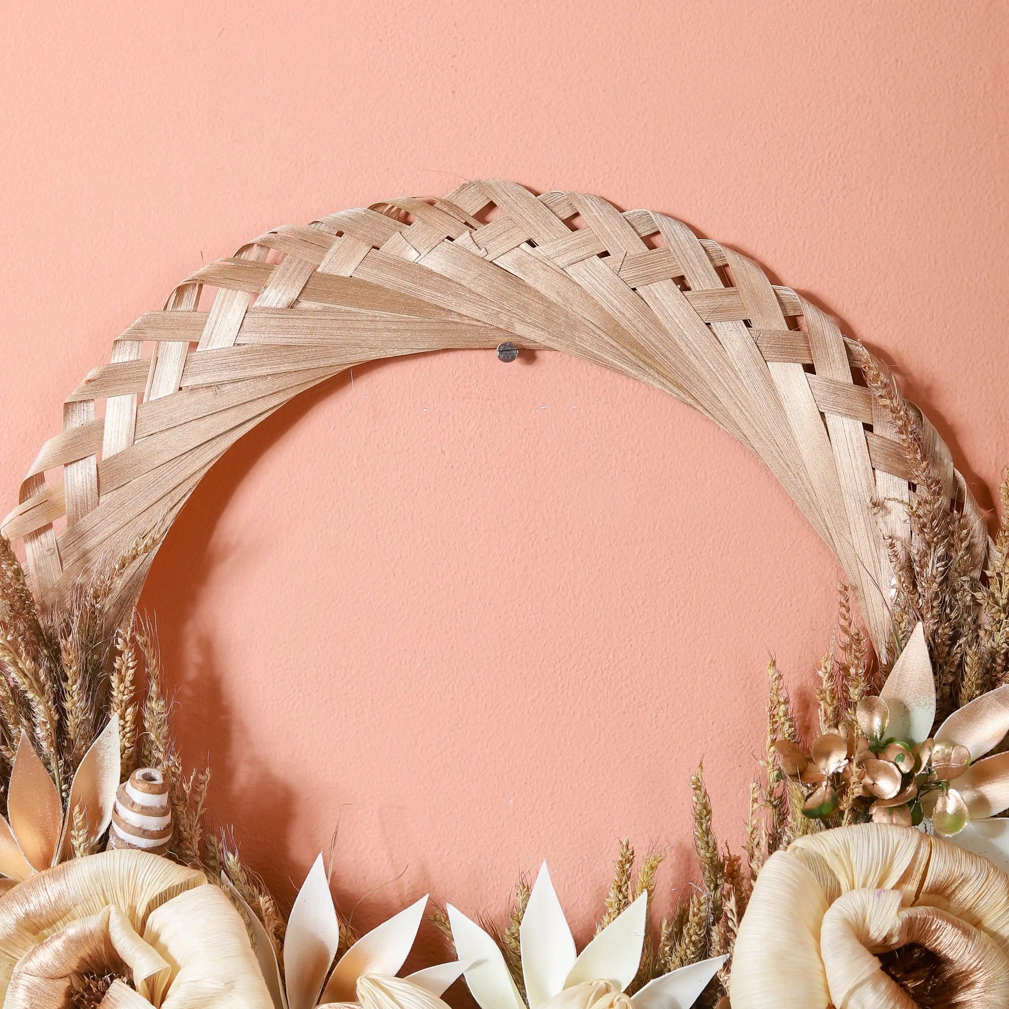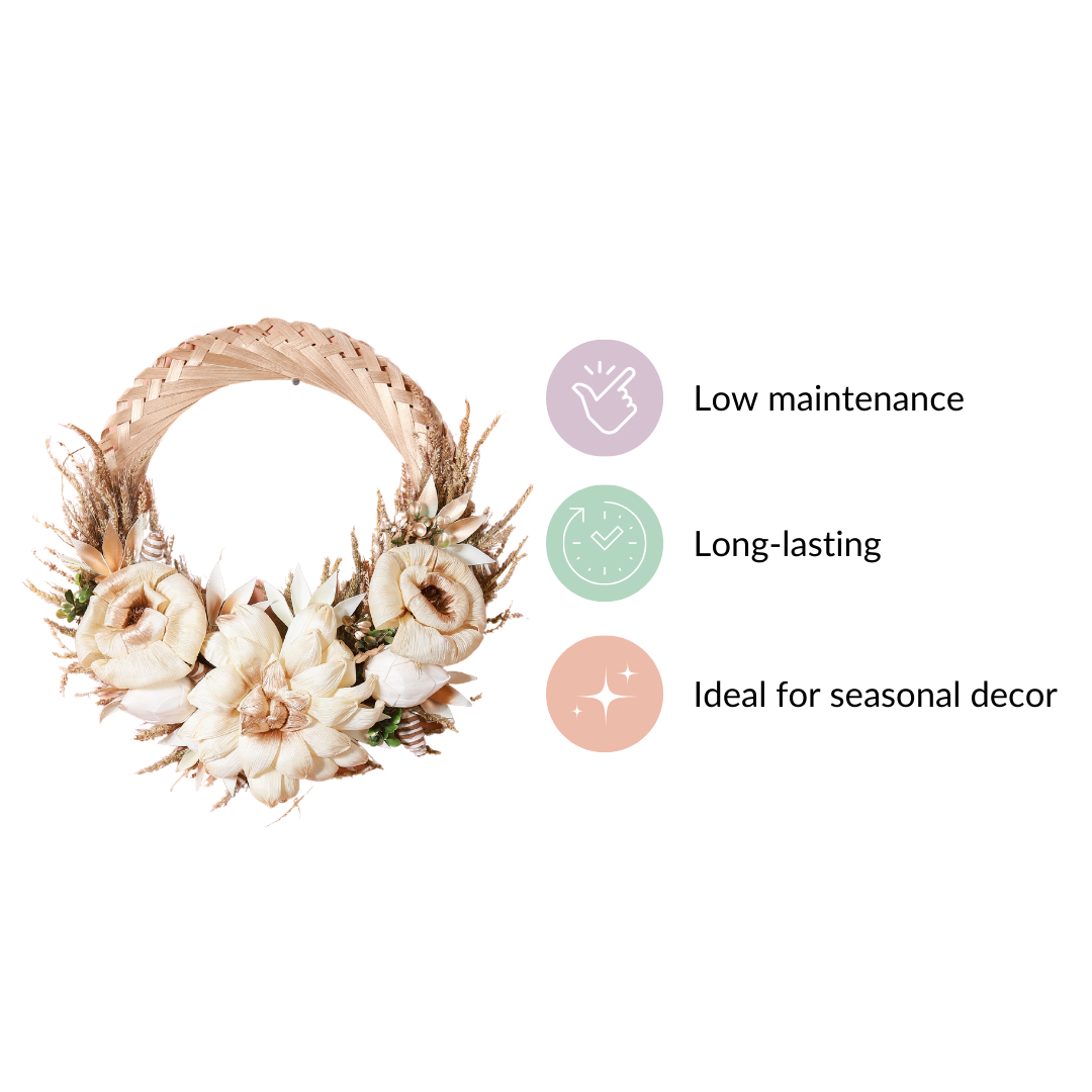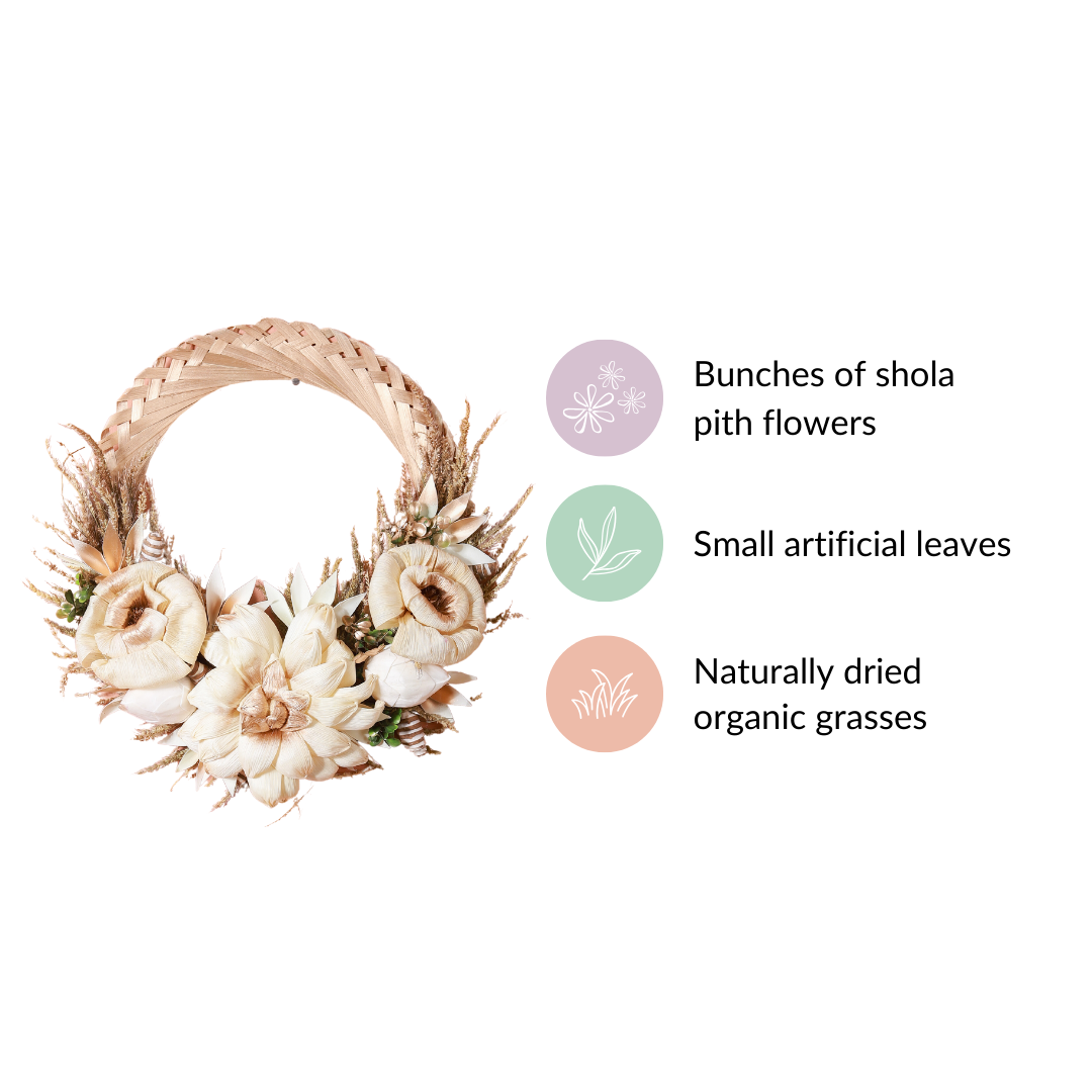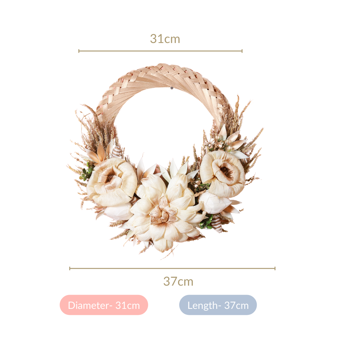 The decorative wreath will serve as a great addition to a garden party or outdoor tea event. The one-of-a-kind wreath showcases a mesmerising blend of dried palm leaves, shola pith flowers, and naturally dried organic grasses. The soothing white colour of the wreath provides a neutral colour palette, making it seamlessly blend with any occasion or event. The wreath exudes a sense of elegance and can be fashioned as a great centerpiece decoration for your garden parties and outdoor tea events.