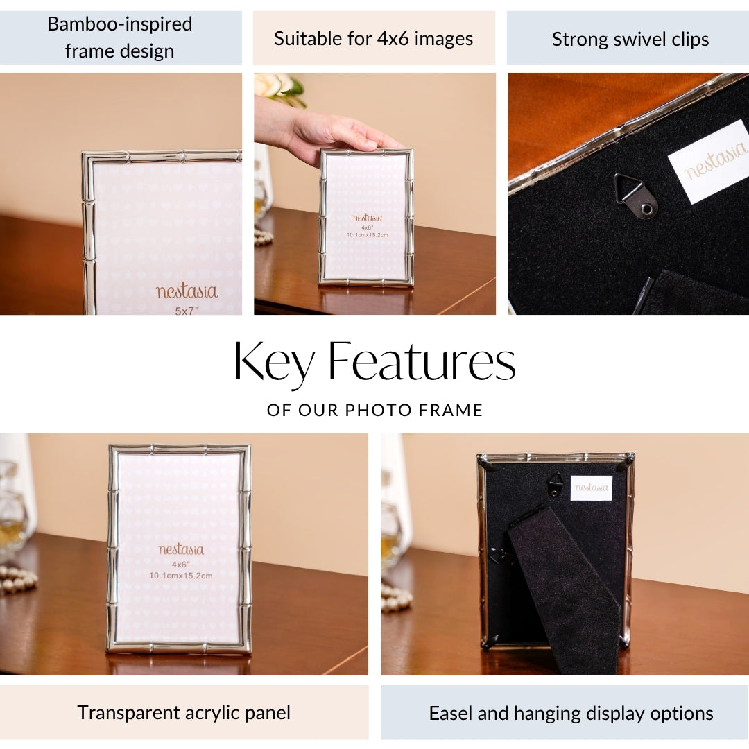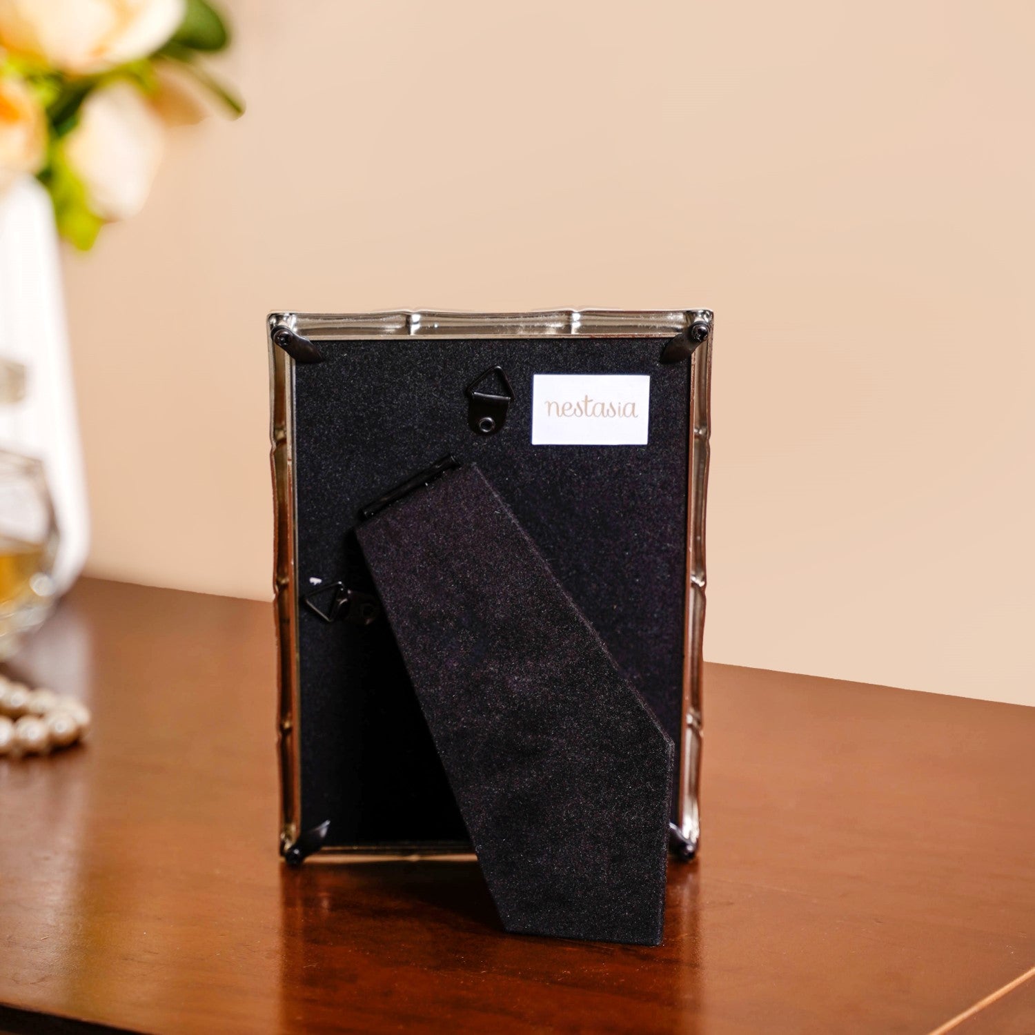Design: This elegant piece features a silver resin frame sculpted to resemble bamboo stems, complete with soft ridge detailing and a glossy finish. The clear acrylic front ensures sharp visibility, while the minimalist structure keeps the focus on your photo. It comes with a velvet cover at the back and an attached satin-thread stand. Compact and gift-ready, it’s perfect for any occasion. This frame is perfect for displaying 4x6" photos.