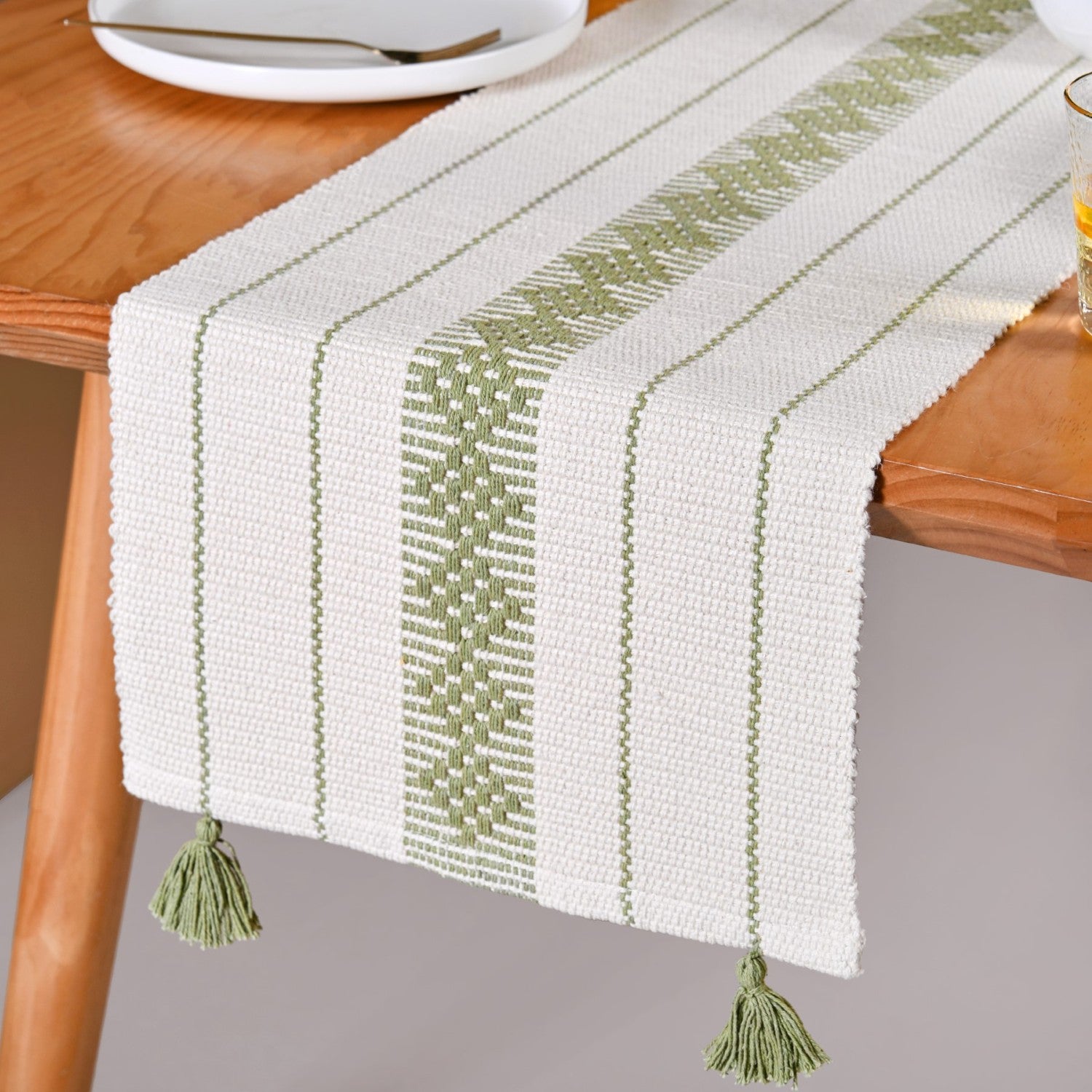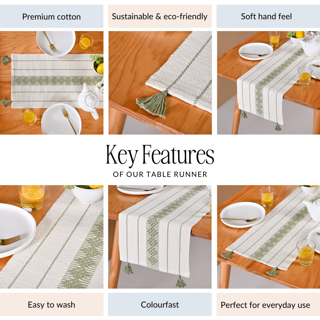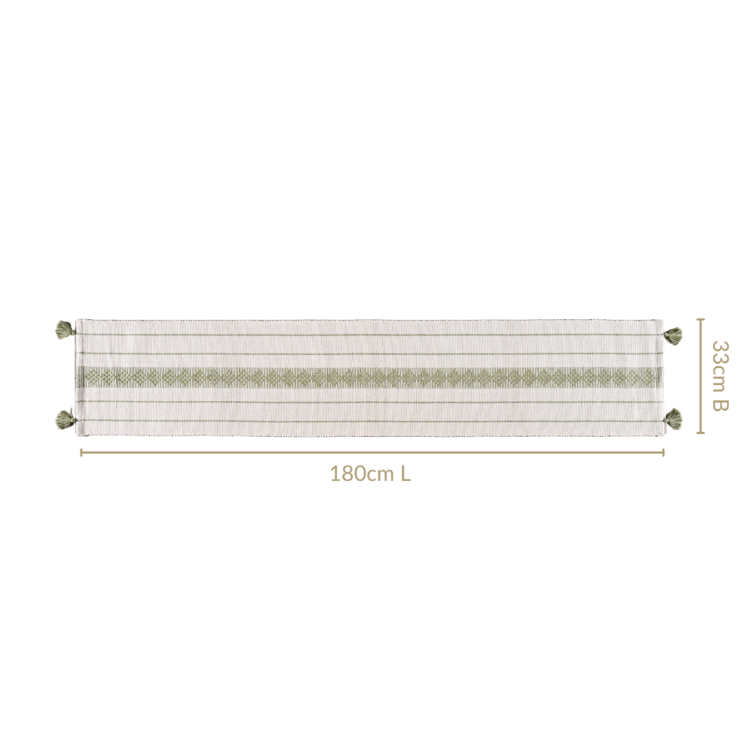 Design: This runner is crafted from soft, woven cotton that feels comfortable and adds natural texture to your table. The green geometric panel sits at the centre, framed by slim woven stripes that guide the eye down the length of the fabric. Tasseled corners complete the look with a touch of craft-inspired character.