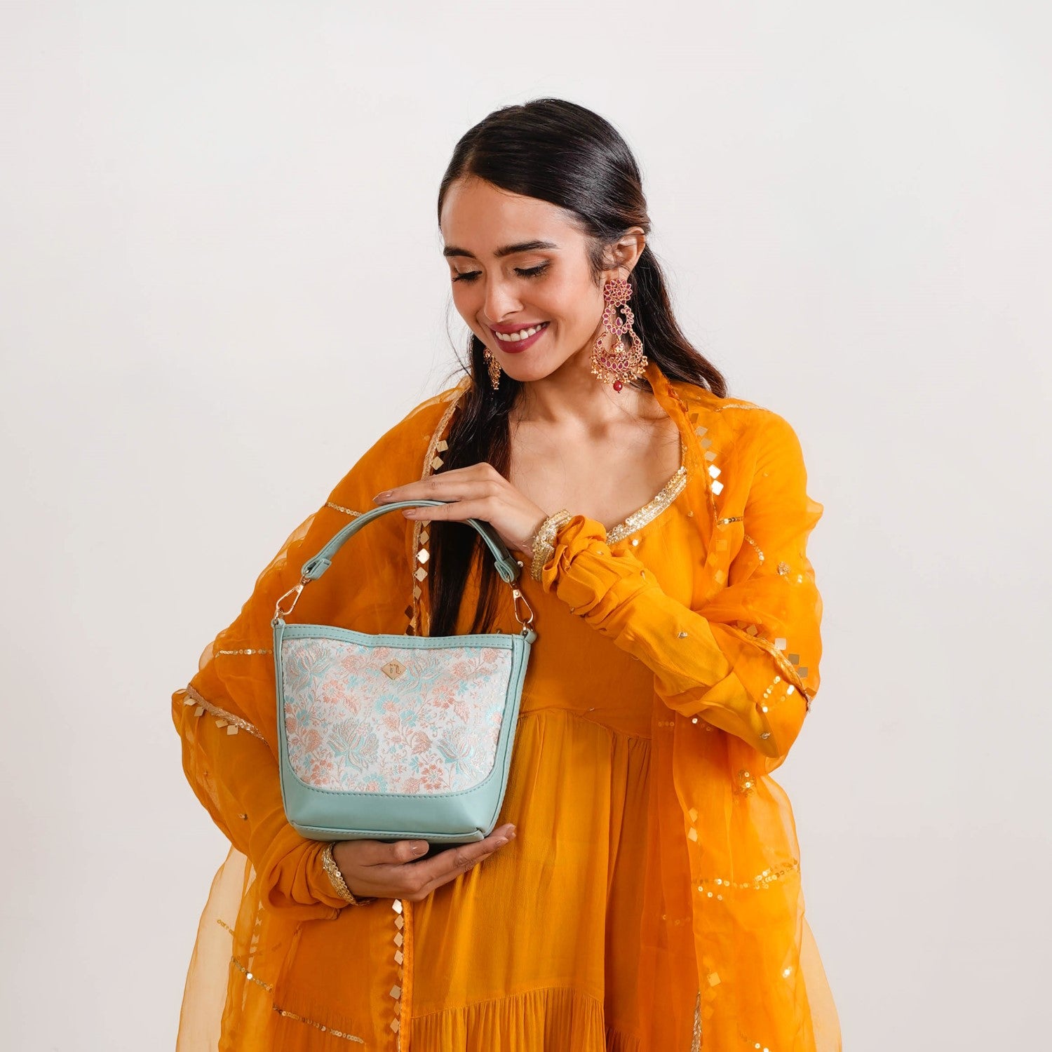 Design: Showcasing master artistry, the Eden bucket bag is crafted from high-quality PU leather and jacquard. The delicate embroidery of the floral motif and its soft hues create a stunning visual palette of elegant femininity, while the mint green frame adds a pop of vibrancy. Thoughtfully designed for everyday use, its spacious main compartment, complemented by a zippered interior side pocket, offers ample room for your essentials, while the magnetic button closure ensures your belongings are secure. The gold hardware detailing adds an essence of luxury that elevates the bag's overall appeal, making it the perfect accessory for both casual outings and more sophisticated occasions.