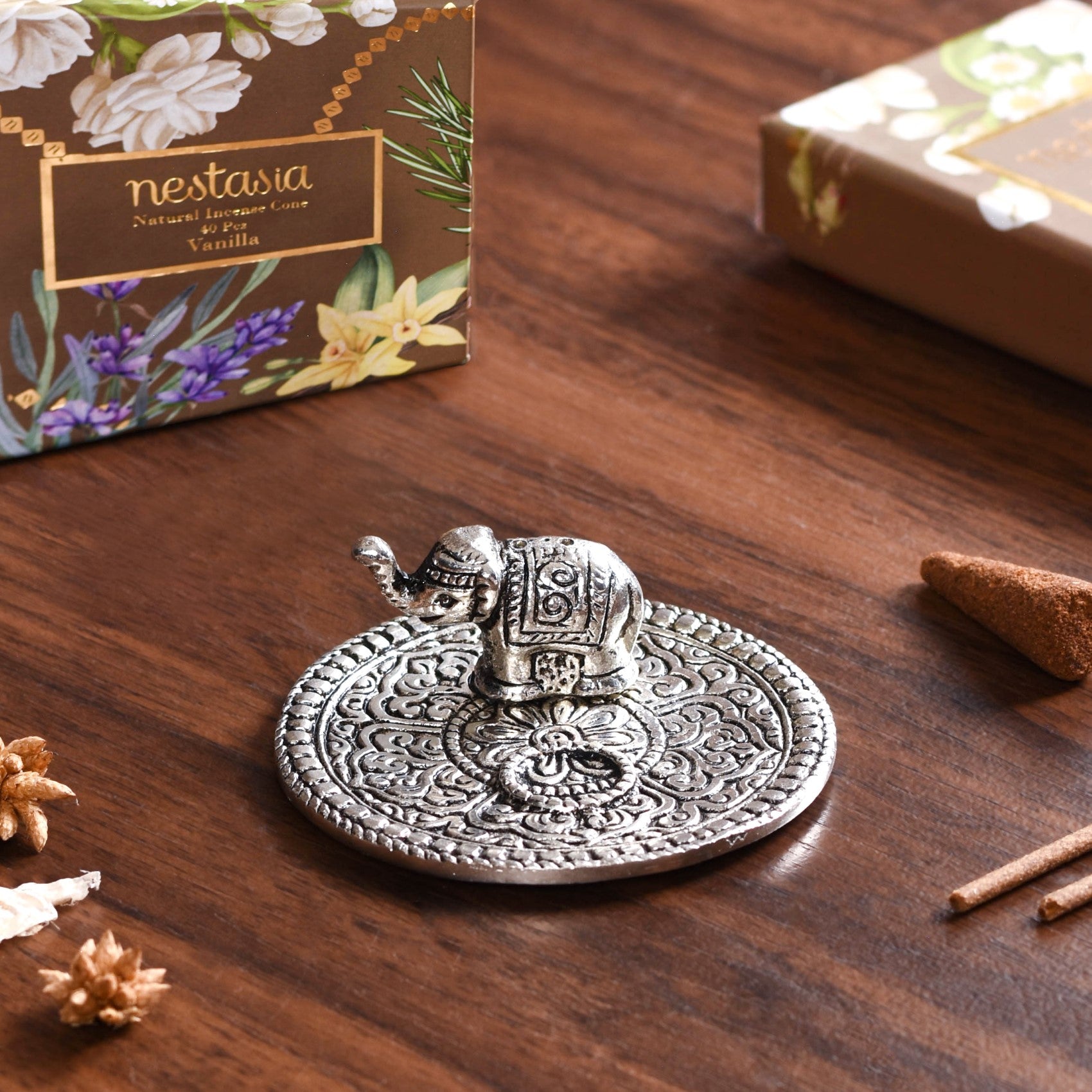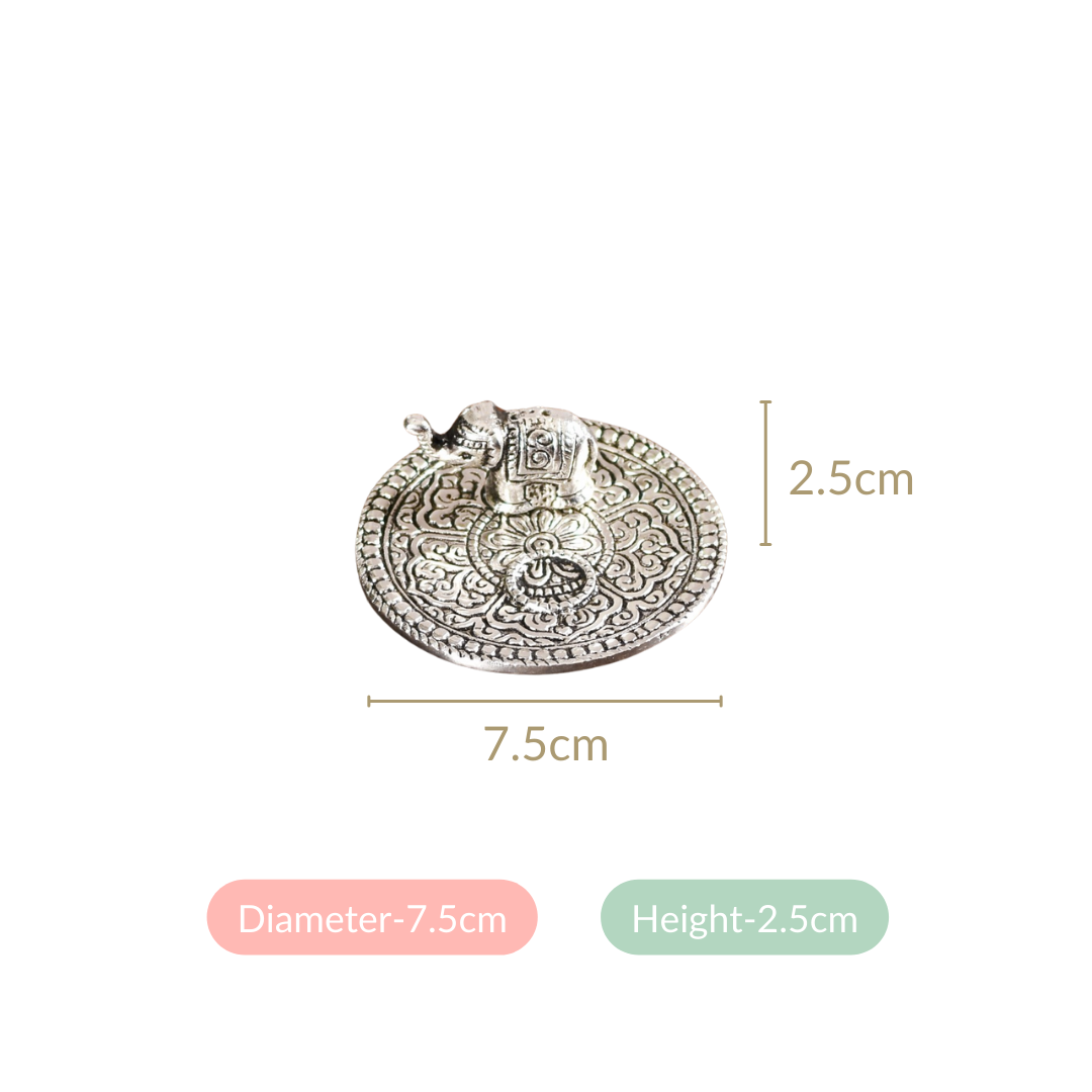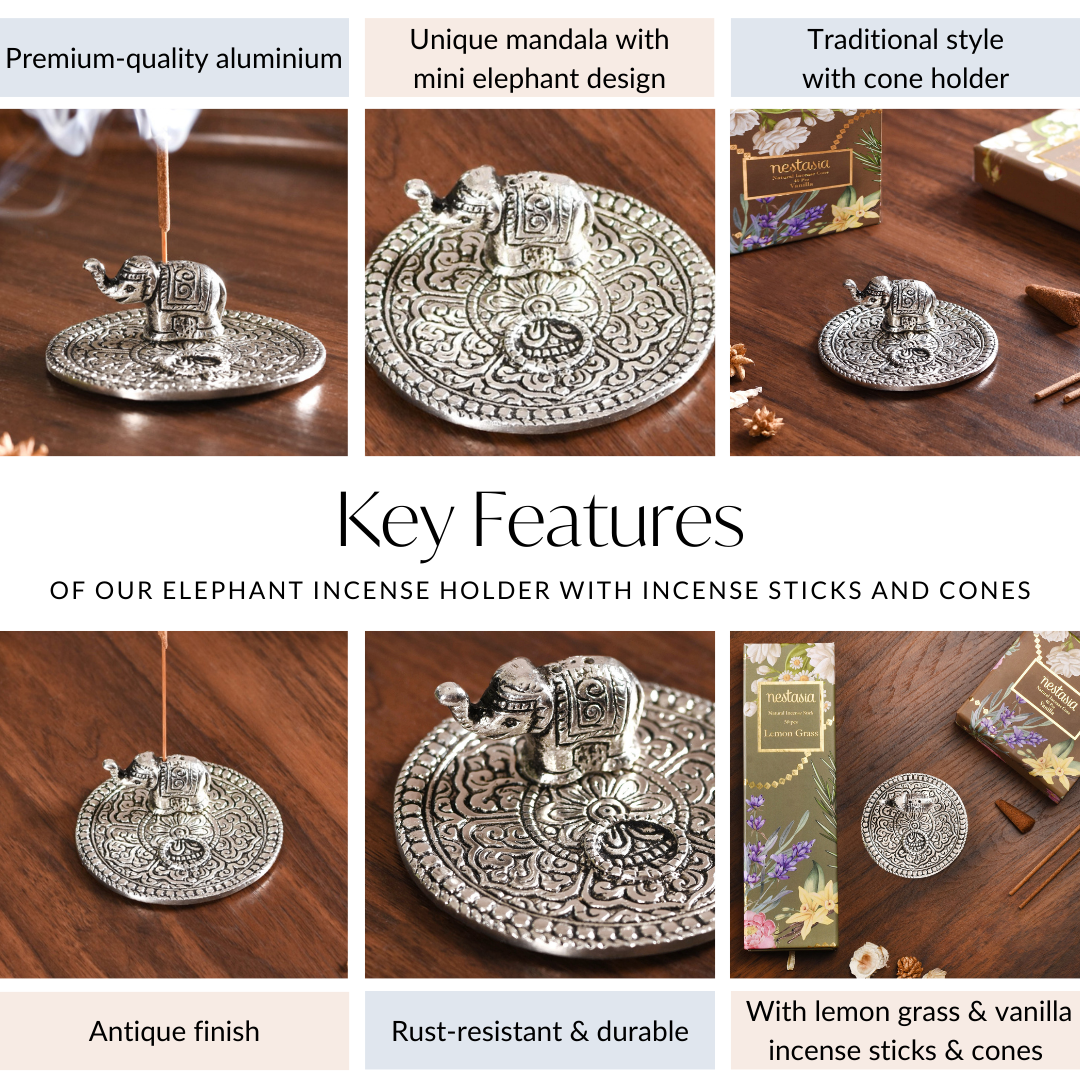 Premium-quality aluminium Unique mandala with mini elephant design Traditional style with cone holder Antique finish  Rust-resistant and durable Comes with a box of lemon grass incense sticks and vanilla incense cones