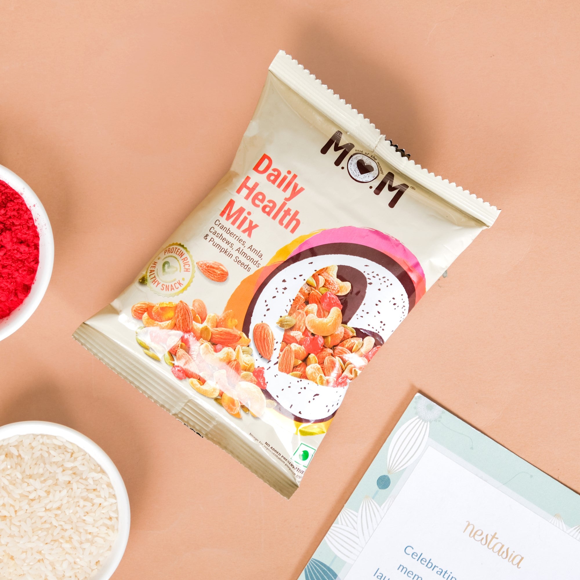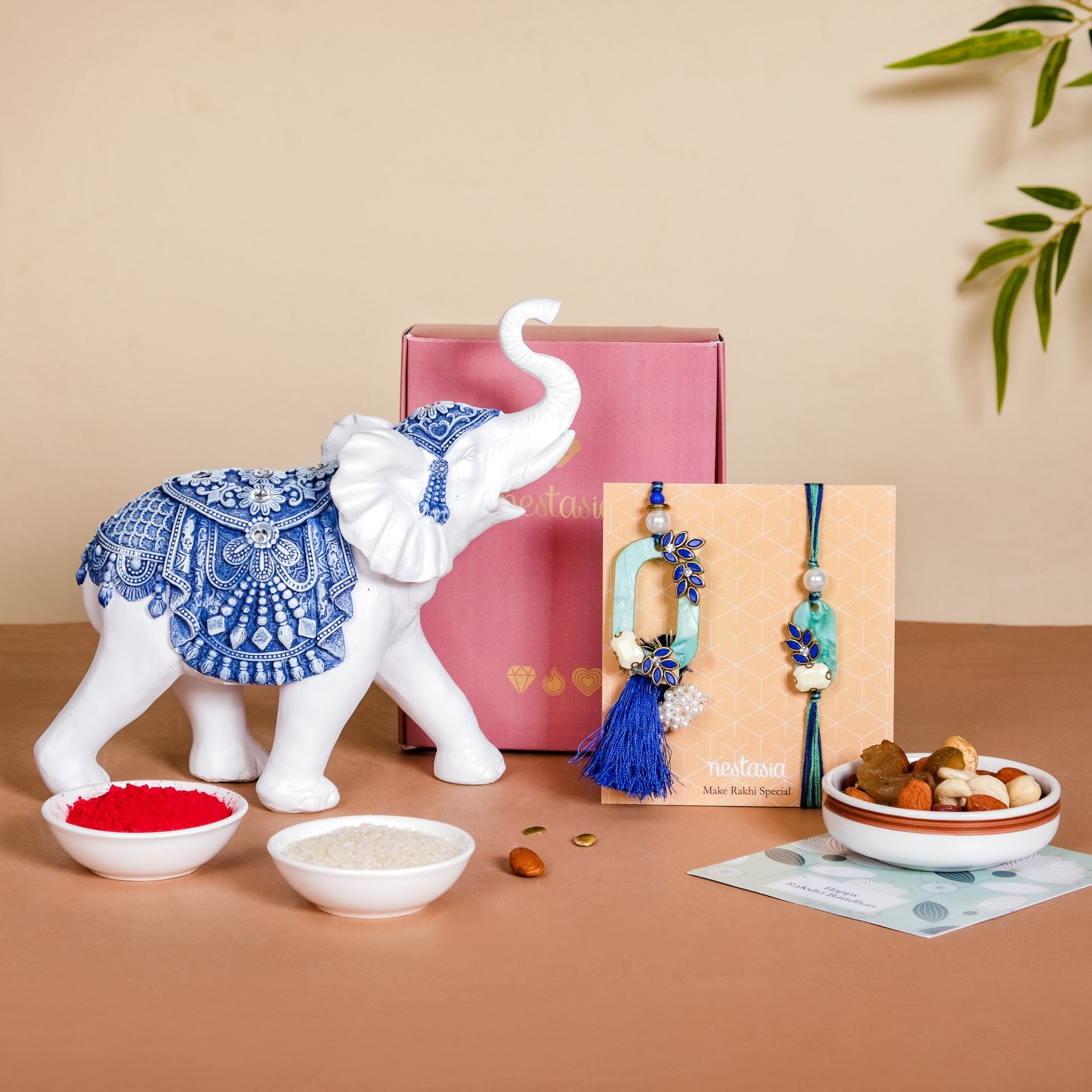 Discover the essence of Raksha Bandhan with our exclusive Rakhi gift hamper, crafted to honour the timeless bond between siblings. This beautifully curated hamper includes a stunning Rakhi-Lumba set for your bhaiya and bhabhi, an intricate elephant showpiece for prosperity, and a roli-chawal set for auspicious rituals. Delight in a pack of premium dry fruits, elegantly presented in a gift box, complemented by a heartfelt wish card to convey your emotions. Embrace the spirit of this cherished festival with our thoughtfully assembled hamper, designed to bring joy and blessings to your festivities. Ideal for gifting or personal enjoyment, it’s a true expression of love and tradition.