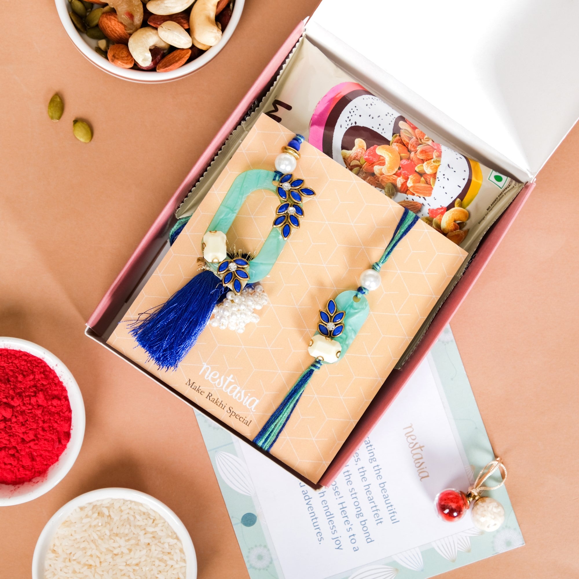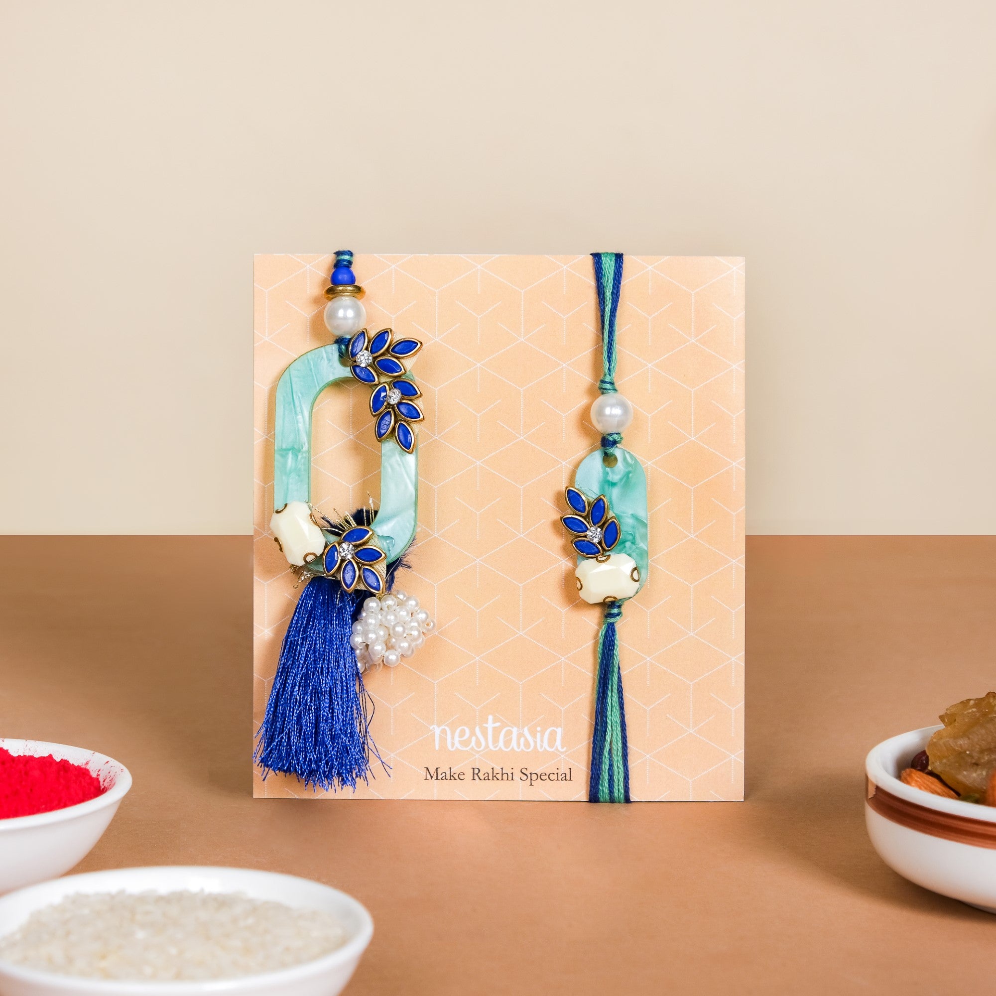 Blue Leaf Motif Designer Rakhi Lumba Set Of 4 With Box And Card |