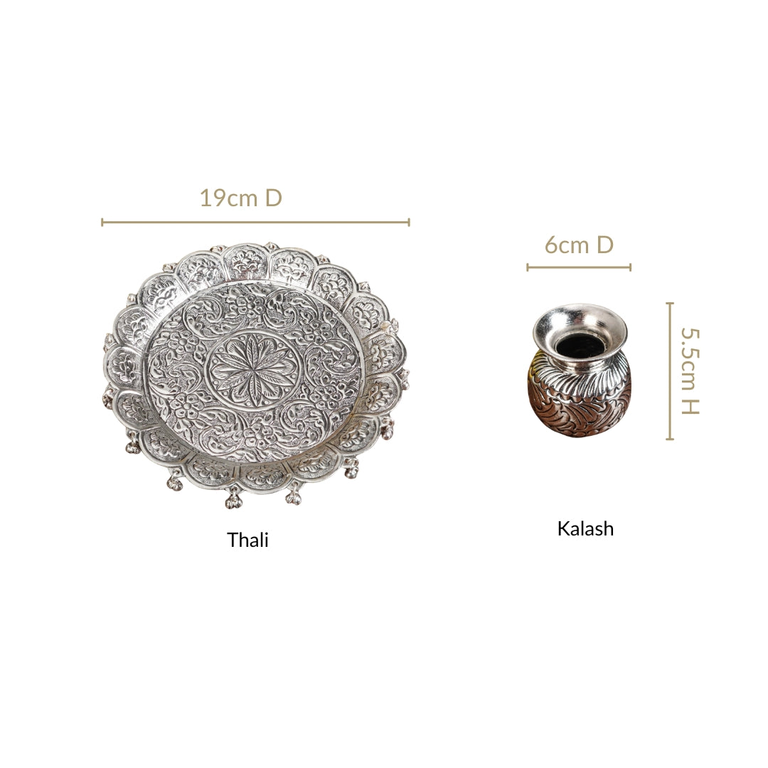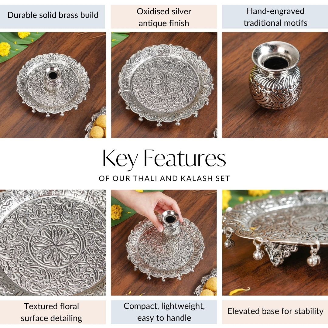 Design: This pooja thali is handcrafted from solid brass and coated in a silver oxidised finish that enhances its antique character. The round thali features a detailed floral medallion at its centre, bordered by radial engravings that radiate outward in harmony. A scalloped rim lines the outer edge, with repeated leaf carvings that showcase symmetry and traditional styling. The base is lifted on three evenly spaced brass stands, offering both elevation and structural integrity. Its slightly raised edge ensures that diyas, roli, chawal, and other essentials remain securely placed during rituals. The kalash is compact in form with a bulbous lower half, featuring leaf-engraved surfaces, a raised circular base, and a gently flared rim for easy access and graceful design balance.