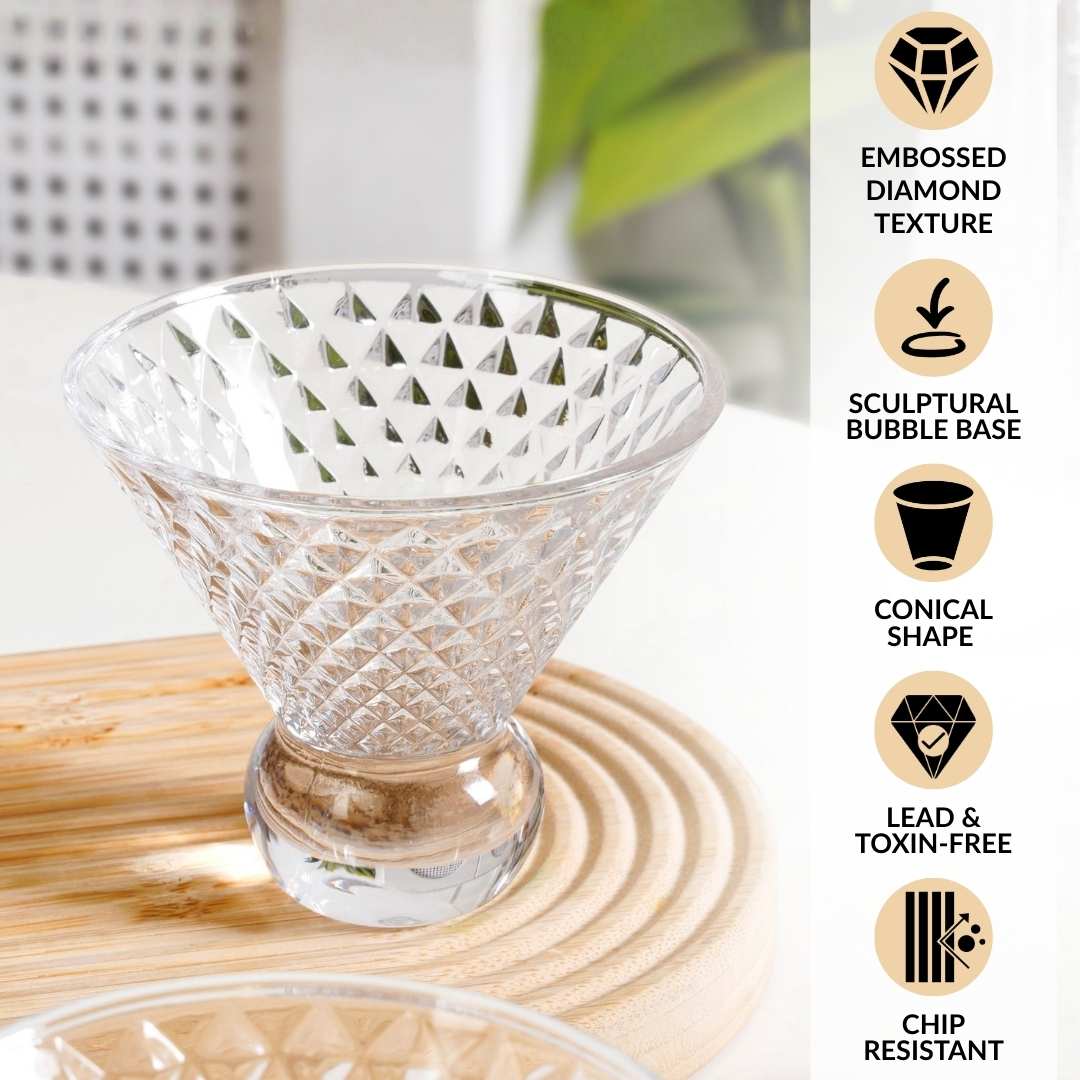 Design: Designed to turn heads at every gathering, this statement cocktail glass blends artistry with function. The bowl features a diamond-cut textured pattern that reflects light elegantly, creating a sparkling visual effect. Its clear finish, wide flared rim, and rounded pedestal base combine to offer a bold yet sophisticated aesthetic. Its wide, flared bowl is perfect for serving martinis, cosmopolitans, mocktails, or even gourmet desserts.