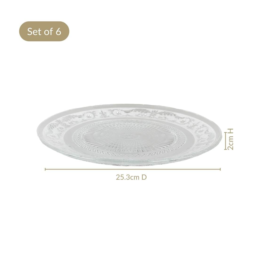Design: Made from premium-quality glass, this set of six dinner plates features a clean finish with an elegant bottom embossed pattern and a raised border for a refined look. The set is neatly packed in a sturdy gift box, making it perfect for gifting.