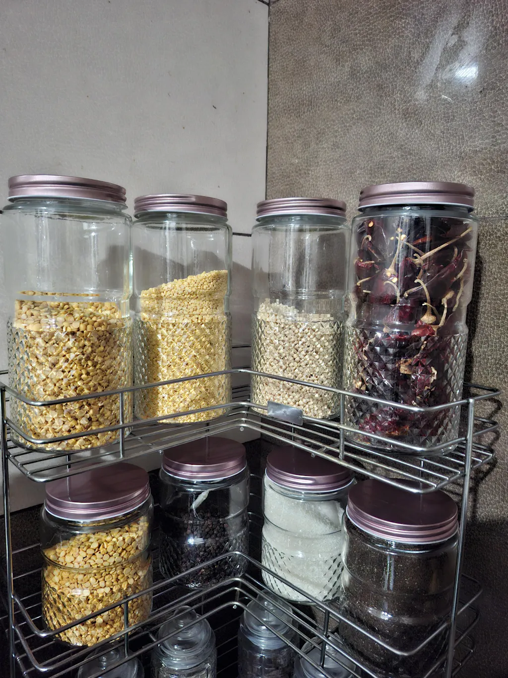 Design: This glass jar set is made from premium quality transparent glass and has a dual design. The upper part of the jars is plain with two subtle horizontal ribbed lines, while the bottom section has a textured diamond design. It has a sleek rose-gold metal lid which is shiny and adds to the overall aesthetic of the jars. These jars effortlessly blend function with style, making them ideal for both storage and display.