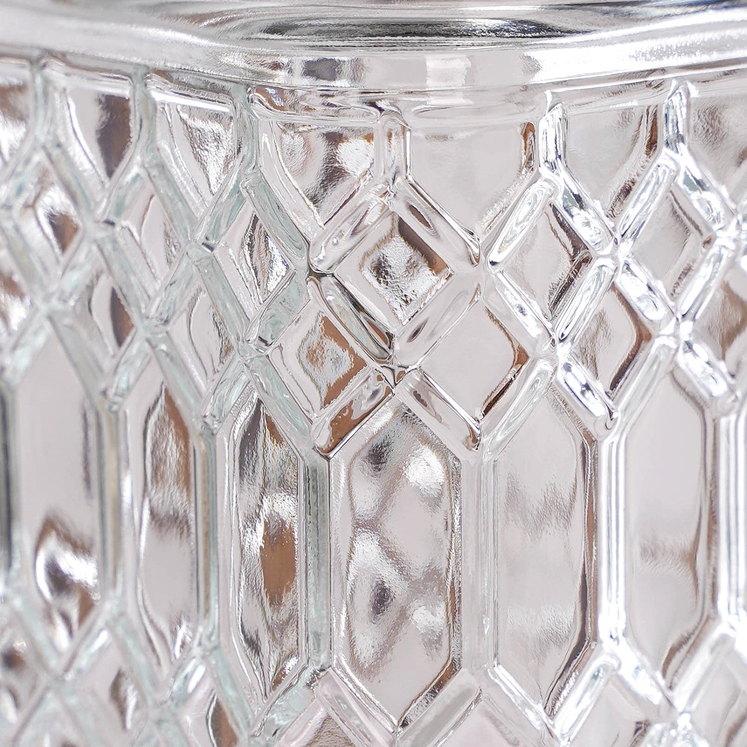 Design: This sophisticated glass jar boasts a sleek square silhouette with subtly rounded edges that lend it a soft, refined presence. The clear glass body is intricately adorned with an embossed diamond-texture motif, lending a vintage-inspired richness to the design. Topped with a minimalistic round metal lid in a muted rose-gold hue, the contrast between the ornate glasswork and contemporary matte-finish lid creates a visually balanced piece that feels both nostalgic and fresh.