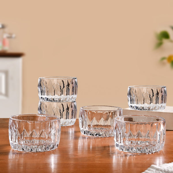 Design: These transparent glass snack bowls showcase an embossed design, creating a striking visual appeal. A decorative floral cut at the base adds elegance, while the smooth inner surface highlights the clarity of the glass. In addition to that, this set comes in beautiful gift boxes. Perfect for serving delicious curry and dal!