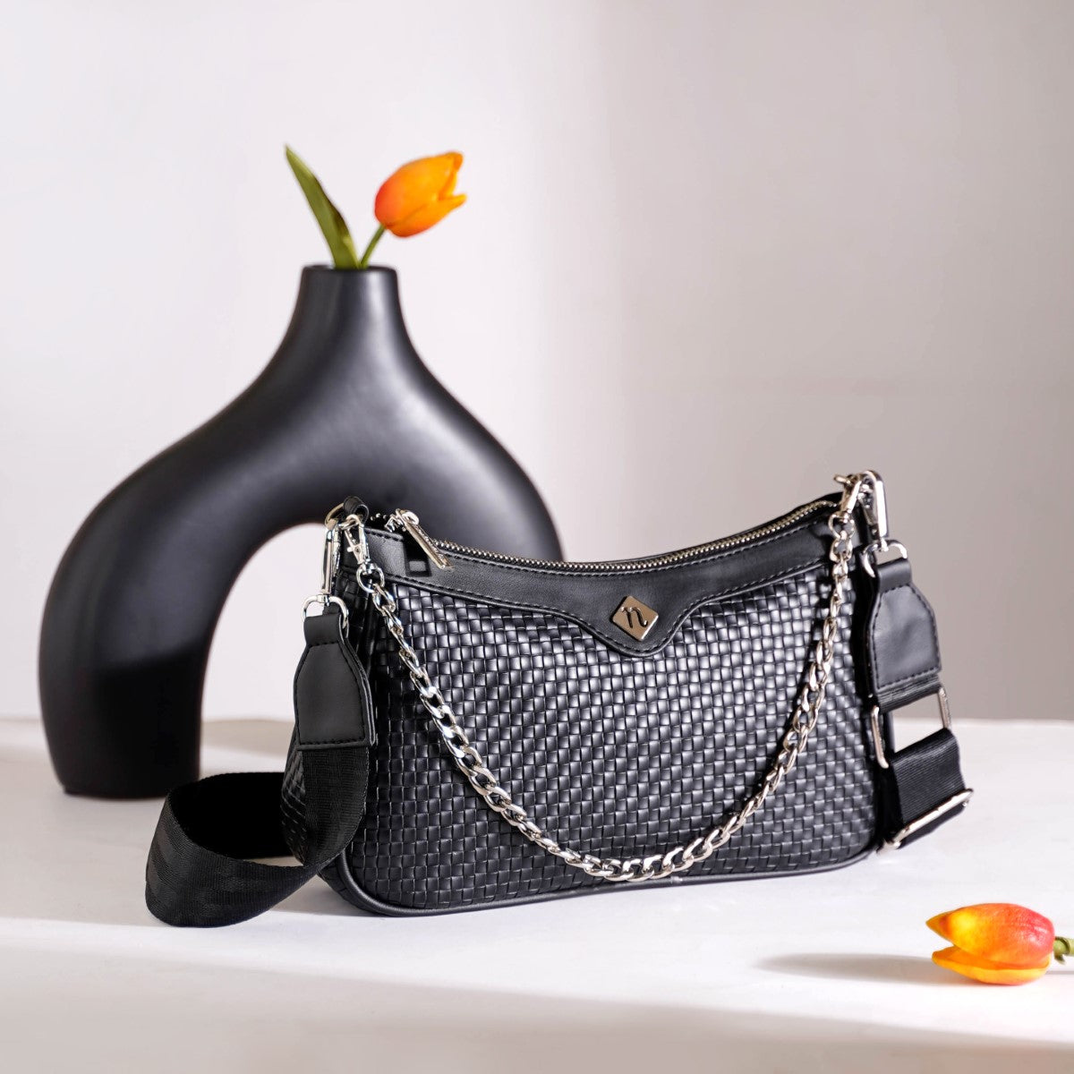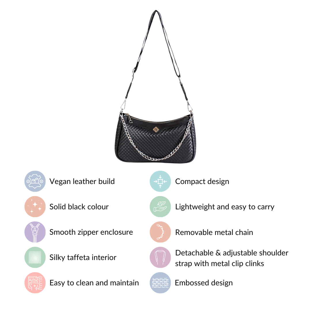 Certainly! The versatile shoulder bag is suitable for casual outings and formal occasions alike. The sleek metal chain combined with the solid black colour and geometric embossed designs makes the bag a standout accessory to complement any outfit and occasion.