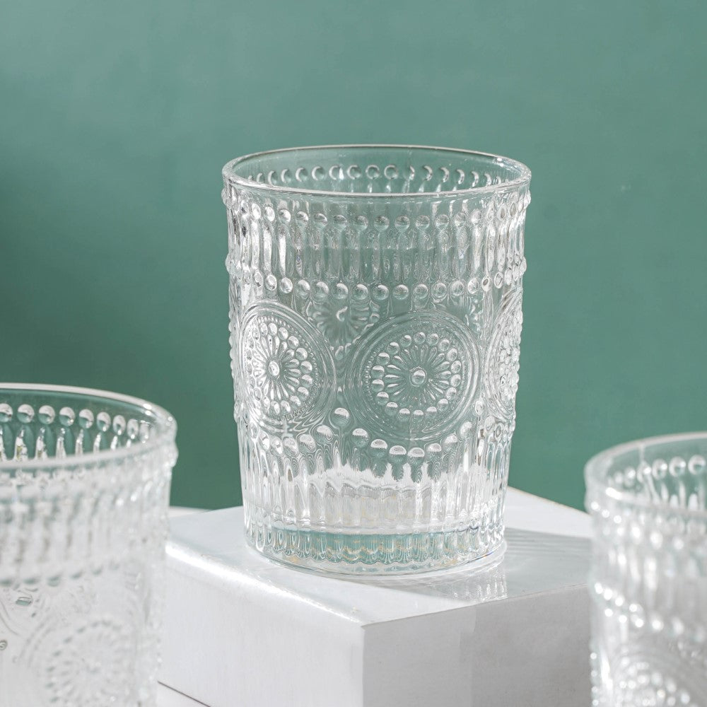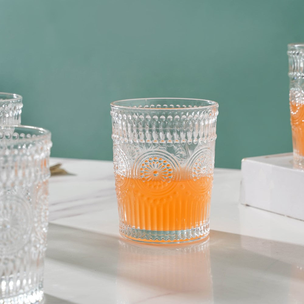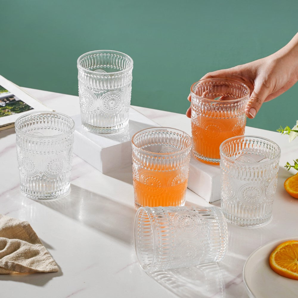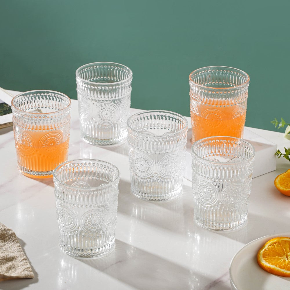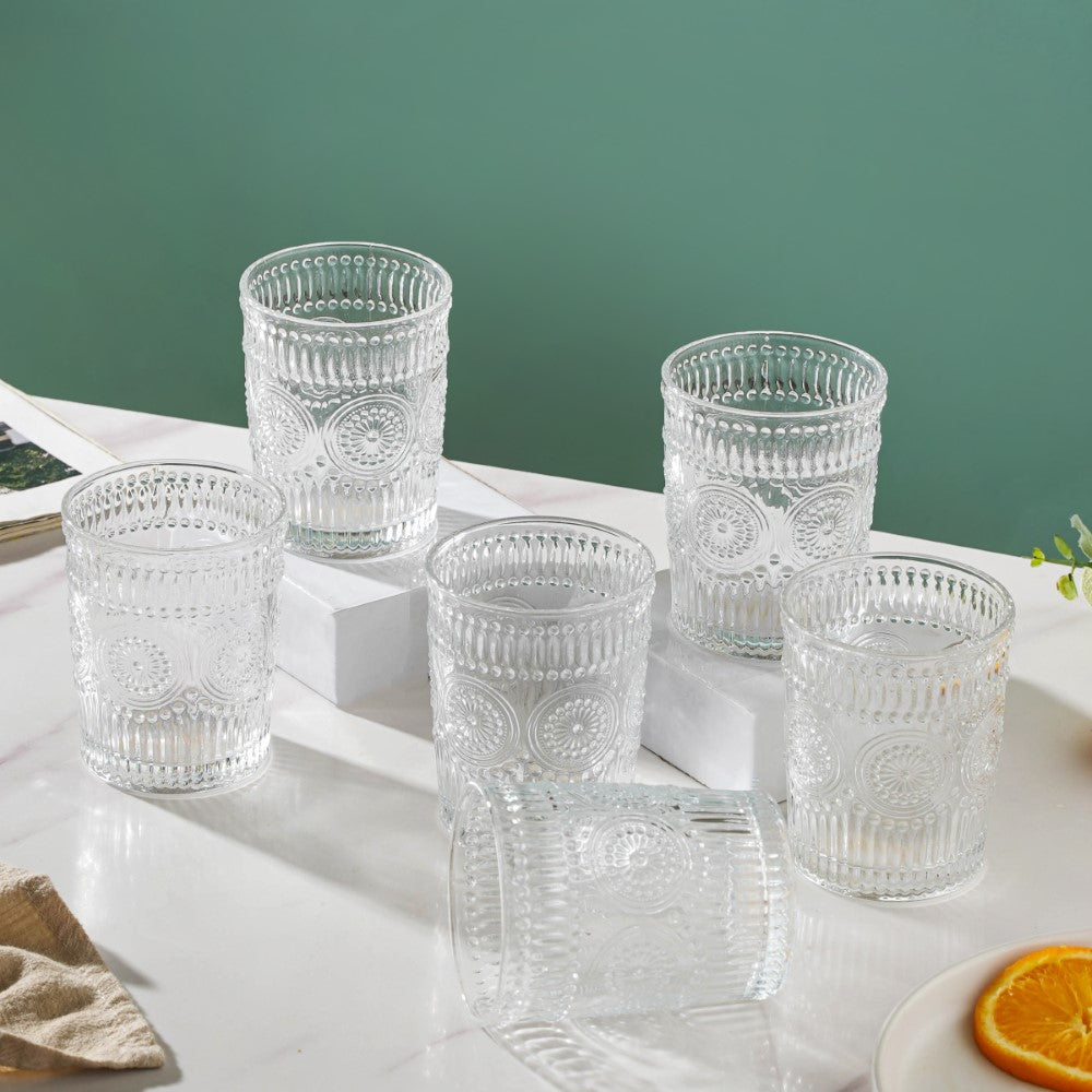 Indulge in timeless elegance with our set of 6 tall drinking glasses. Crafted with meticulous attention to detail, each glass showcases a mesmerizing hammered embossed texture that exudes sophistication and adds a touch of vintage charm to your table setting. With their tall and slender silhouette, these glasses offer a generous capacity, perfect for savouring your favourite beverages in style. Whether it's a refreshing glass of iced tea on a sunny afternoon or a classic cocktail at your next soirée, these glasses elevate every sip. Experience the perfect blend of exquisite craftsmanship and vintage design with our exceptional glassware collection.