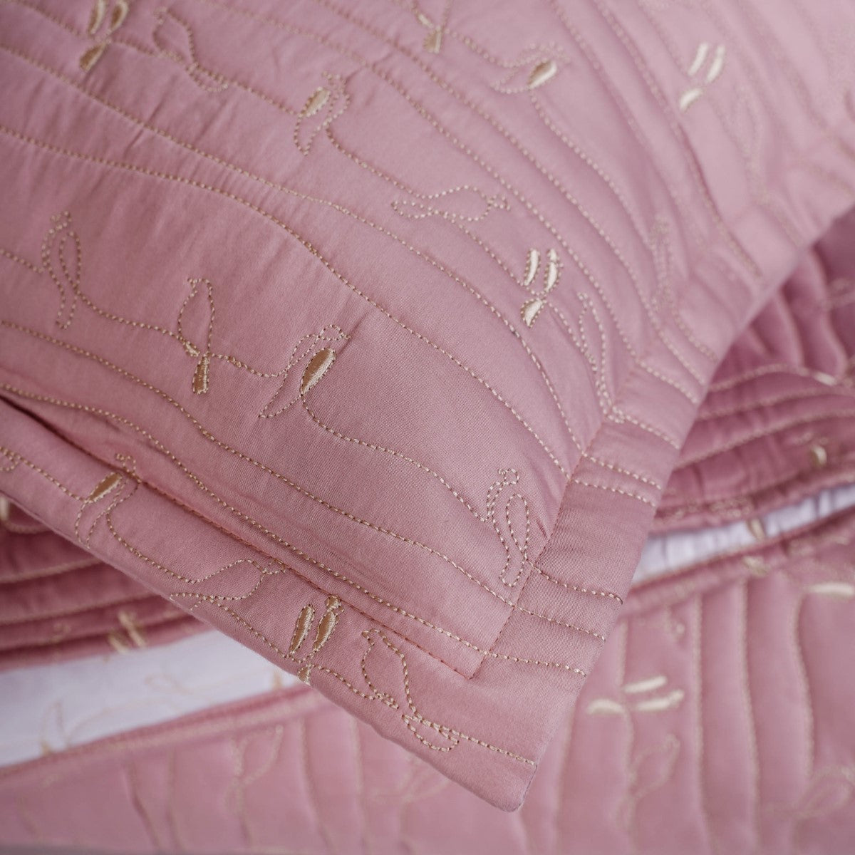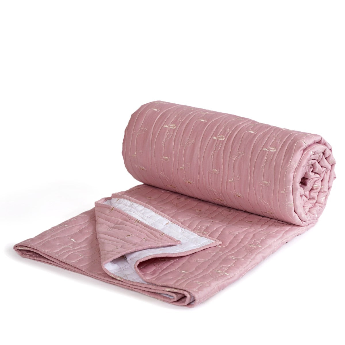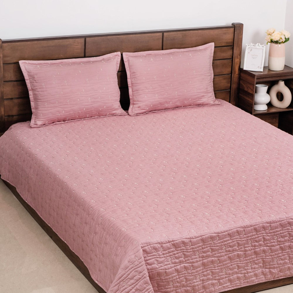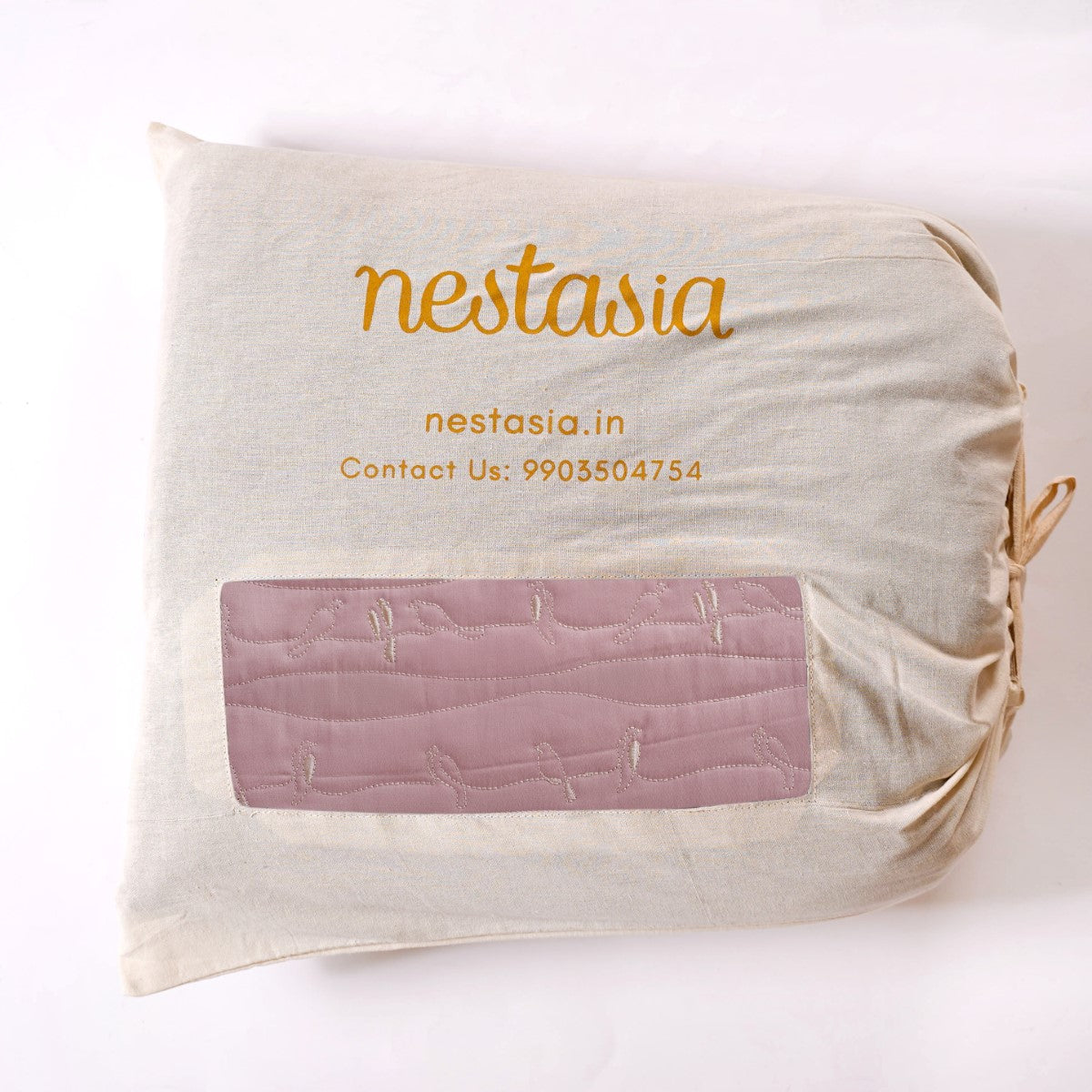 Bring an element of luxuriousness and comfort to your bedroom with the set of 1 king-sized bed cover and 2 pillowcases. The subtle pink hue of the bed cover and pillow cover is soft and sophisticated, making it the perfect addition to any bedroom decor. Crafted from premium quality 100% cotton, our bed cover features intricate embroidered detailing of birds that add a charming and timeless appeal. With a thread count of 300, the cover is smooth to the touch and provides a comfortable sleeping experience. The bed cover features a polycotton backing fabric and interlining of 80 GSM poly fibre sheet, making it durable and long-lasting. The skin-friendly fabric ensures that you get a good night's sleep without any irritation or discomfort. Expertly crafted by skilled artisans, our bed cover is not only visually appealing but also highly functional. The king-sized bed cover and 2 pillow covers, allow you to create a cohesive look for your bedroom.