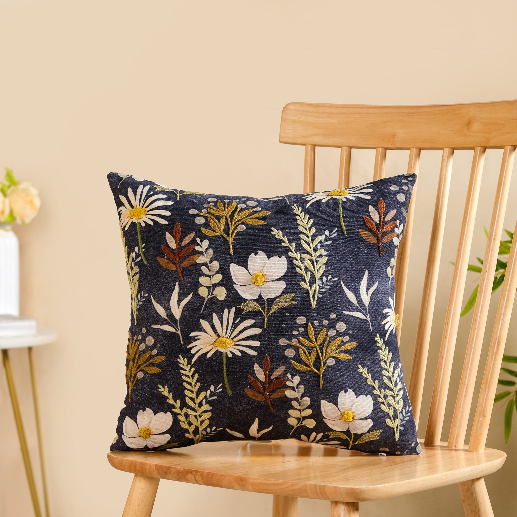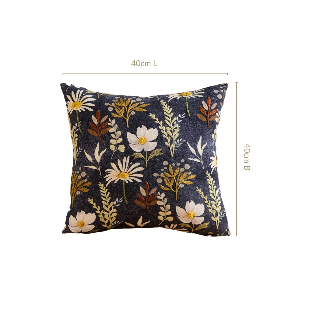 Design: Made from pure cotton slub material, this cushion cover showcases a rich, midnight blue base adorned with beautifully printed and embroidered floral motifs. The design features an array of blossoms, sprigs, and leafy accents in tones of cream, beige, mustard yellow, and deep brown, creating a striking contrast against the darker backdrop. The uneven texture of the slub fabric, along with the embroidery, brings depth and tactile detail. Perfectly balanced, it exudes a warm, nature-inspired charm suited for both modern and traditional settings.