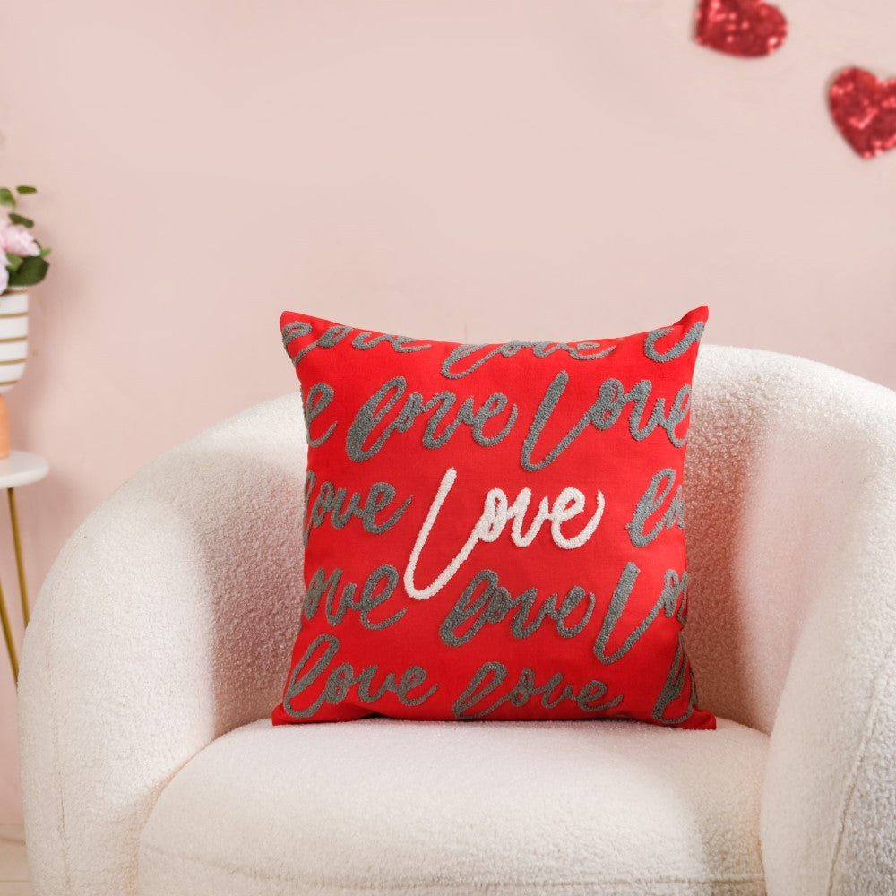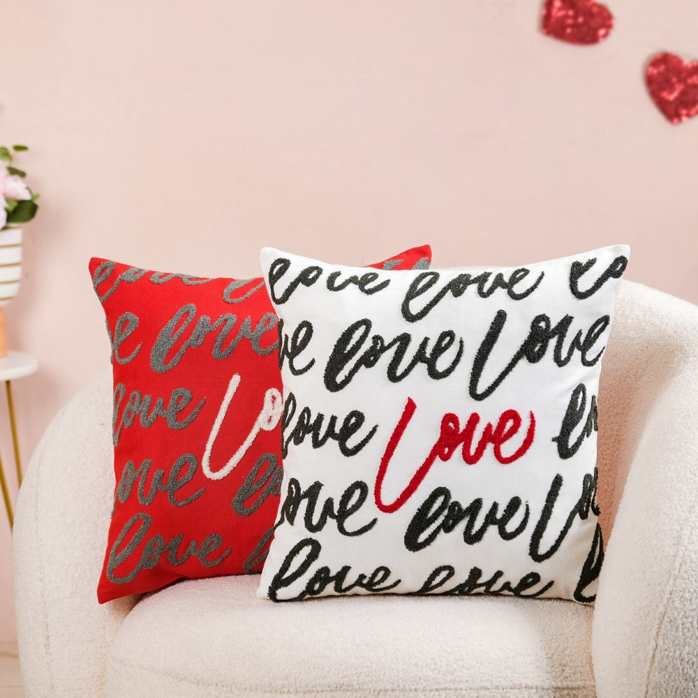No, the 'love' embroidery is only visible on one side of the cushion covers. The reverse side of the cushion covers is plain without any embroidery, allowing you to choose the desired look when arranging them on your furniture.