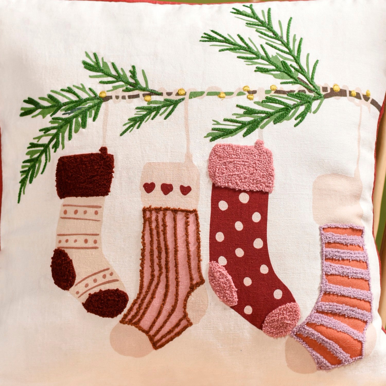 Design: Crafted from premium cotton slub, this cushion cover showcases four embroidered stockings hanging gracefully from a detailed tree branch. Each stocking sports a unique pattern, from playful polka dots to tufted embroidery stripes, creating a charming, handcrafted look. The soft, neutral base highlights the vibrant embroidery, while a smooth concealed zipper ensures a clean finish.