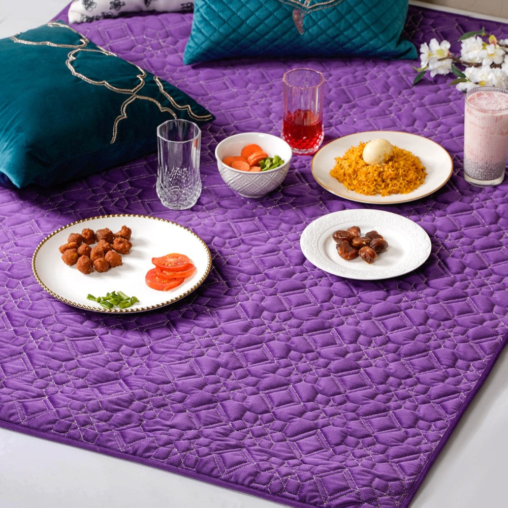 Make your festivities extra special and memorable with a fancy dinner table setup, featuring a traditional dastarkhwan. The table cover is expertly handcrafted from premium quality soft fabric material with a lustrous high-sheen finish. The handstitched golden zari work and the quilted geometric design add to the luxurious appeal of the dining tablecloth. You can use the dastarkhwan as a food mat to serve delicious food at a family feast to celebrate a festive occasion. The glamorous design and elegant finish of the tablecloth make it quite the showstopper in any fancy dinner table decor.