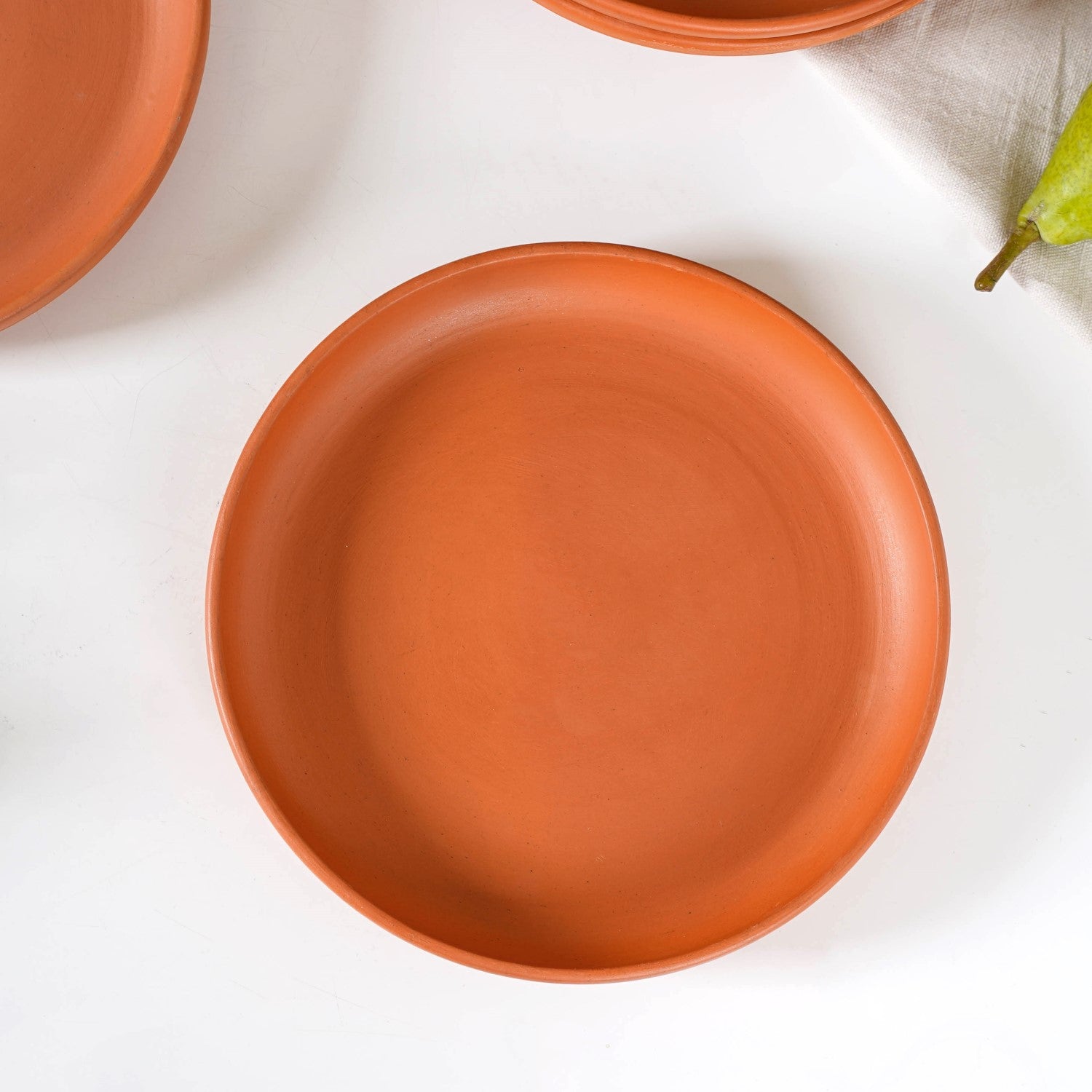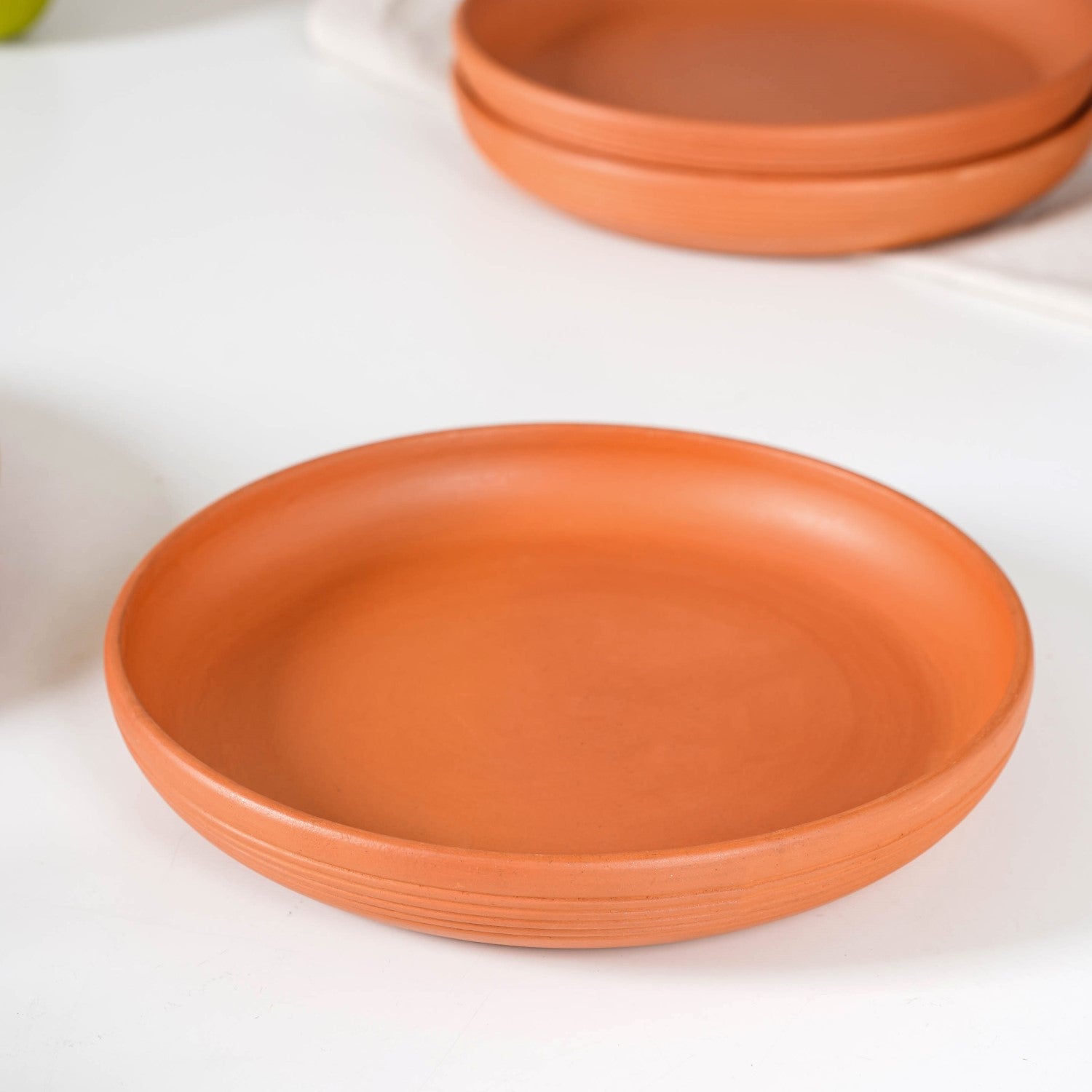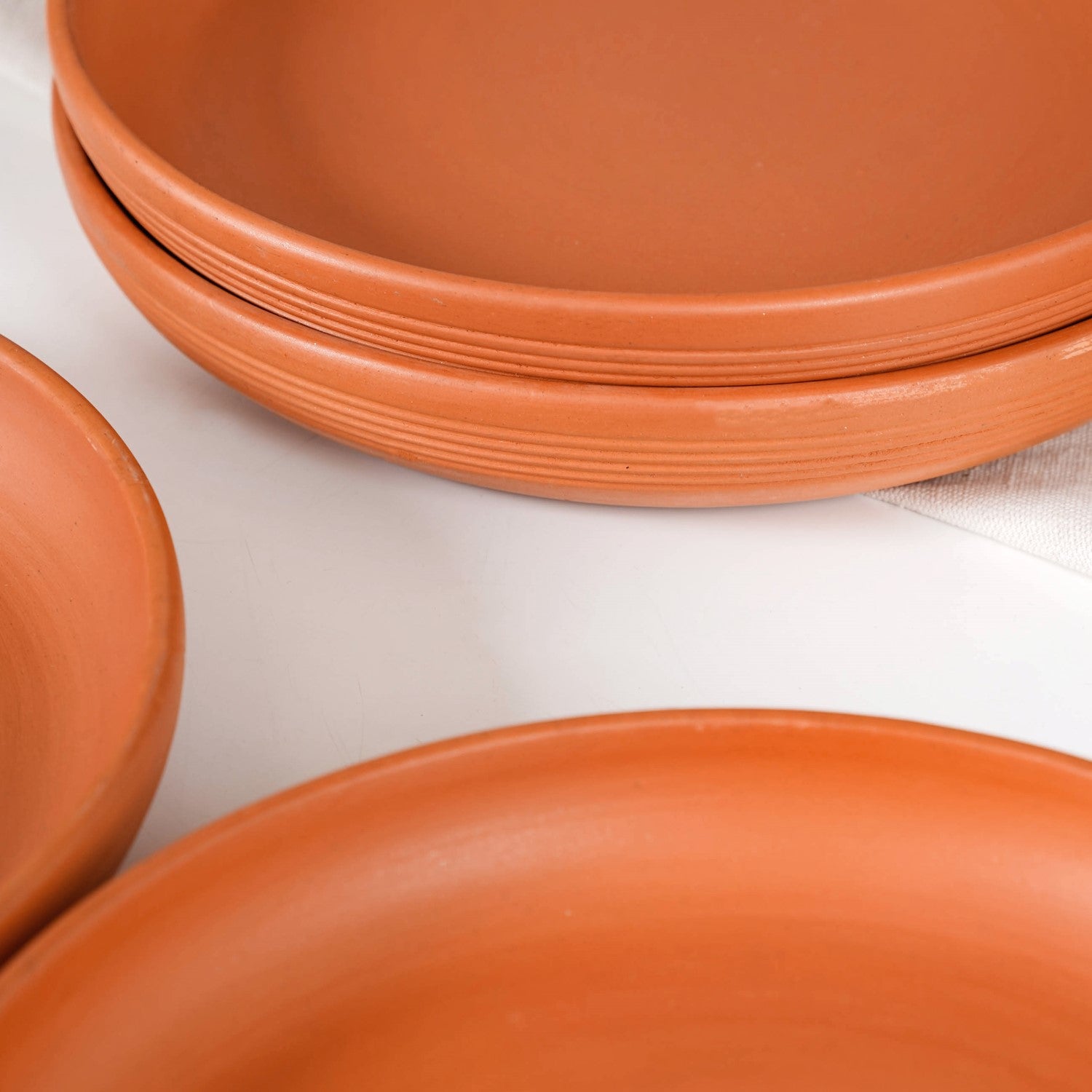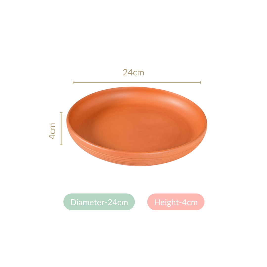 Benefits: Handcrafted from mineral-rich clay sourced straight from the banks of the river Ganga, these dinner plates offer many benefits. They are 100% sustainable and eco-friendly, so that's already a plus. The porous terracotta construction allows moisture and heat to circulate through the materials, retaining both for the contents served on the plates. This keeps your food juicy and tender while effectively maintaining heat for an extended period. Releasing natural minerals into the food, the dinner plates enhance your health. The alkaline properties of the clay neutralise the acid content in the food, thereby balancing its pH level. Completely natural, inert, and non-toxic, the non-glazed surface of the terracotta upholds the highest standards of food safety, ensuring a safe and delightful dining experience for you and your family. Finally, the delightful aroma lent to the food will completely transform your meals.