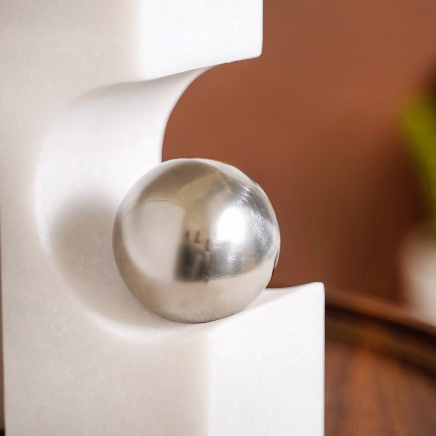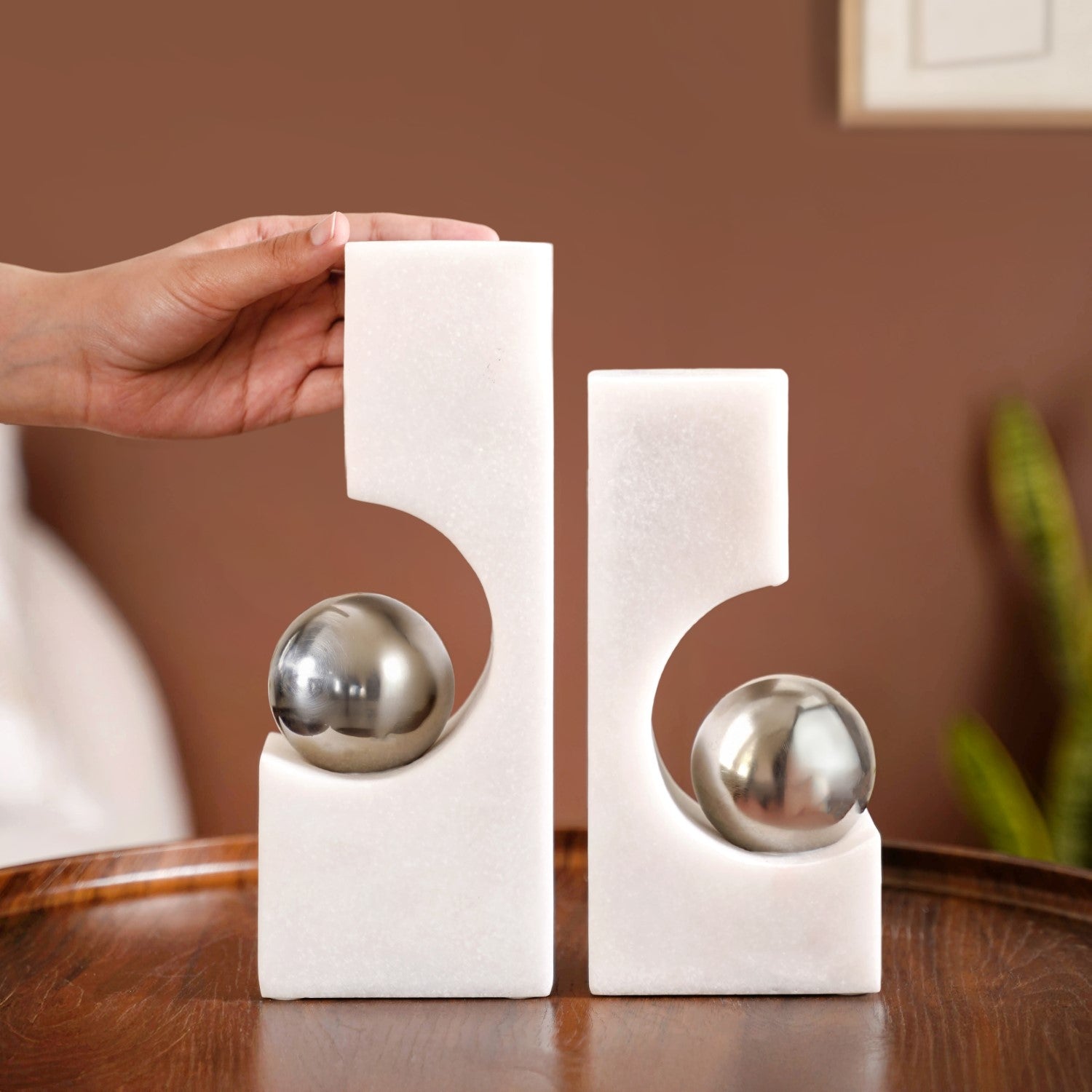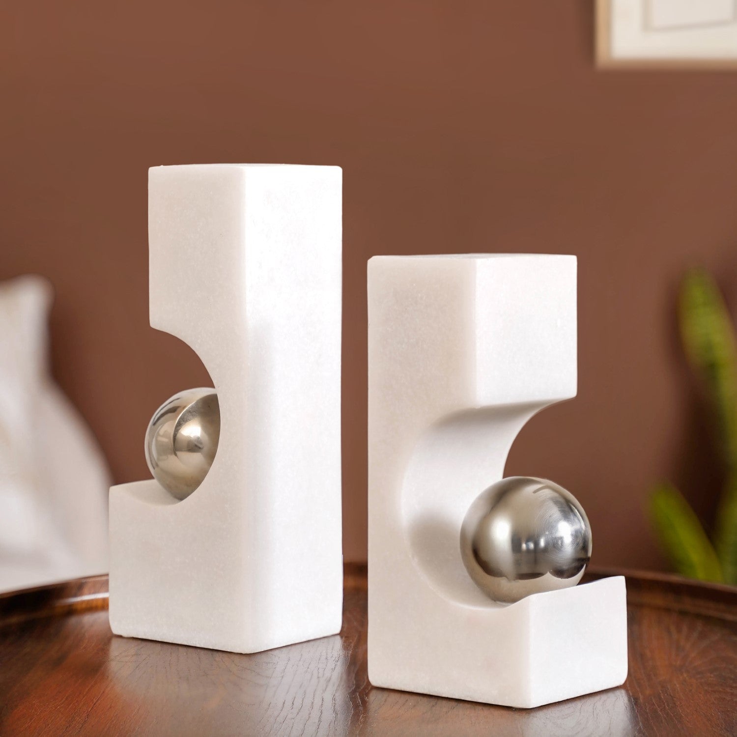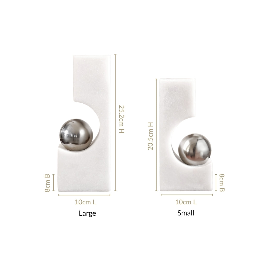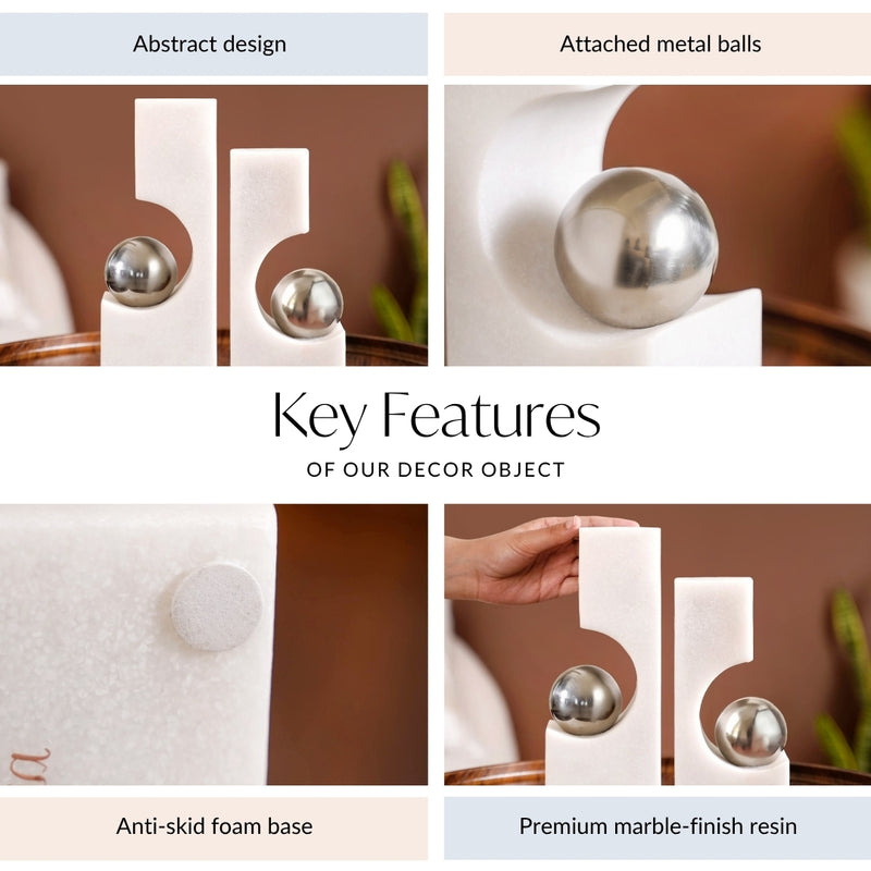 Design: Made from premium resin, this decor set features two sculptural pieces crafted from smooth white stone-like material, each designed with a hollowed curve that securely holds a gleaming metallic silver sphere. The contrast between the matte white block and the reflective polished ball creates a bold yet refined aesthetic. With clean, geometric lines and a sleek finish, the design evokes a sense of balance, symmetry, and sophistication, making it a true statement accessory.