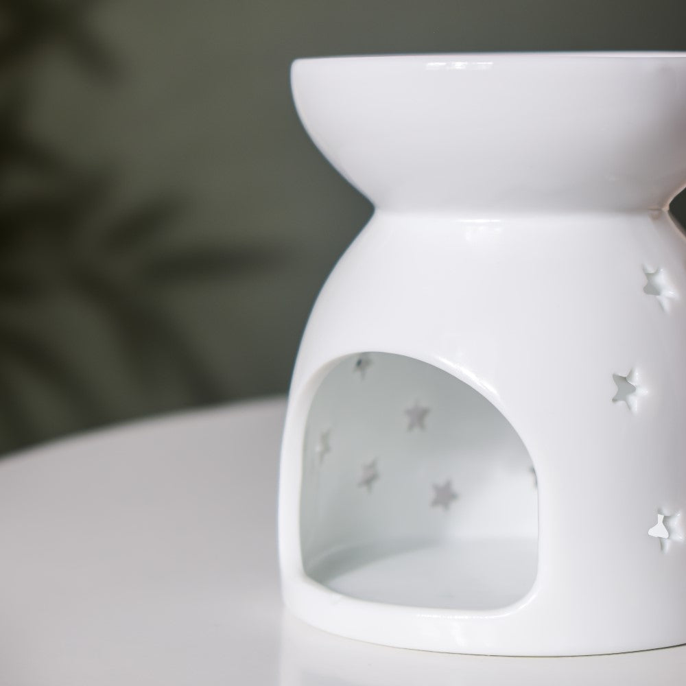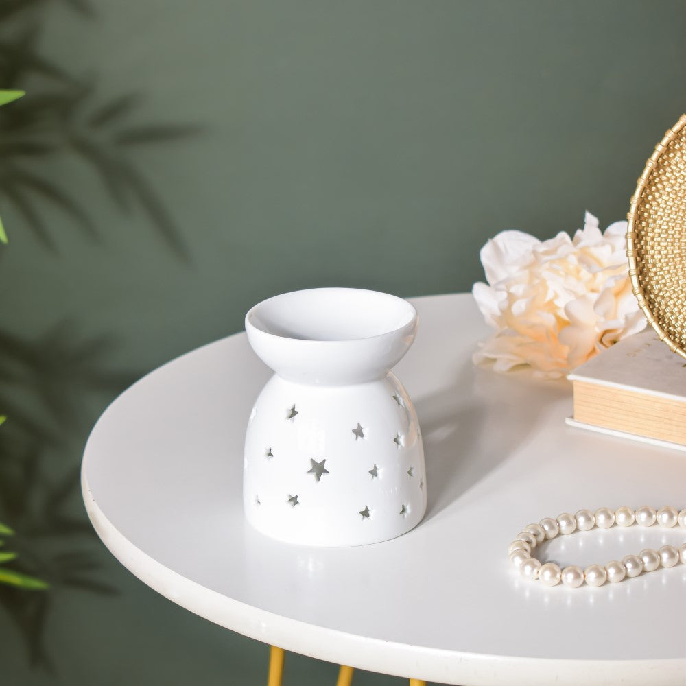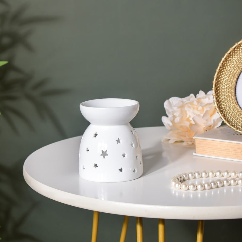 With the stylishly designed fragrance and light diffuser with a moon and stars cut-out pattern, one can instantly change the ambiance and aroma of the house. One may choose a diffuser that complements one's home's decor or the mood of the season. The high gloss finish and attractive design aesthetics are guaranteed to win one accolade from one's visitors. Handcrafted by regional craftsmen across the country, the diffuser's radiating and flickering light creates magnificent patterns on the walls adding to the charm of the festive season.