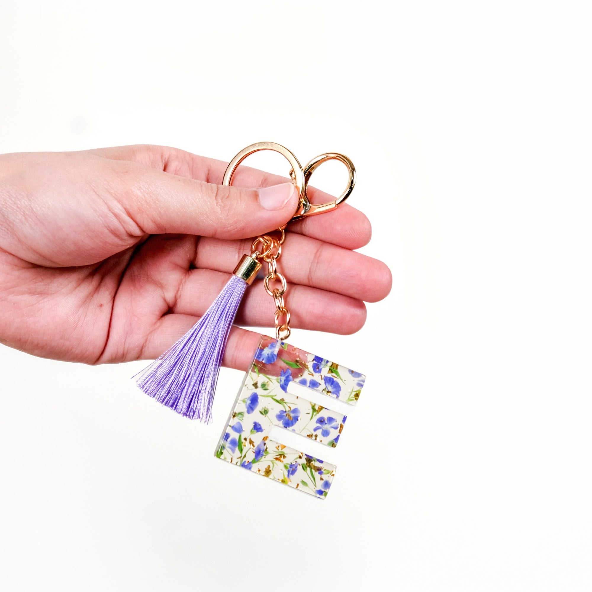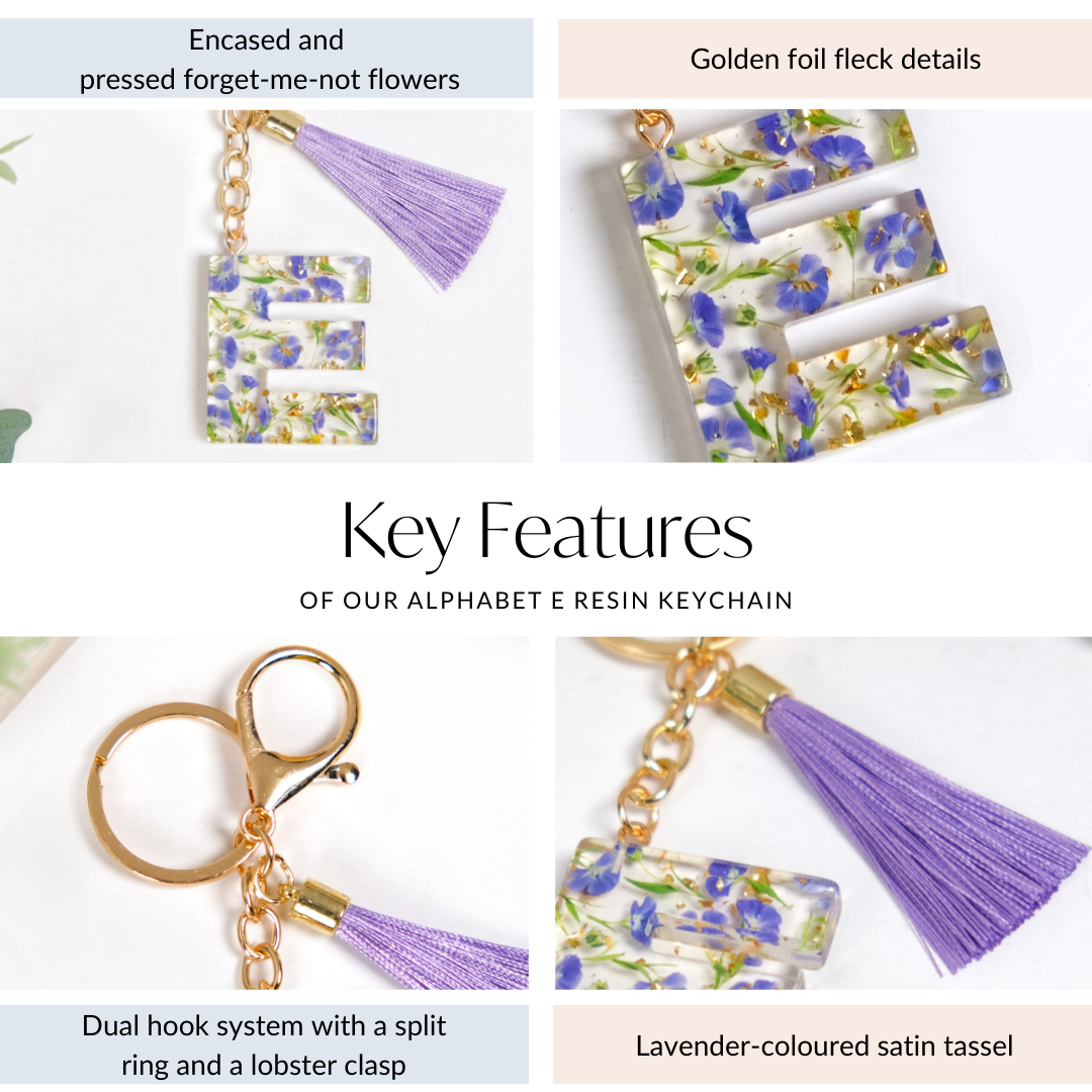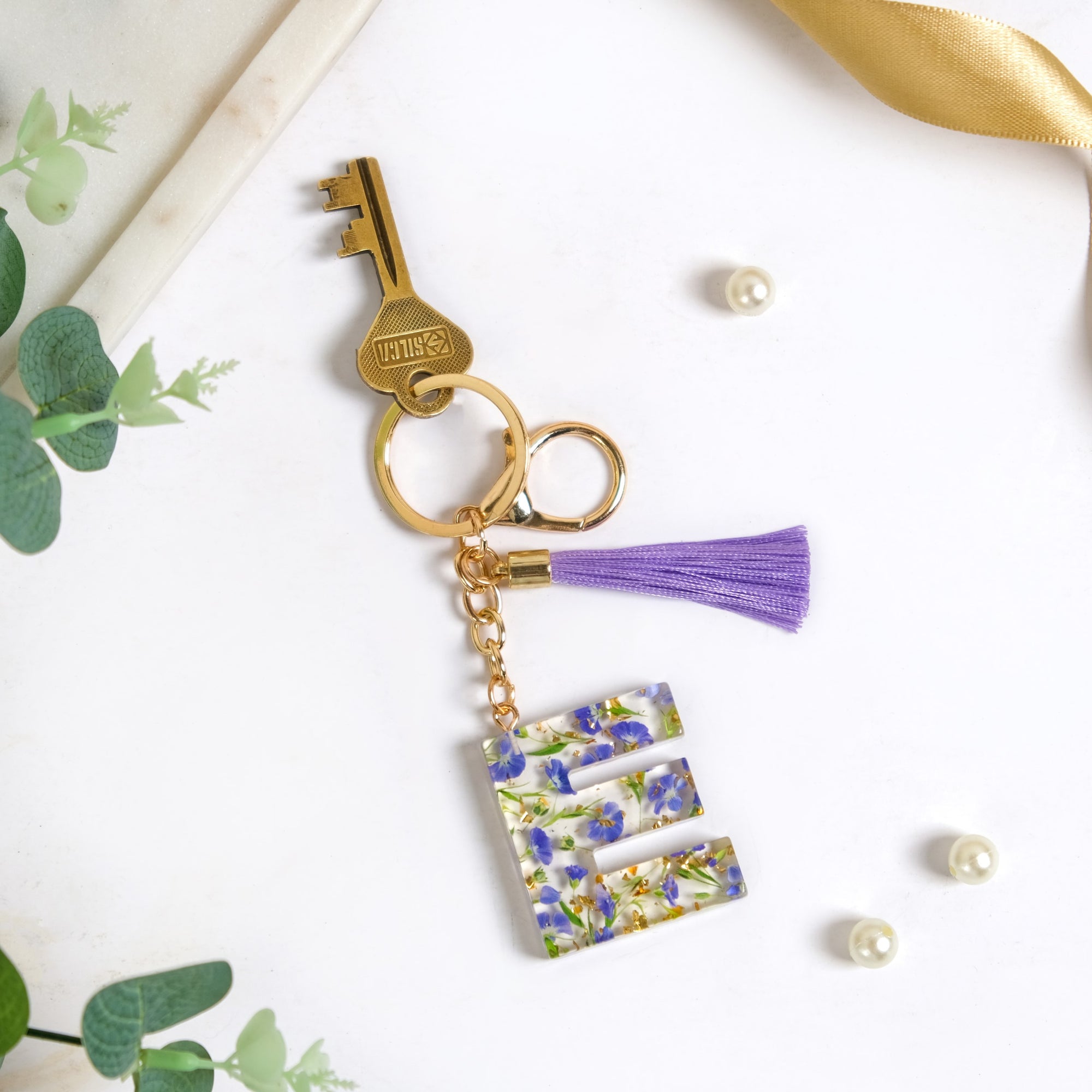The fancy "E" resin keyring combines elegance with functionality. Enclosed in a transparent resin base are pressed lavender forget-me-not flowers complemented by flecks of golden accents, which make this keychain simply irresistible!