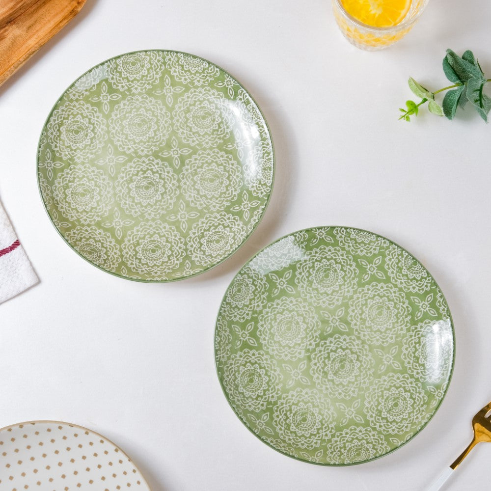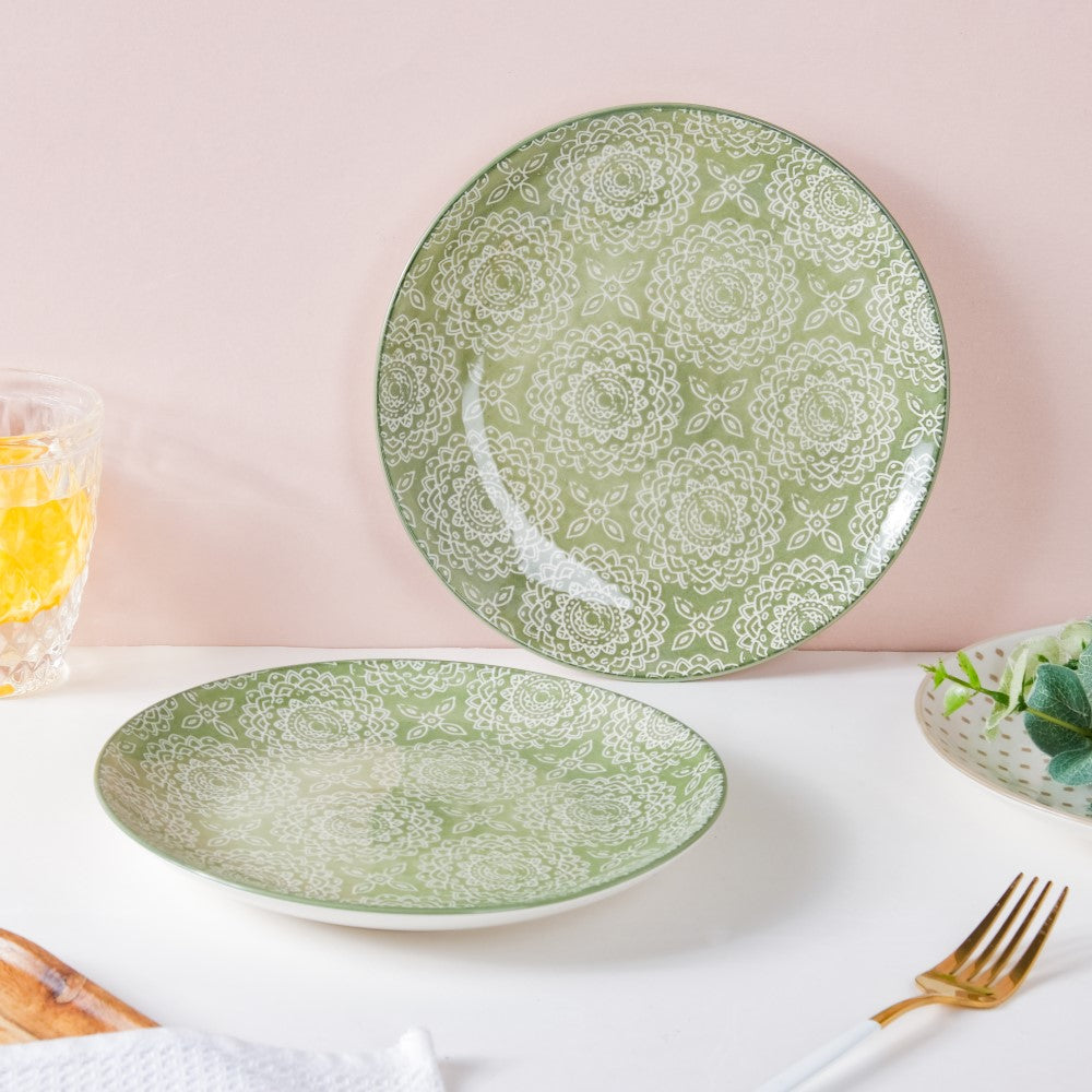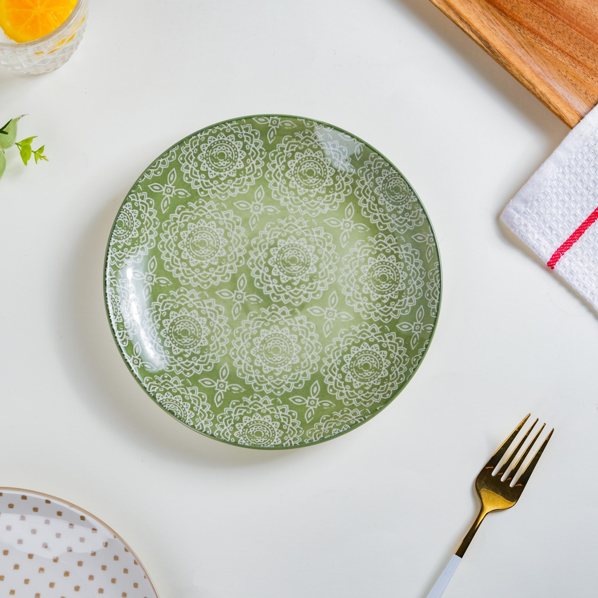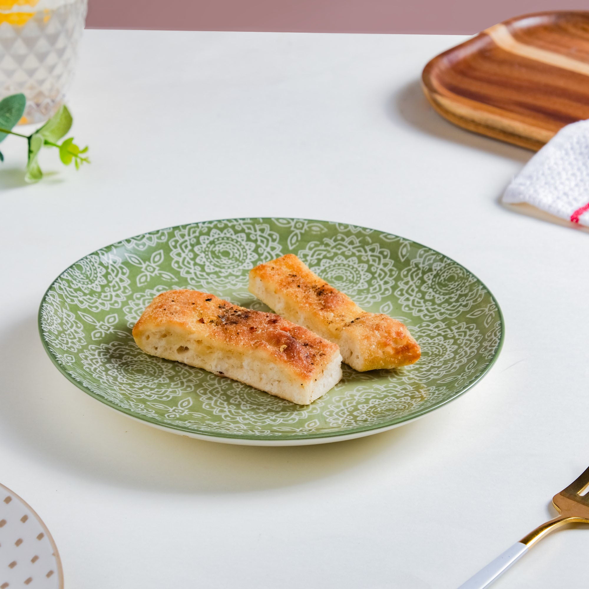 The sage green snack plate set features exquisite mandala-like patterns in white on its top surface, offering a unique traditional look, unlike ordinary small appetizers plates. The mandala-like design of the ceramic snack plate set makes it an ideal decorative item to set up a gorgeous snack table at a house party. The gorgeous design paired with the soothing sage green colour also makes the ceramic appetizer plate set a suitable gift for anniversaries, housewarmings, and any festive occasion.