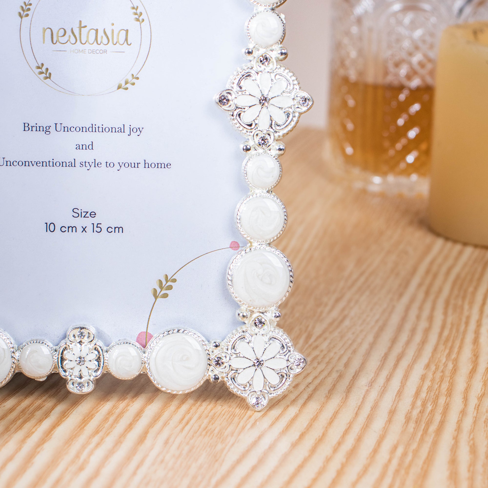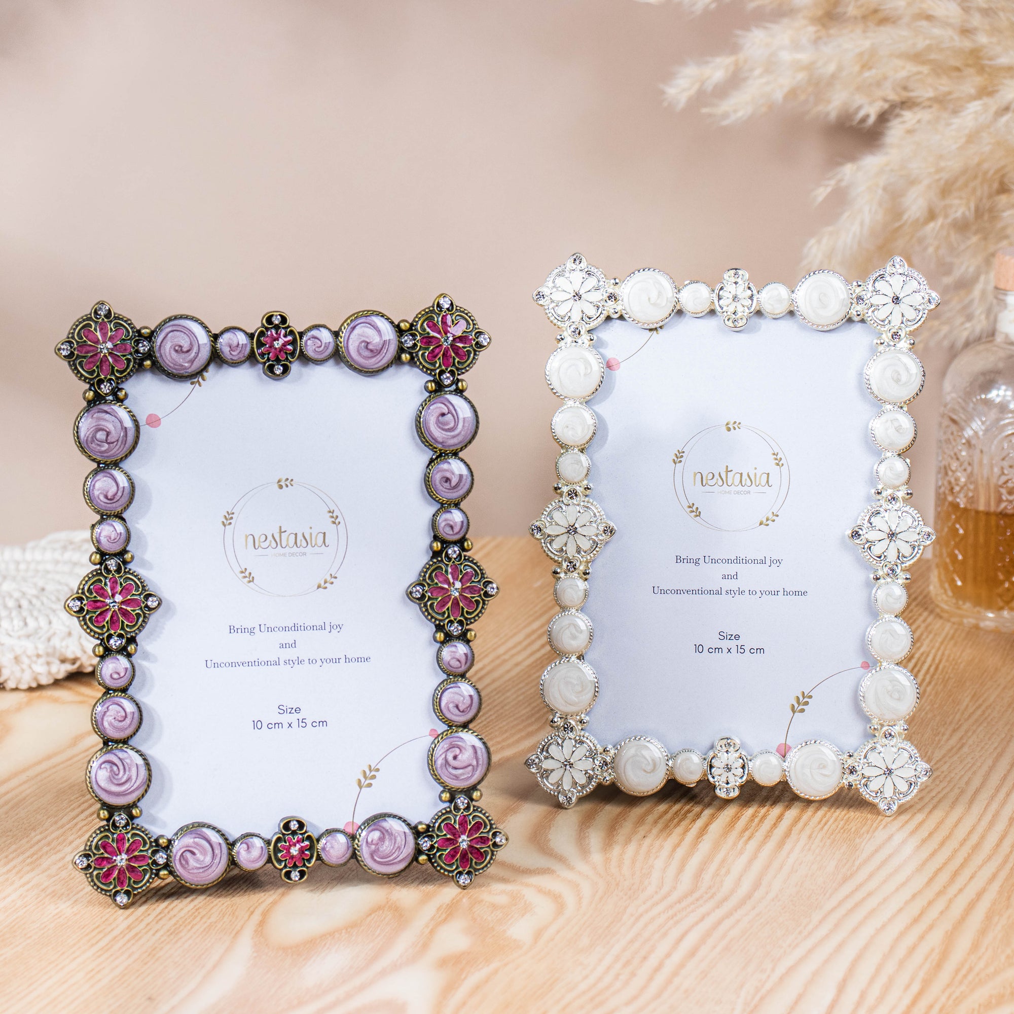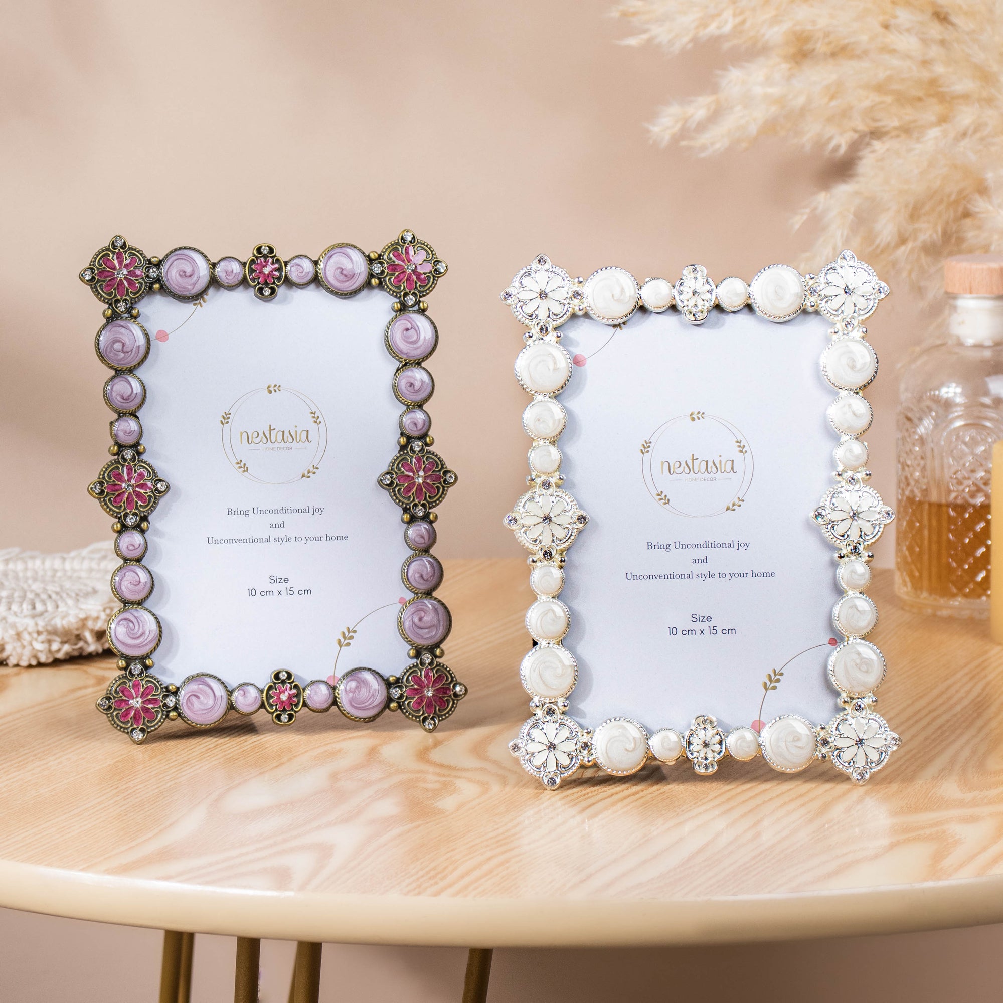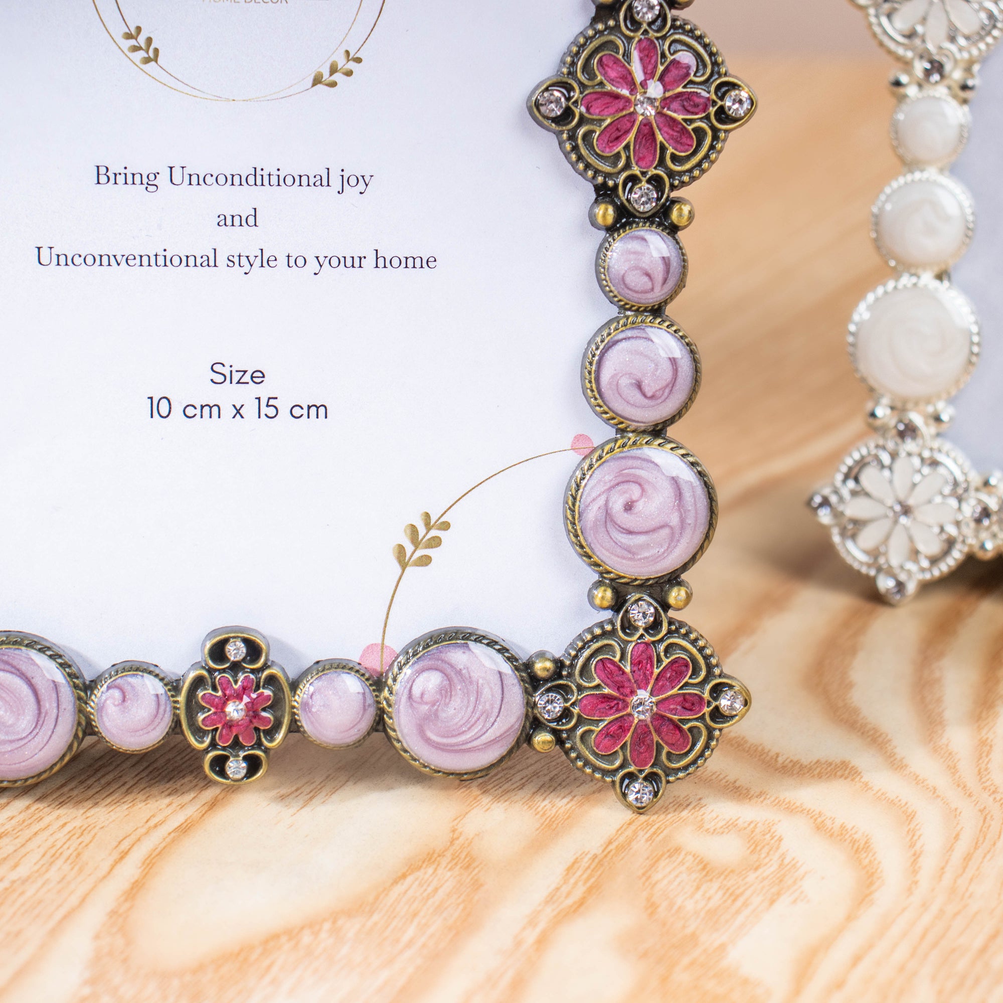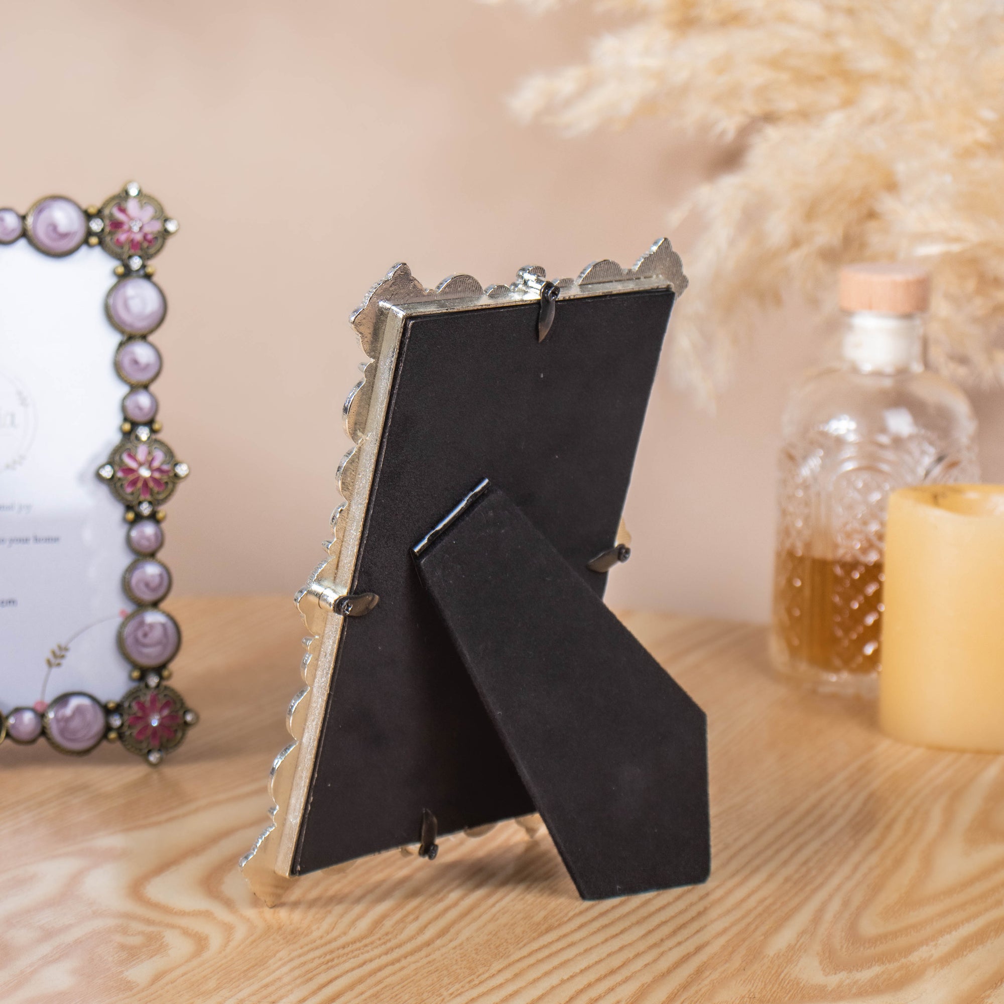 The classic photo frame comes with a broad-edged border on four sides. Each has floral motifs at the extreme corner and the mid-length. Plus, elegant pearl beads adorn the edges further, adding an element of intricate fashion to the photo frame. Adequately sized, the photo case can work as an accent piece at home or office.