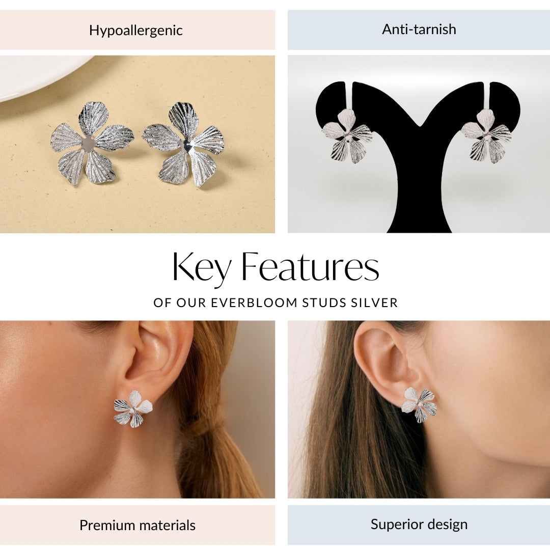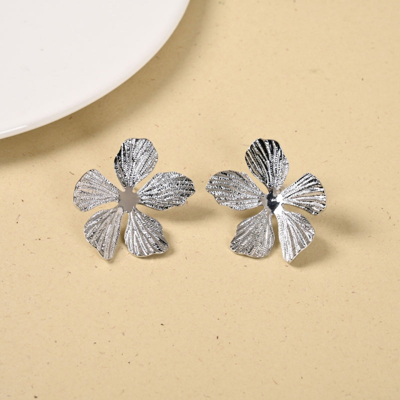 Radiating effortless elegance, these statement stud earrings capture the delicate beauty of the periwinkle flower in a luminous silver-tone finish. A symbol of grace and serenity, the periwinkle’s soft, unfurling petals are reimagined with intricate detailing, bringing depth and texture to the design. The subtle curves and refined craftsmanship lend a natural fluidity, making each petal appear as though gently swayed by the breeze. Delicate yet striking, this pair is a timeless ode to nature’s quiet sophistication.