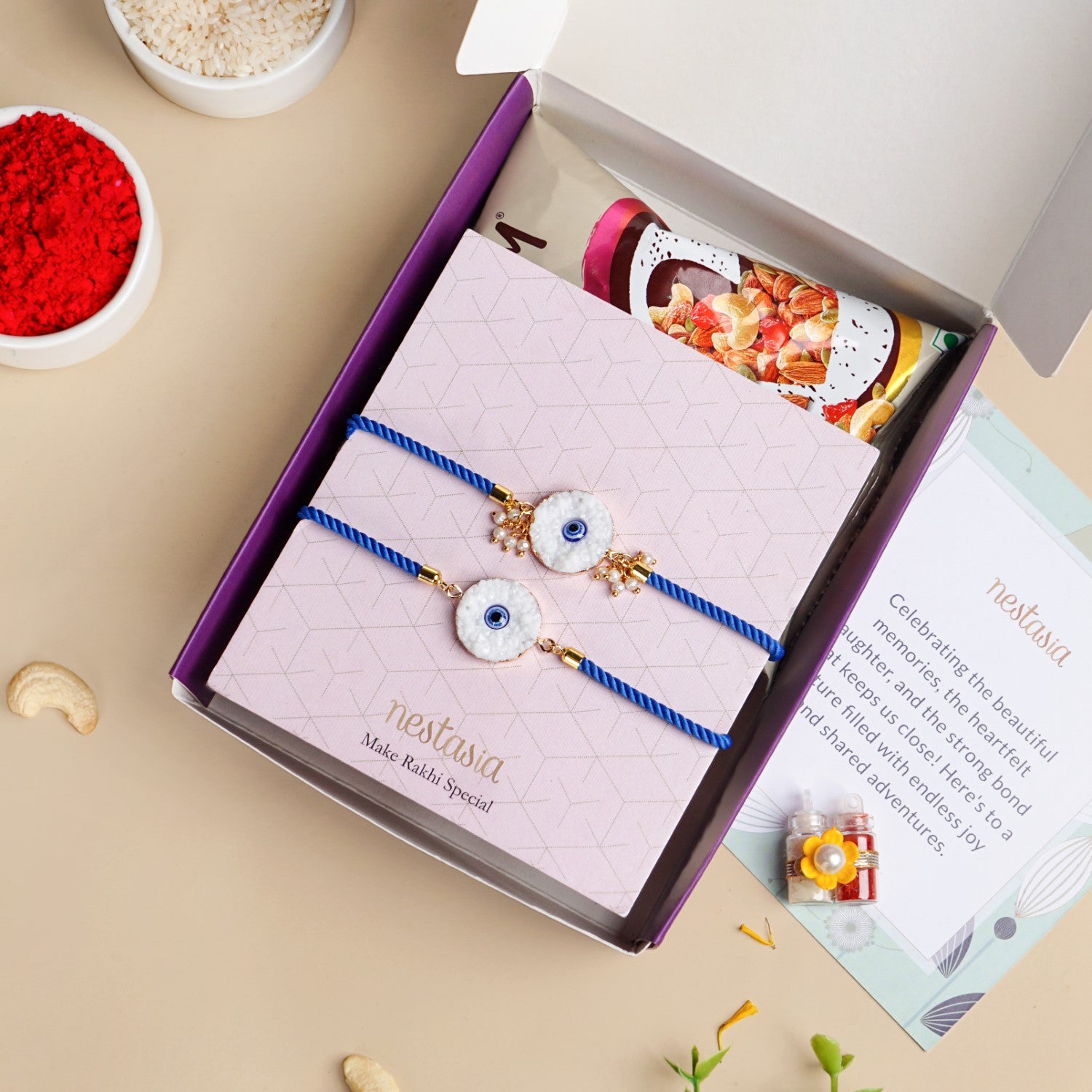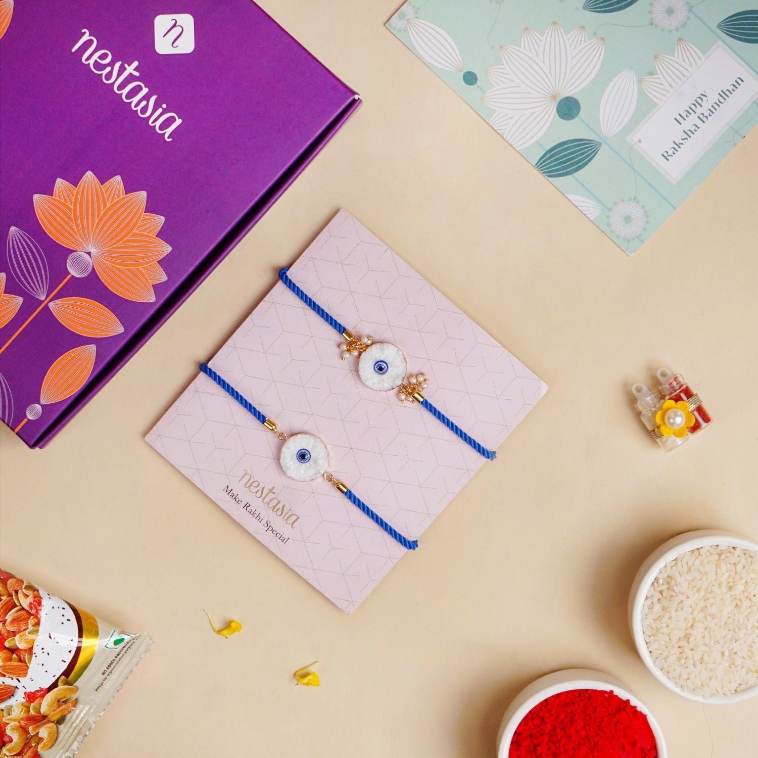 Celebrate the sacred bond of protection and love with this exquisitely crafted evil eye rakhi bracelet set. At the heart of the adjustable rakhi and bracelet lie textured white discs, reminiscent of marble-like crushed stone, featuring a striking blue evil eye motif. The set is truly a timeless symbol for safeguarding against negative energy and ill will. It is beautifully complemented by a rich royal blue braided thread, offering a vivid contrast that enhances its visual appeal. Accents of gleaming gold-toned metal caps and delicate embellishments, including tiny charms and faux pearls, add a refined touch of opulence.