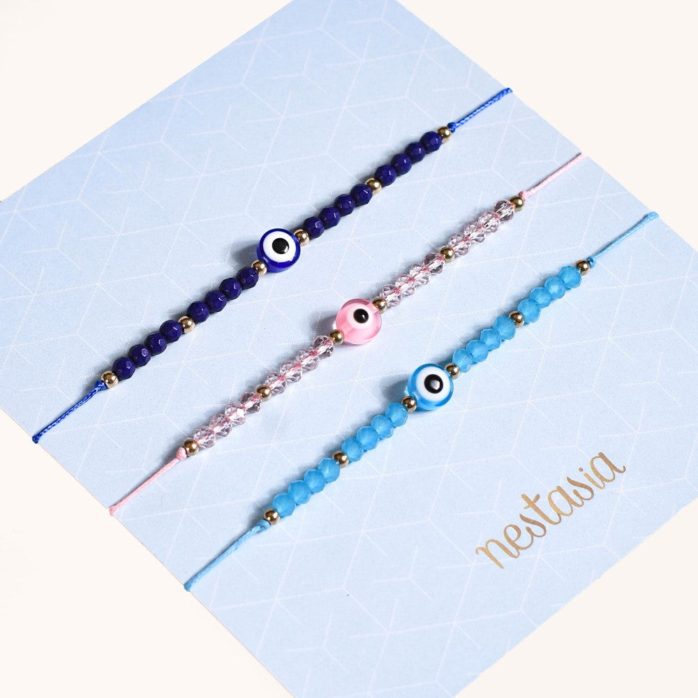 Protect your energy in style with our set of 3 Evil Eye bracelets! Combining a fresh, vibrant design with rich ancient symbolism, these simple bracelets are featured in 3 colourful shades - light pink, navy blue, and sky blue. Each bracelet boasts an arrangement of glossy colour-matched and golden beads with a sacred Evil Eye charm at the centre. These auspicious bracelets are believed to ward off all that's evil, uplift spirit, and bring in all the good vibes, making the set a sentimental gift for your near and dear ones as well. Whether you snag these charm bracelets for yourself or someone special in your life, these bracelets serve as stylish accessories that are perfect for nailing every look.