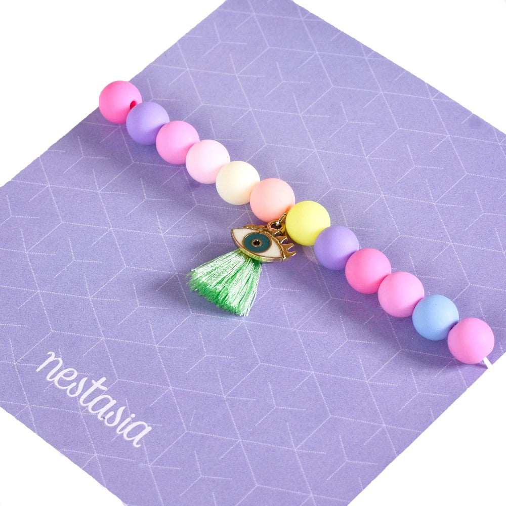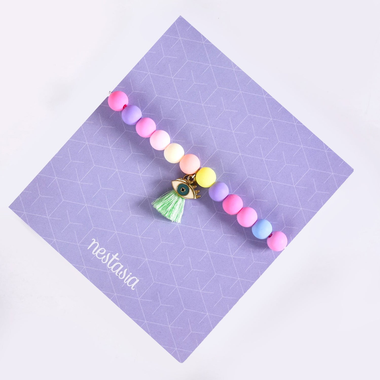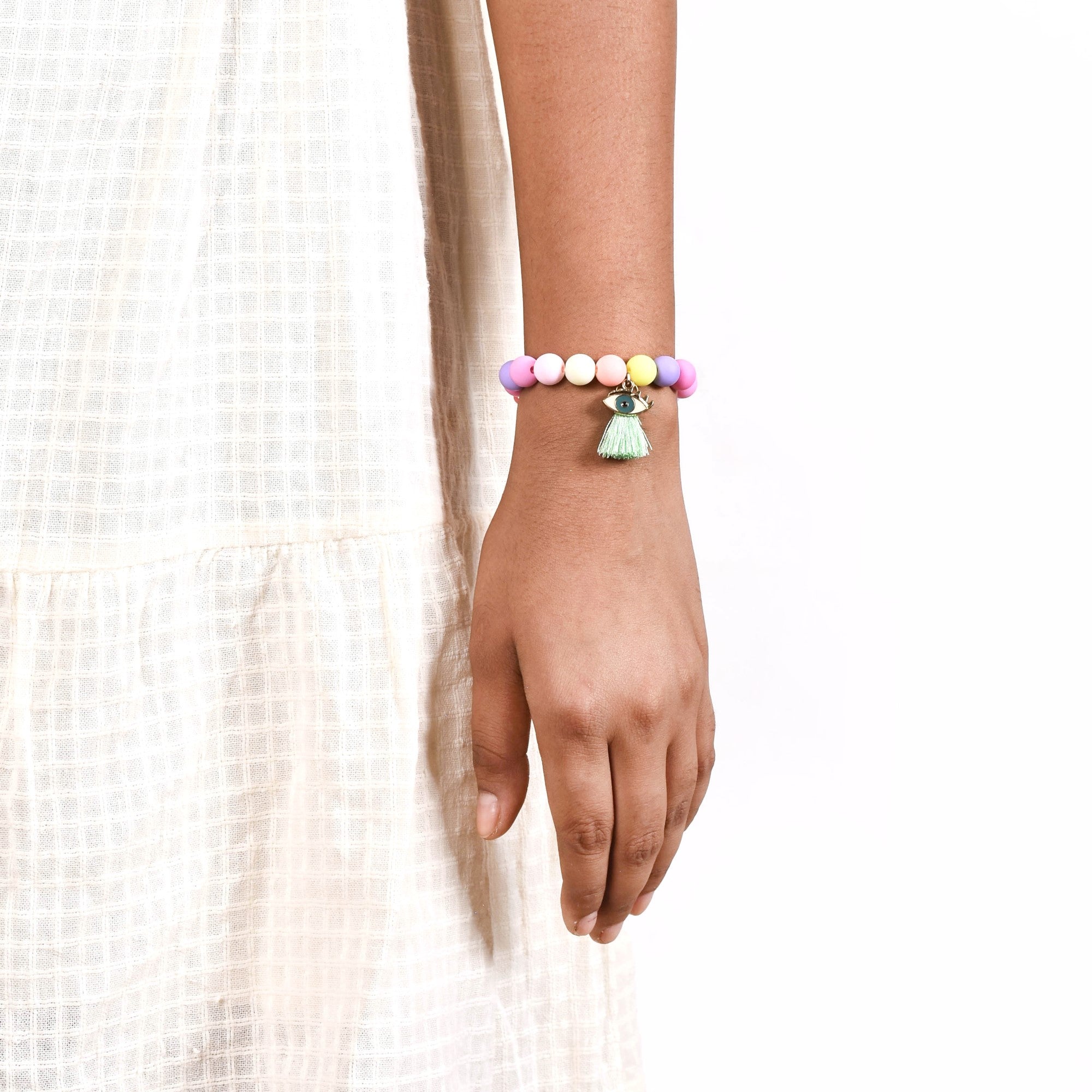 Embrace a playful and protective touch to the wrist with our whimsical Evil Eye bracelet. Blending ancient symbolism and a fresh, modern 2000s-inspired look, the stretchy bracelet features a line-up of vibrant multi-coloured beads. Highlighting an Evil Eye charm with gold accents and a small tassel, the bracelet wards off evil and brings positive energy. Steeped in centuries-old symbolism across cultures, the amulet is believed to protect one against a malicious glare, making this bracelet a meaningful gift for loved ones.