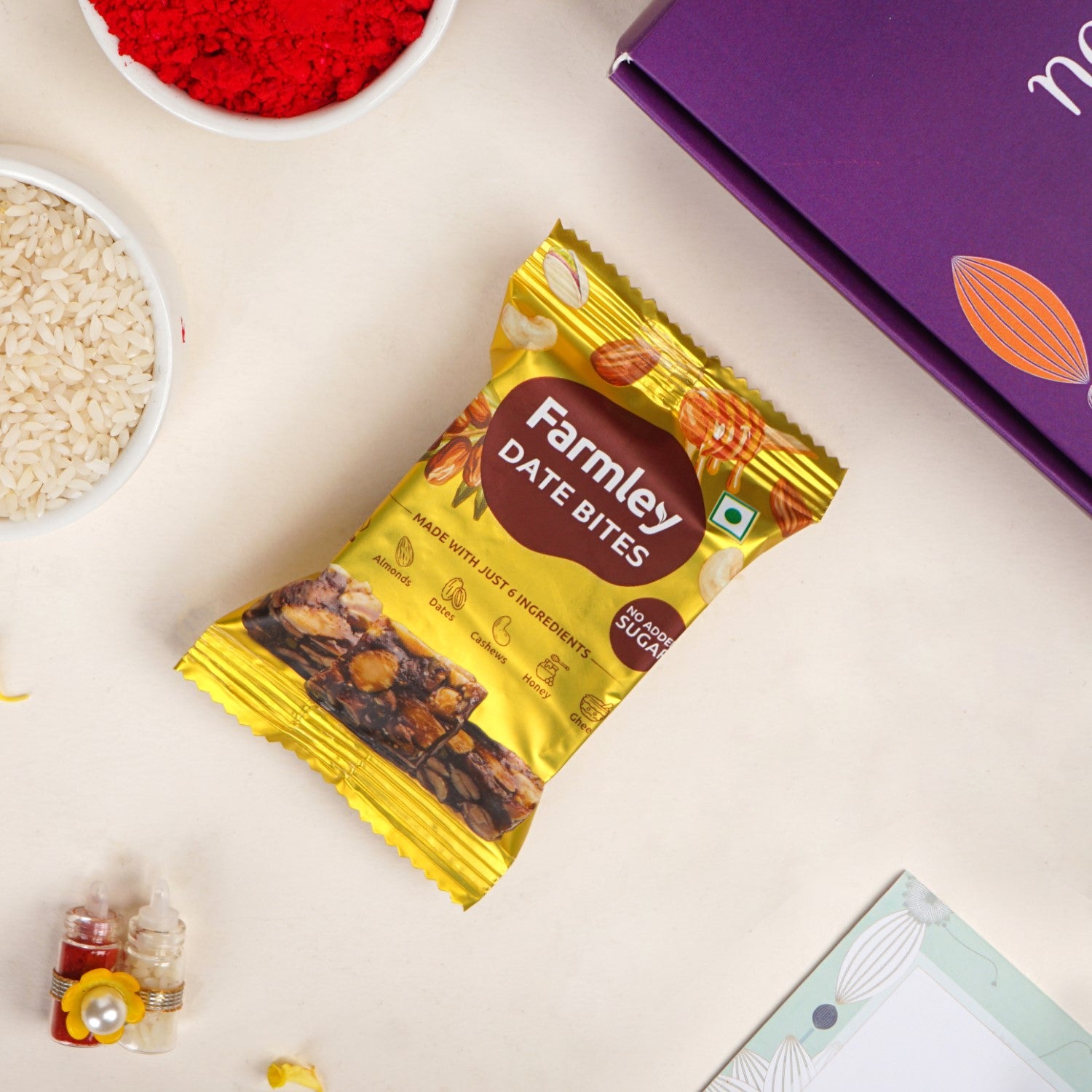 The hamper also includes a traditional roli-chawal bottle set, 1 dry fruits packet, a stylish keepsake box, and a heartfelt message card to make your wishes even more special.