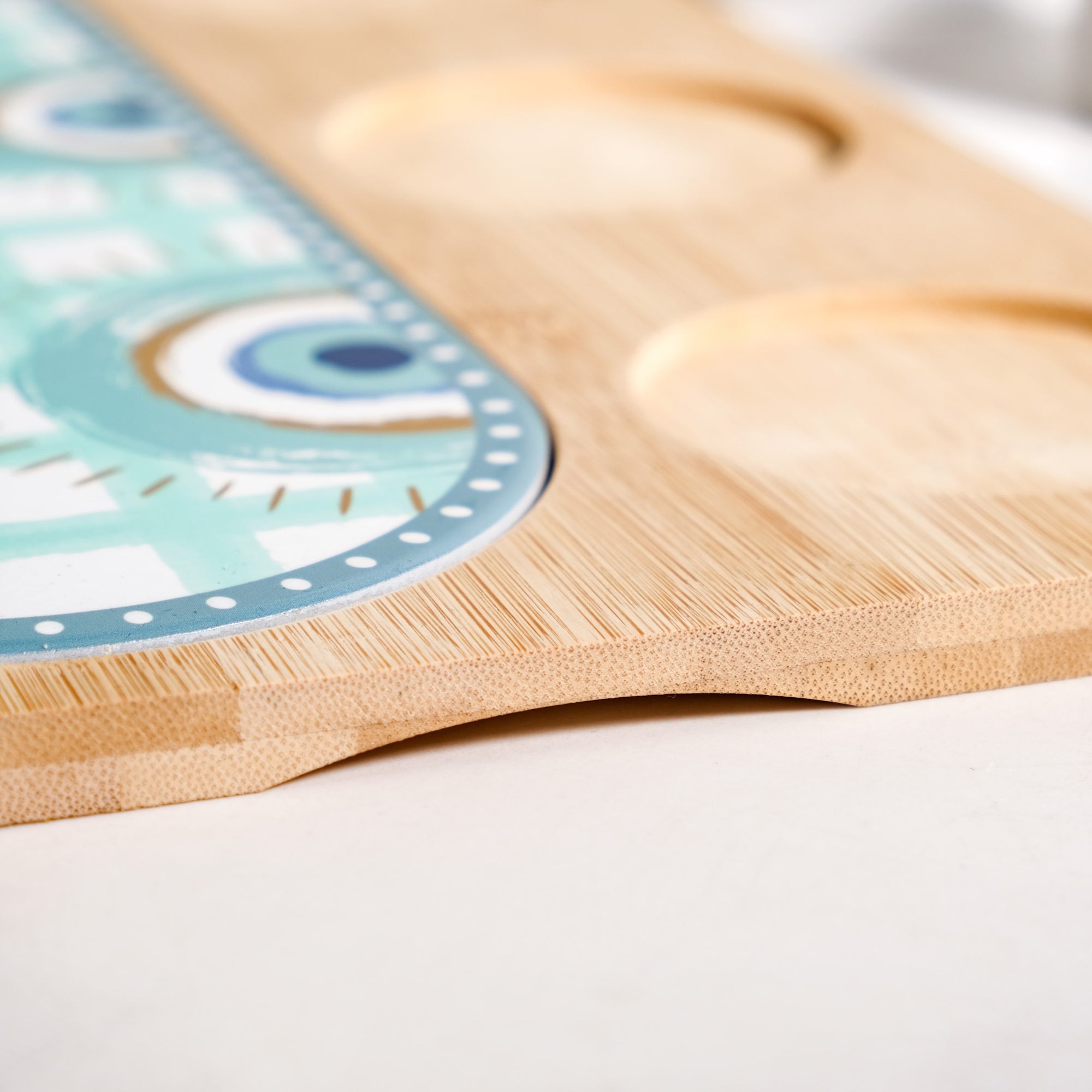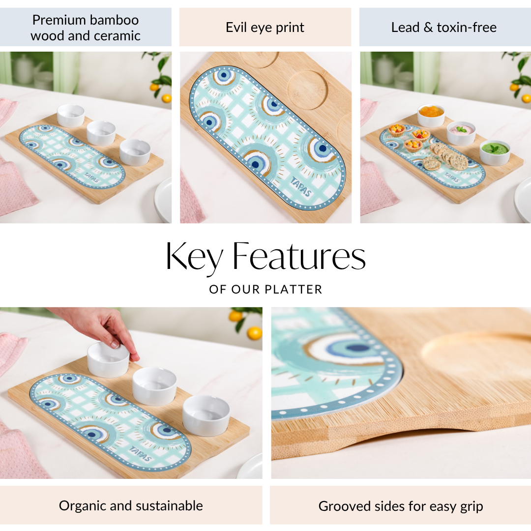 Design: Enhance your serving game with this beautifully designed bamboo and ceramic platter. Crafted with a smooth, natural bamboo base featuring rounded corners, it showcases a capsule-shaped ceramic tile insert in soothing turquoise tones, adorned with geometric evil-eye motifs and a text that says, "TAPAS" ("Small Spanish savoury bites, traditionally enjoyed with drinks at a bar). The platter includes three perfectly fitted slots that hold glossy white ceramic bowls, creating a striking contrast against the vibrant, artistic base for a stylish presentation.