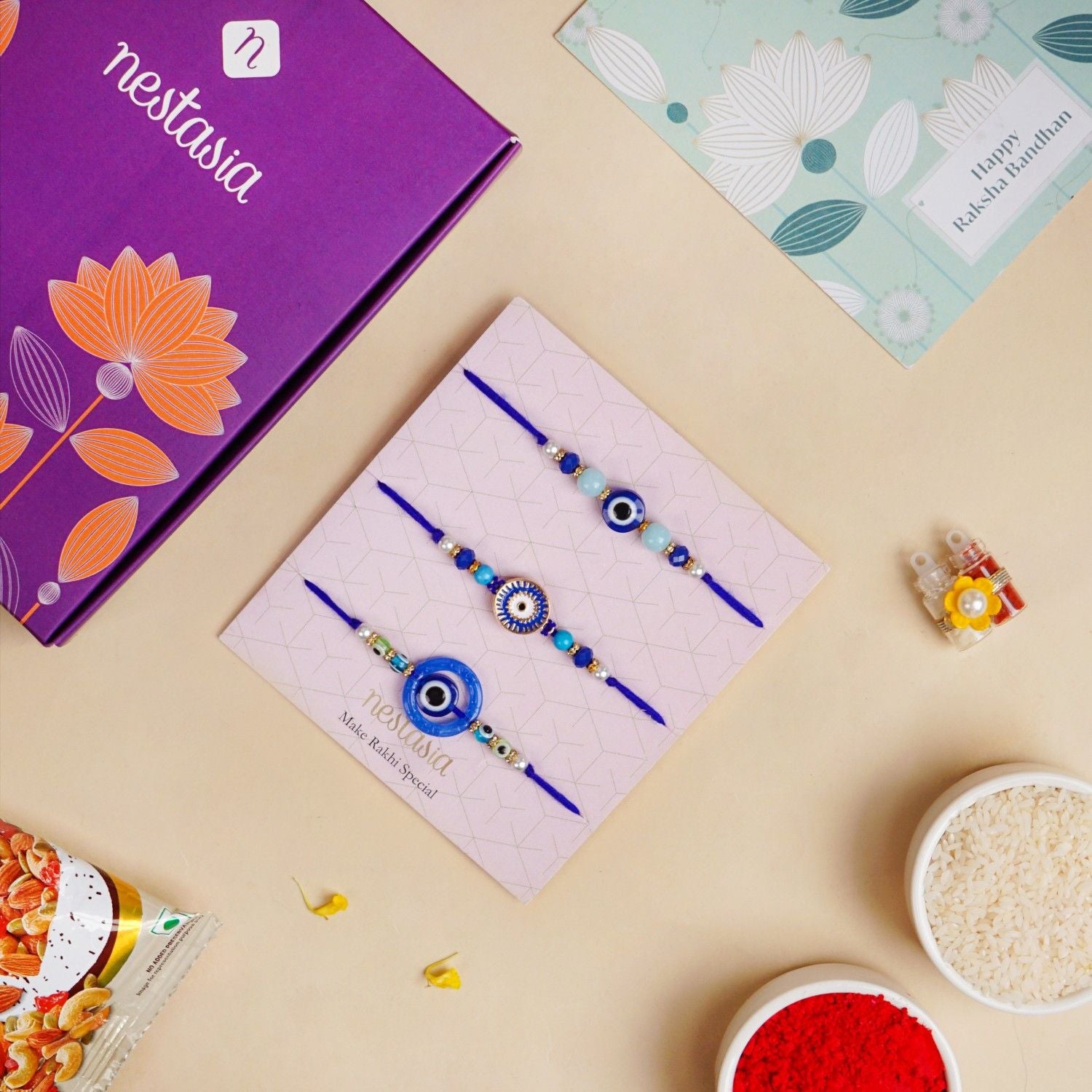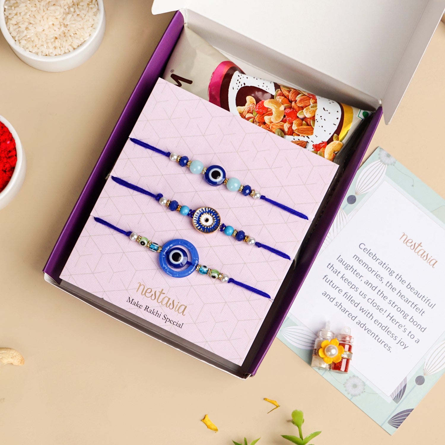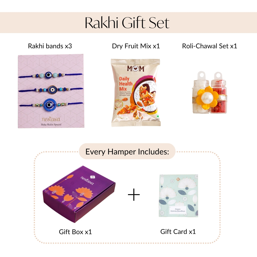 A striking mix of cobalt blue, white, and gold, this Rakhi set of 3 features iconic evil eye charms paired with polished beads and metallic accents. Each design balances protection with polish, perfect for siblings with a flair for style. The set includes 3 Rakhi bands, 1 roli chawal bottle set, 1 pack of mixed dry fruits (free gift), 1 gift box, and 1 wish card.