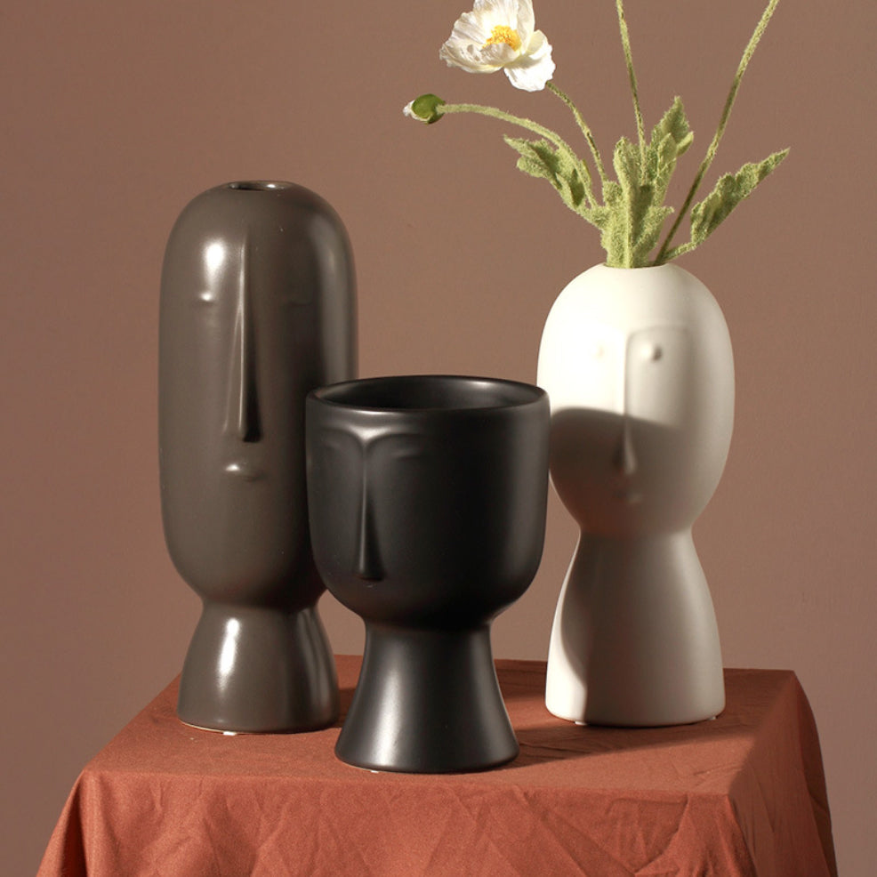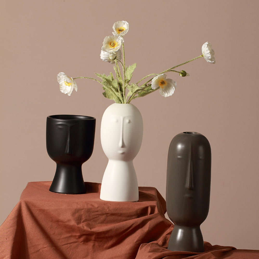 Face vases that come with a face shaped pattern on the surface. The diagonal foot of the vases give the look of an actual human face. The mouth of the vase can be filled with different colored succulents, climbers and creepers or flowers, to give the face a hair like illusion with the help of these plants. The flower vase if also abled enough to hold a big bouquet of flowers owing to its wide mouth. The colors of the vases may appear to be different under different light settings.