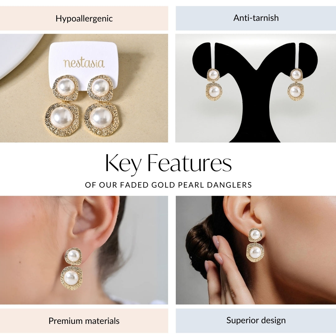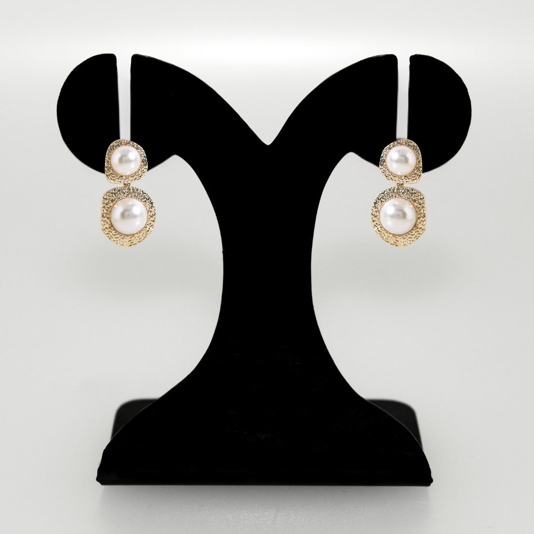 These gold-toned danglers are all about texture, contrast, and a little touch of magic. The top stud features a hammered, organic-looking gold piece with a luminous white pearl resting on it, like a little drop of light. Below, a larger dented gold piece swings freely, adding movement and character, while another pearl bead sits right at the center, tying it all together.
