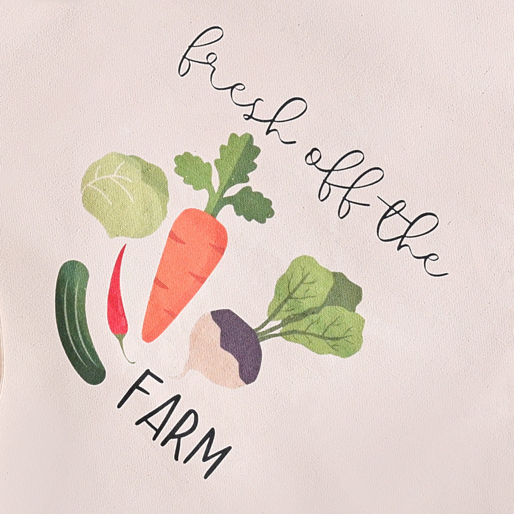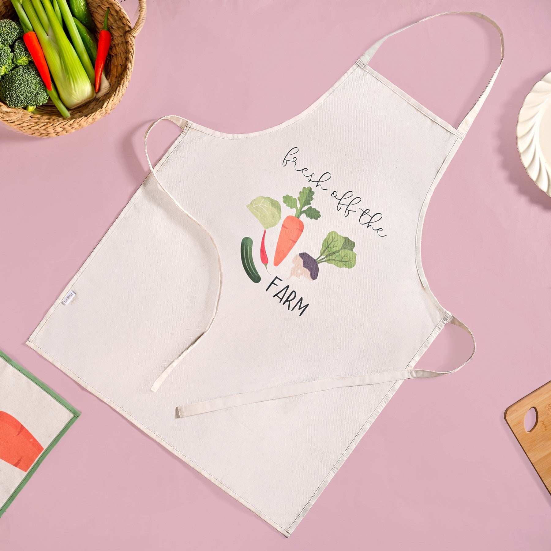 Design: This fancy apron set features a crisp "Fresh Off The Farm" design, adorned with colourful vegetables like carrots, cucumber, chilli, turnip and cabbage. The mitten and pot holder have matching green borders, and the hand towel has a vibrant carrot print complementing the apron. The sustainable natural canvas base and cheerful green trim create a look of rustic warmth and country charm, making it a perfect kitchen upgrade for home chefs.