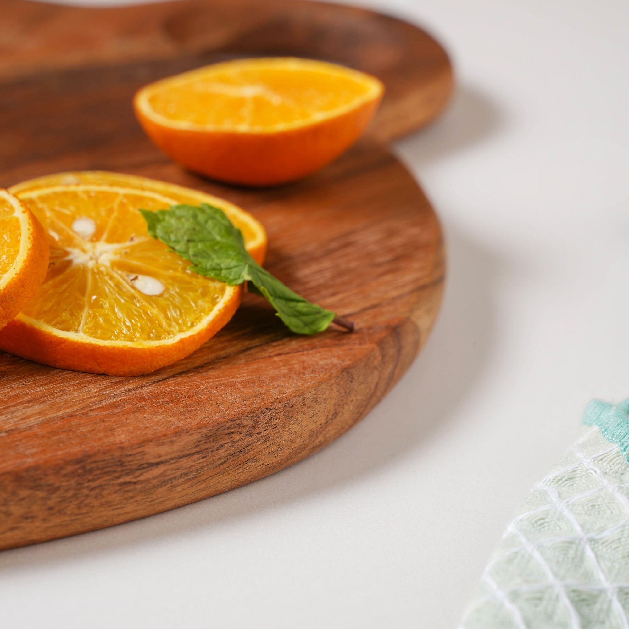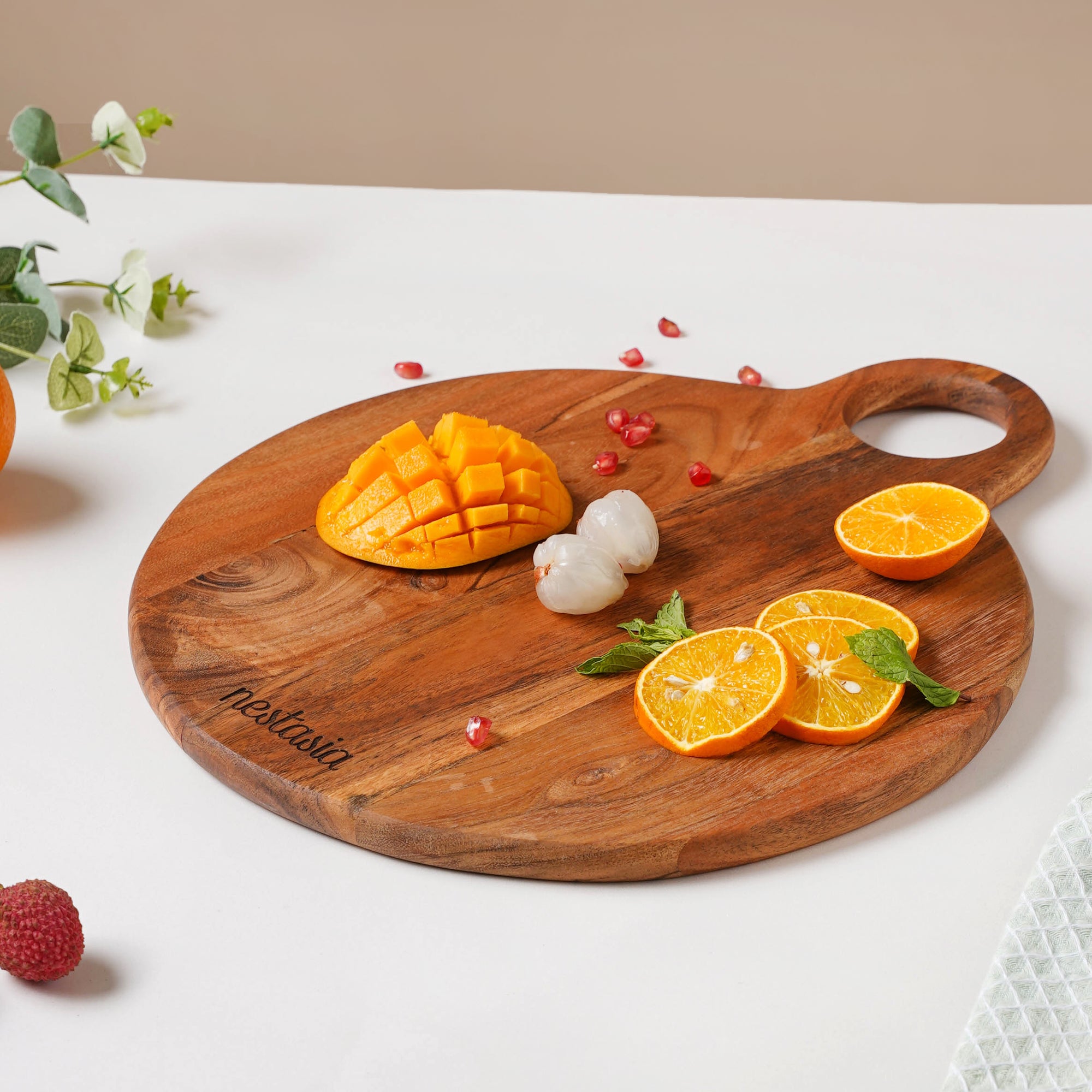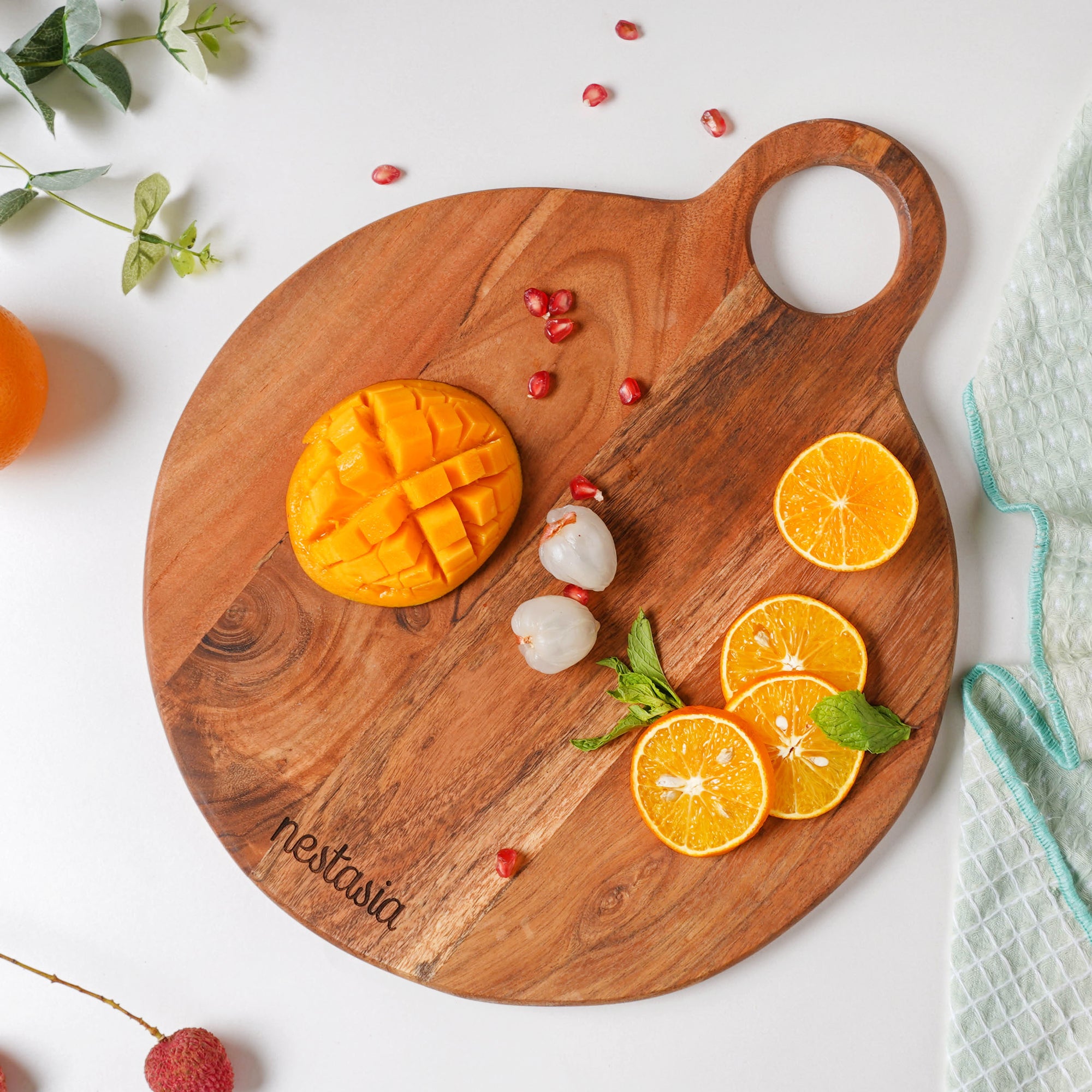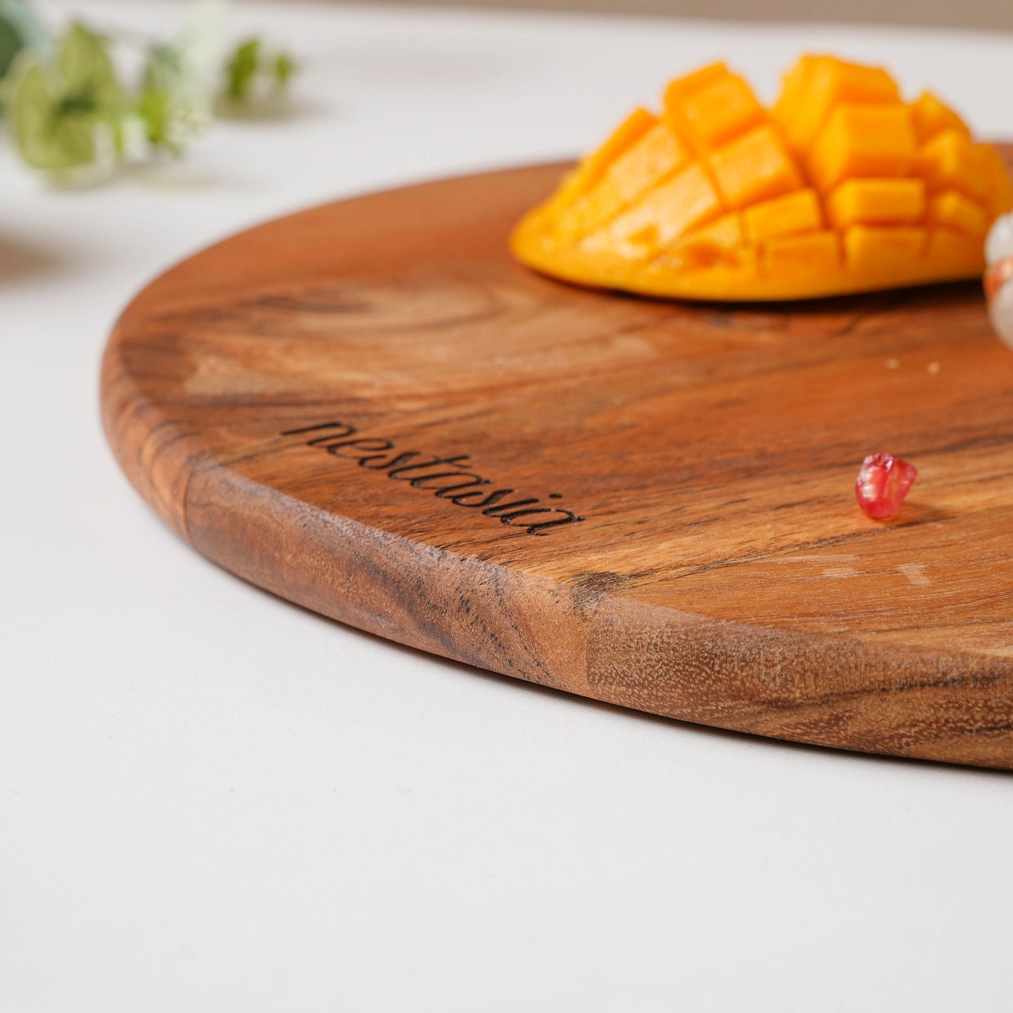A round platter board made of acacia wood can be used to serve a variety of cuisines. Fresh fruits, nuts, olives, crackers, bread, cheese and charcuterie assortments, dips, spreads, and miniature appetisers are a few of the more well-liked choices.