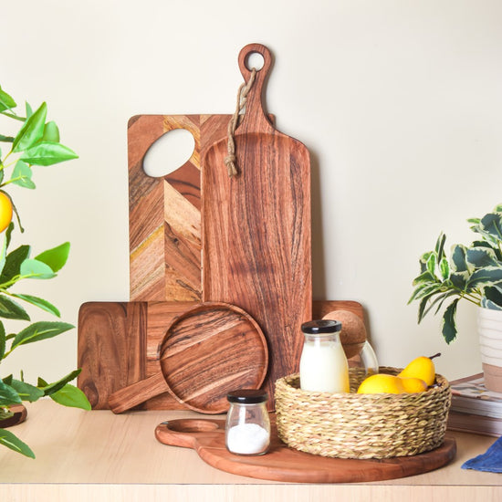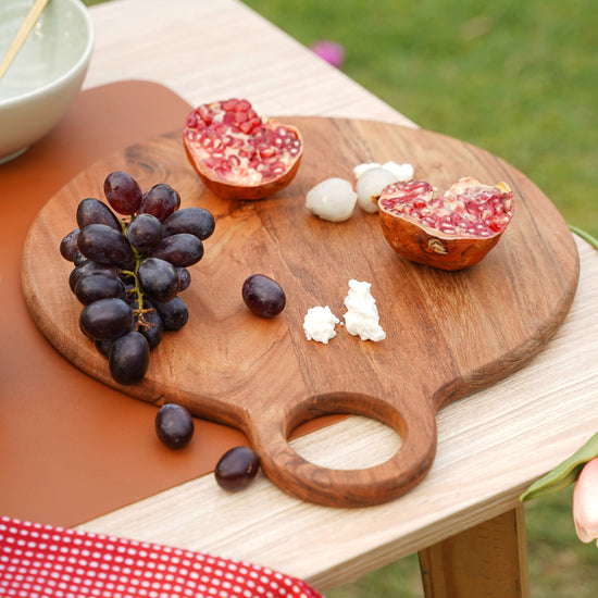 For any occasion, our adaptable circular acacia wood plate becomes the ideal centerpiece! This gorgeous platter, made of high-quality acacia wood, combines beauty and utility to improve your eating experience. This round platter is made to dazzle, whether you're serving appetizers, displaying a charcuterie spread, or hosting a dinner party. While its generous surface offers enough room for arranging a variety of delectable treats, its natural grain, and warm tones bring a touch of coziness to your table setting. Our round acacia wood platter is a must-have for both informal get-togethers and formal parties thanks to its robust design and smooth texture.