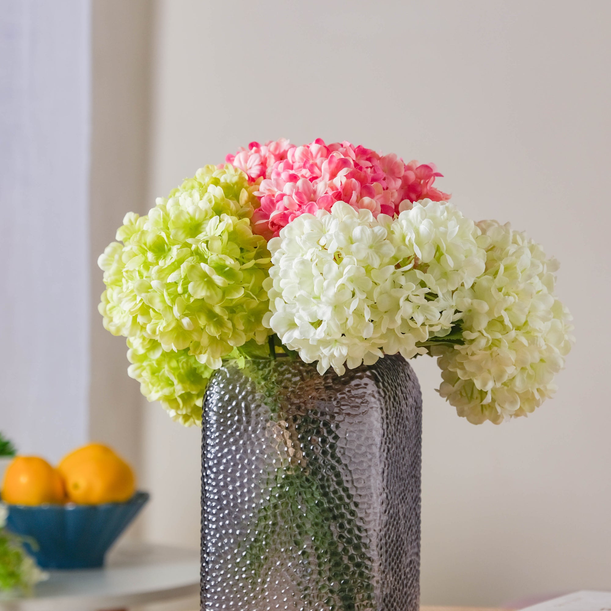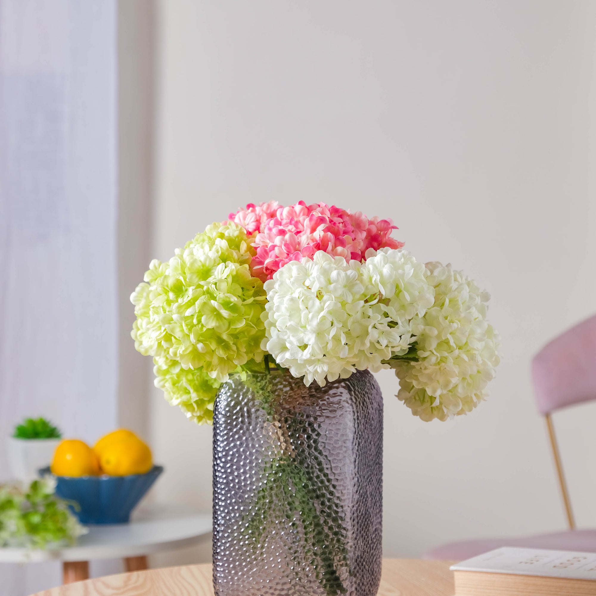 The hydrangea stem, which has blooms in the shape of a ball and several leaves in forest green, comes in three appealing colors: pink, white, and green. The colors in the variants are ideal for creating bouquets for special events. By clipping off the stem, the flower head might also be used for hampers and presents. The flowers are well-crafted to appear natural, and they help in making the home a pleasant place to live in the midst of nature's bounty.