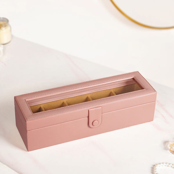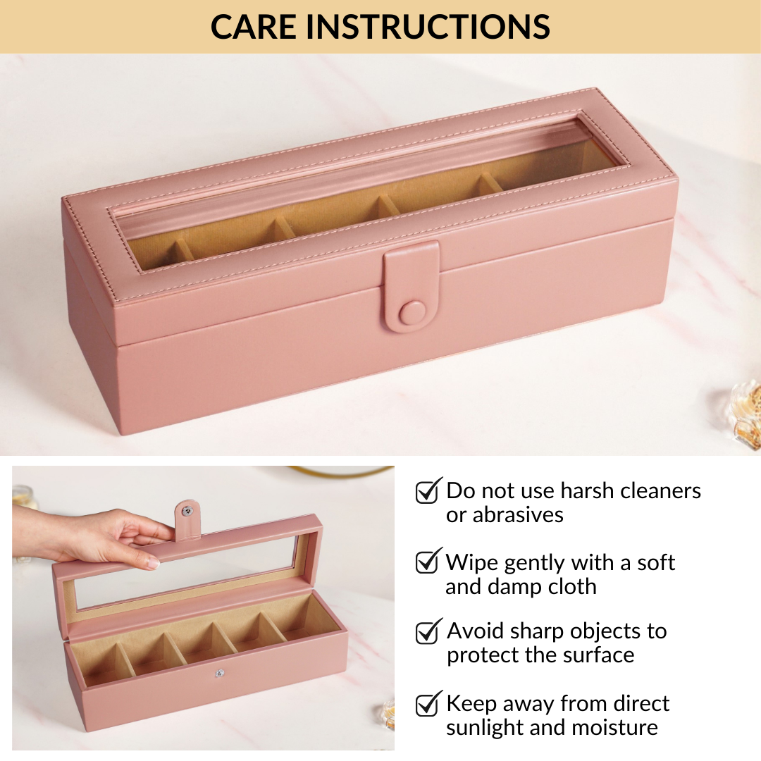 Benefits: The firm structure helps shield watches from dust, scratches, and everyday wear. Individual compartments keep six watches neatly organised and prevent contact between pieces. Soft velvet lining and cushioned pillows support proper positioning and reduce surface friction. The transparent window allows easy viewing and quick selection without opening the case. Its compact size makes it space-efficient for storage and safe for travel, while the blush finish adds a refined, gift-ready appeal.