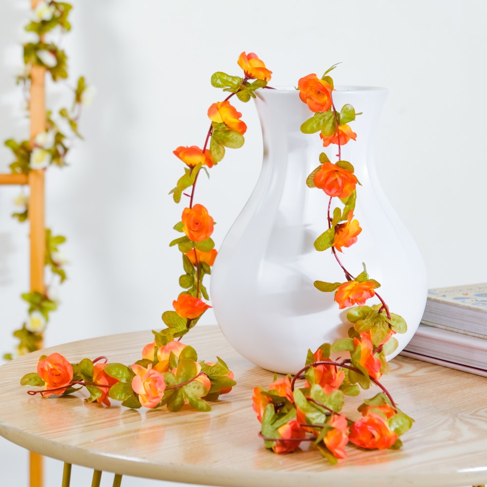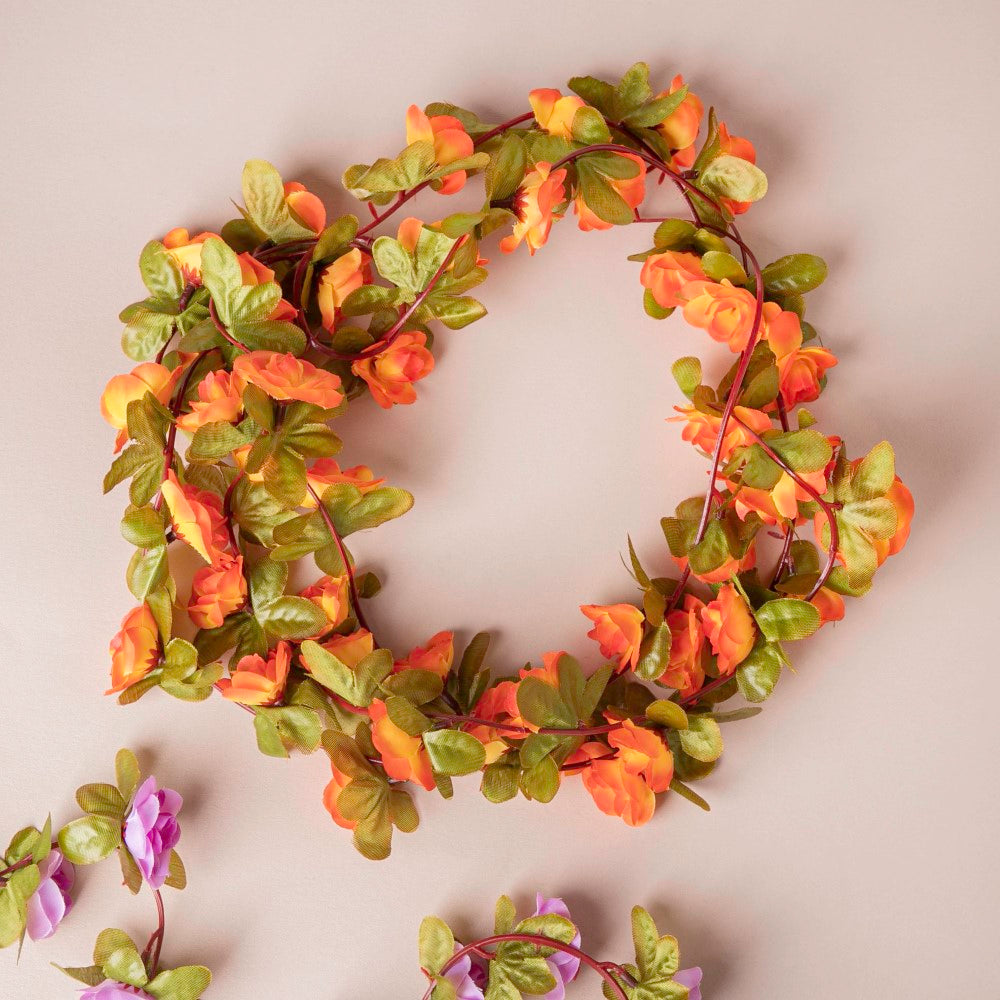 Faux flower vines, crafted of high-quality ribbon, resemble exquisite and natural orange and yellow-toned roses that feature layers of vibrant and patterned green leaves. Bring the beauty of nature into the home with the advantage of permanency as the faux florals won't wilt like natural flowers. The faux rose vine makes for a beautiful decorative accent that may be intertwined on windows and balconies or hung on walls.