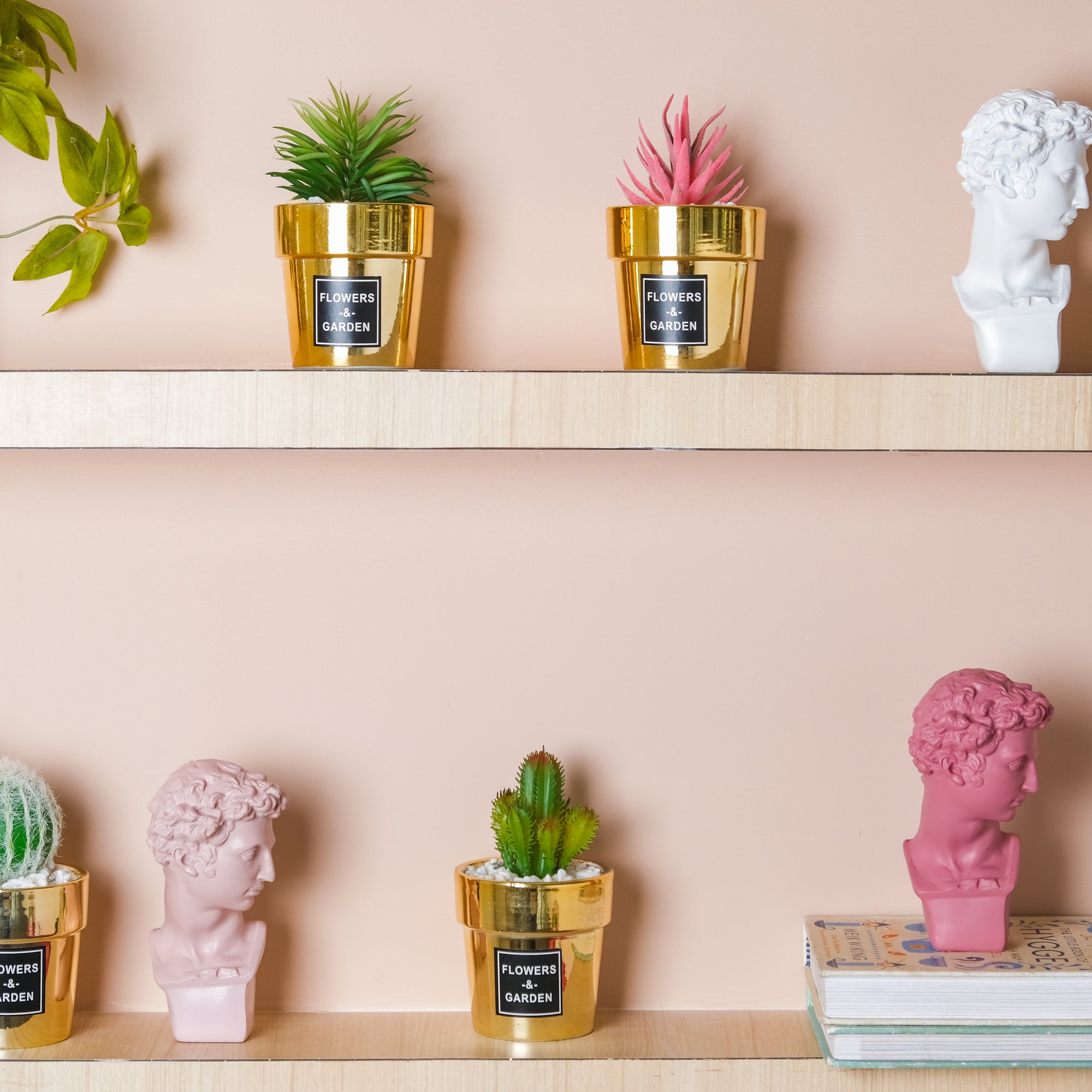 Gold-colored planter pots with faux tropical desert plants - available in quite a number of attractive variations. The shiny gold surfaces of the pots containing colorful succulents have the words 'flowers and garden' etched on them against a black surface which adds to its overall aesthetic. Easy to maintain since they require no watering whatsoever, the artificial plant pots are the best fit for people who like greenery but do not have the time or the patience to take care of them. The tropical planters that look extremely realistic can add a splash of cheer and color to any corner of the house.
