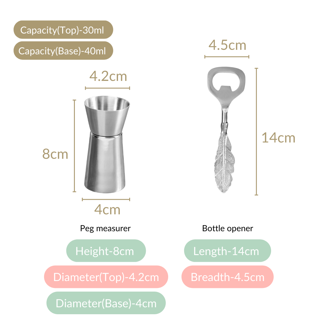 The peg measurer is used to accurately measure and pour specific amounts of liquid. It typically has marked increments to help you measure out precise quantities for cocktails and other beverages, ensuring consistency in your drinks.