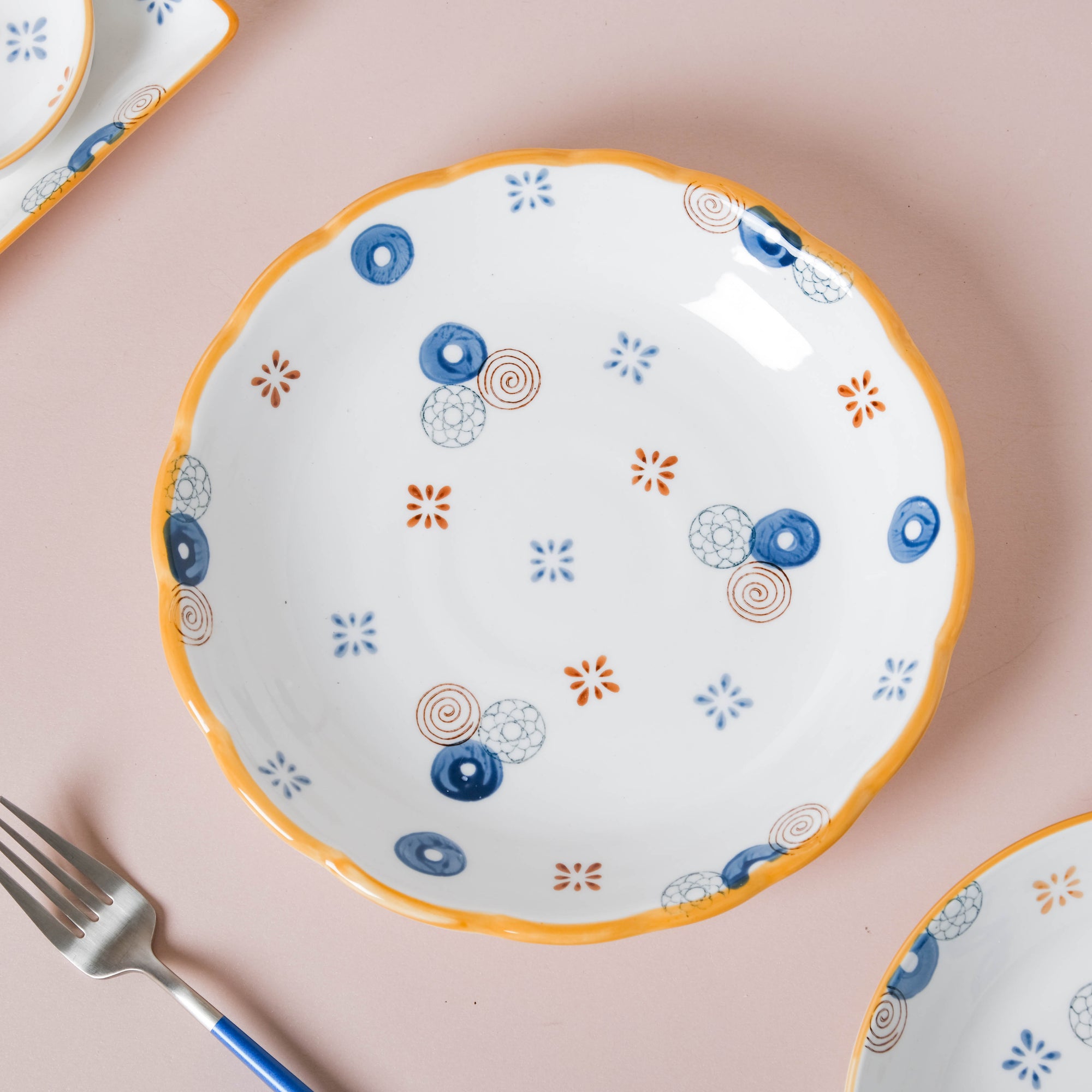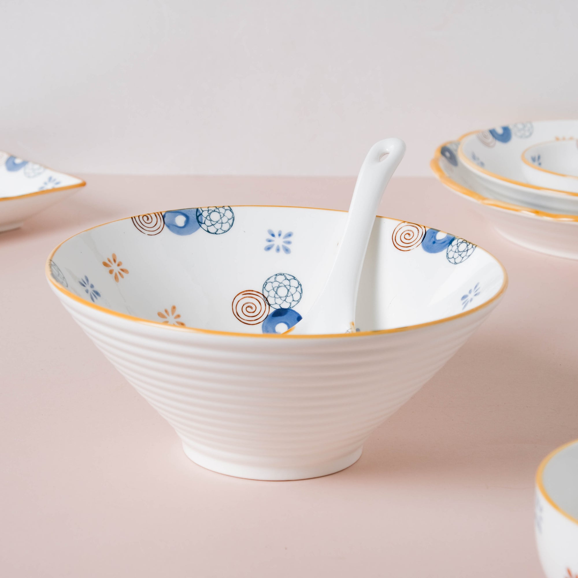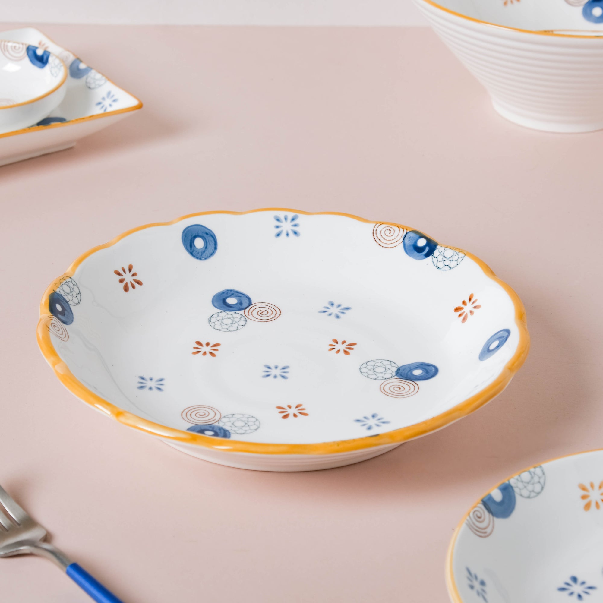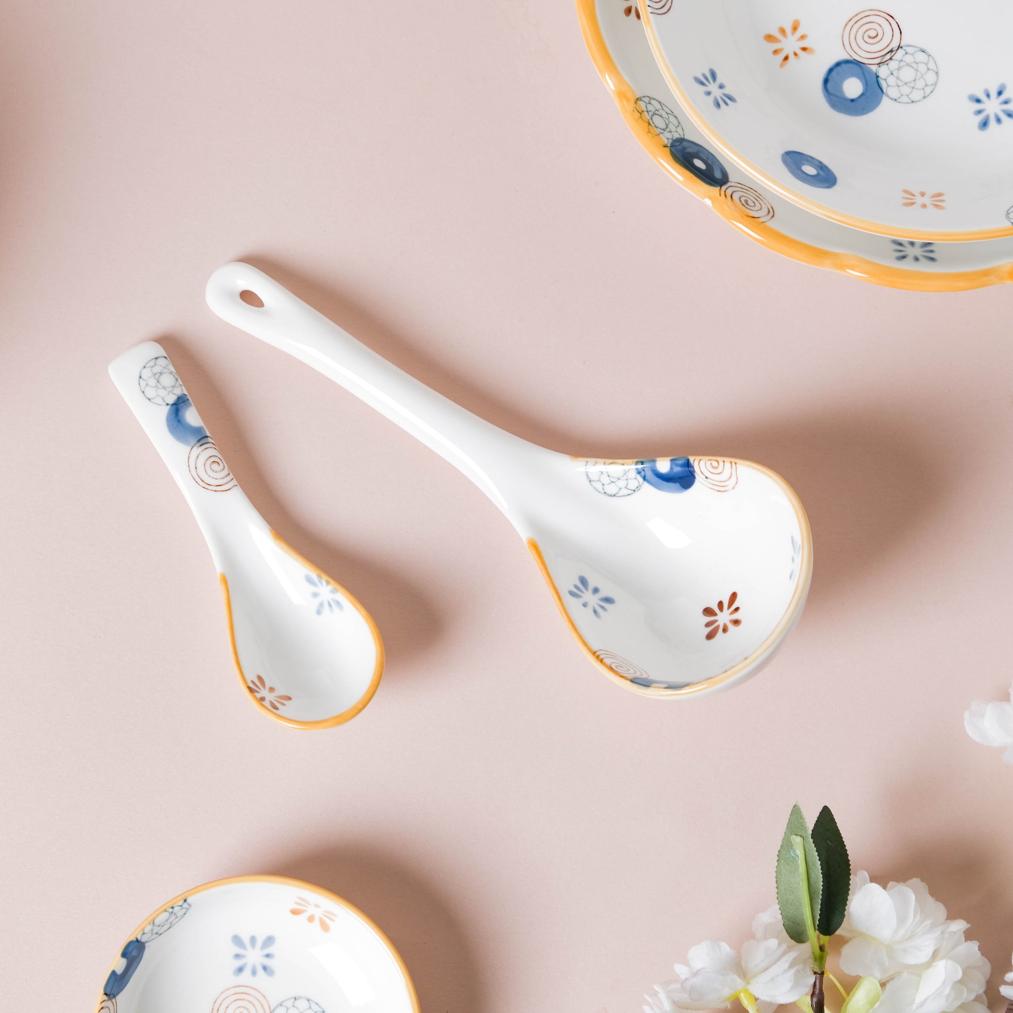 A celebration is incomplete without a grand spread, cheer, and the presence of our cherished ones. The Feliz pasta set, with happiness in its name, is an amalgamation of small and large bowls and plates to serve joyousness in all portions. The ceramic pasta set is an embodiment of 6 pasta plates, 6 dip bowls, 6 side/soup bowls, 6 deep/salad plates, 1 long plate, 1 small and 1 large serving bowl, 1 ramen bowl, 6 soup spoons, and 2 serving spoons. With patterns that are clinks of magic, use the eclectic set while hosting a housewarming or on the occasions of Diwali, Christmas, Mother’s Day, or Father’s Day to spread warmth and fondness.