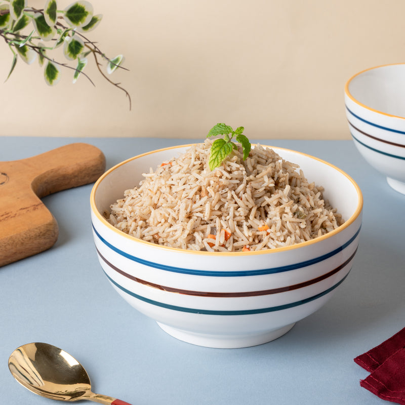 Crafted sleekly with horizontal lines on a pristine white backdrop, the serving bowl is sturdy and simple, making it a classic addition to any crockery collection. The white base is a perfect background to serve anything from colorful curries to spicy noodles. The ceramic serving bowl can be used for birthday parties to highlight party delicacies. The rim of the bowl is highlighted with a warm yellow color.