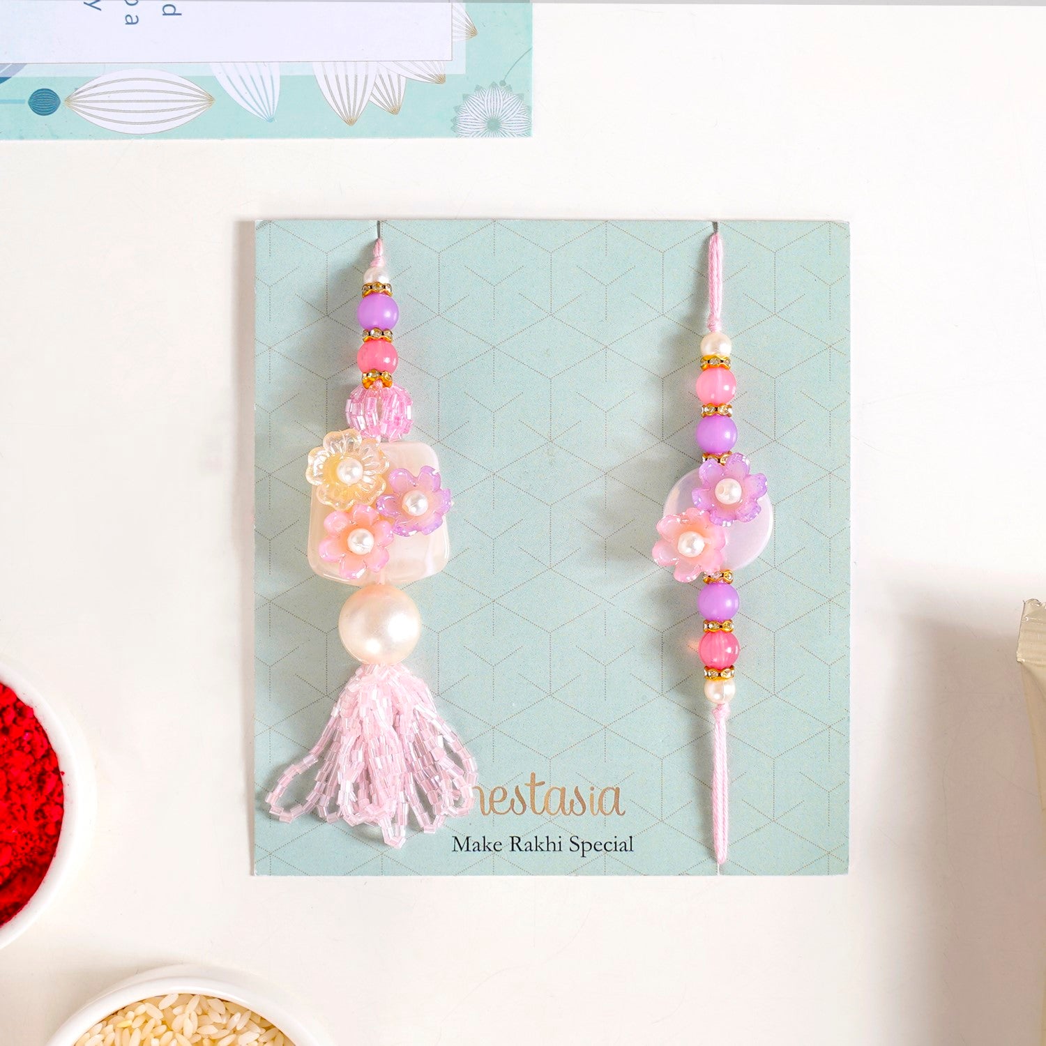 Blush Pink Floral Rakhi Lumba Set |