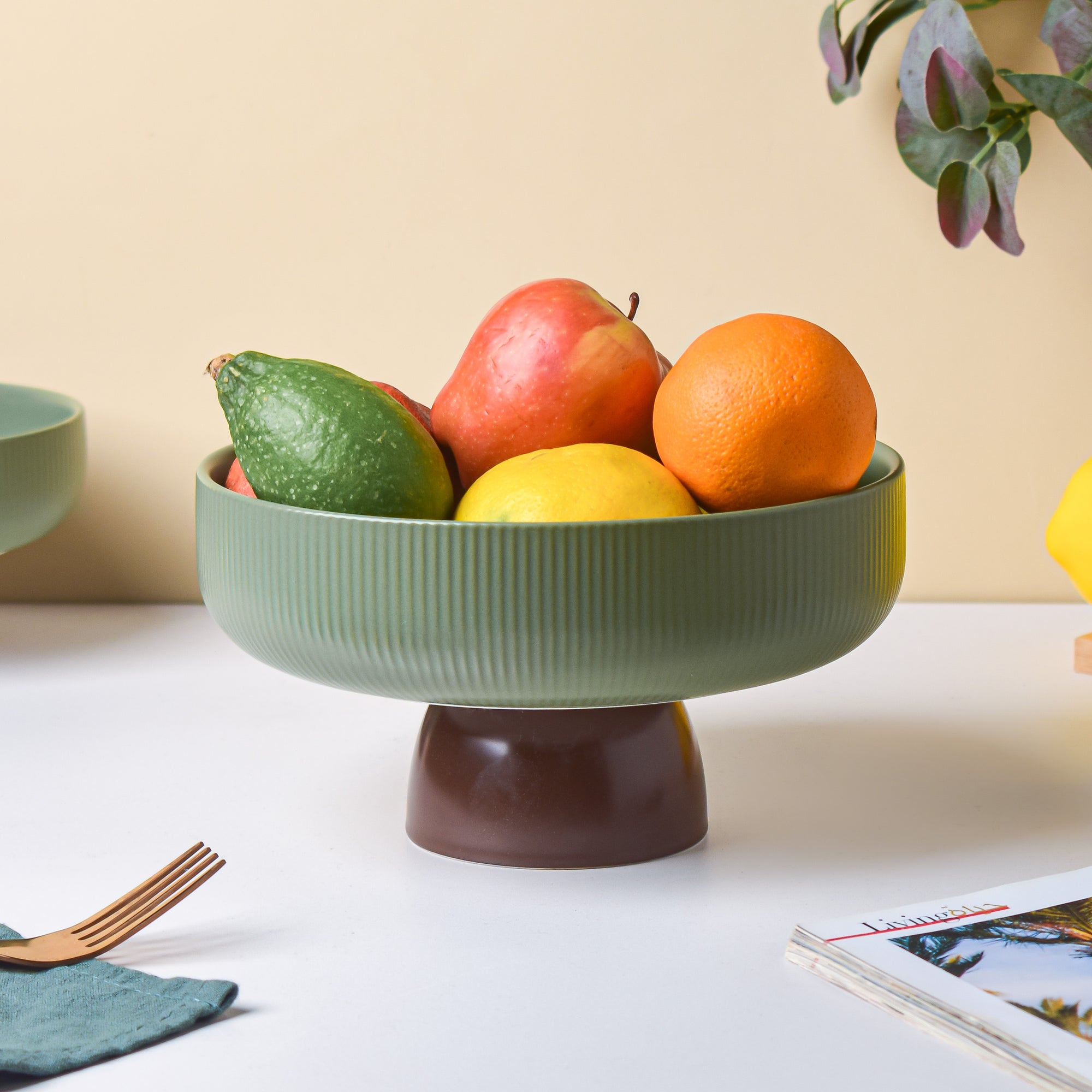 Elevate the party aesthetics with this opulent olive fruit bowl which is supported by a brown stand at the base. The fruit bowl with elevated edges is not only subtle and appealing but serves the purpose of a multipurpose bowl. From desserts to fruit salads, serve a myriad of meals in this ceramic tray after meals.