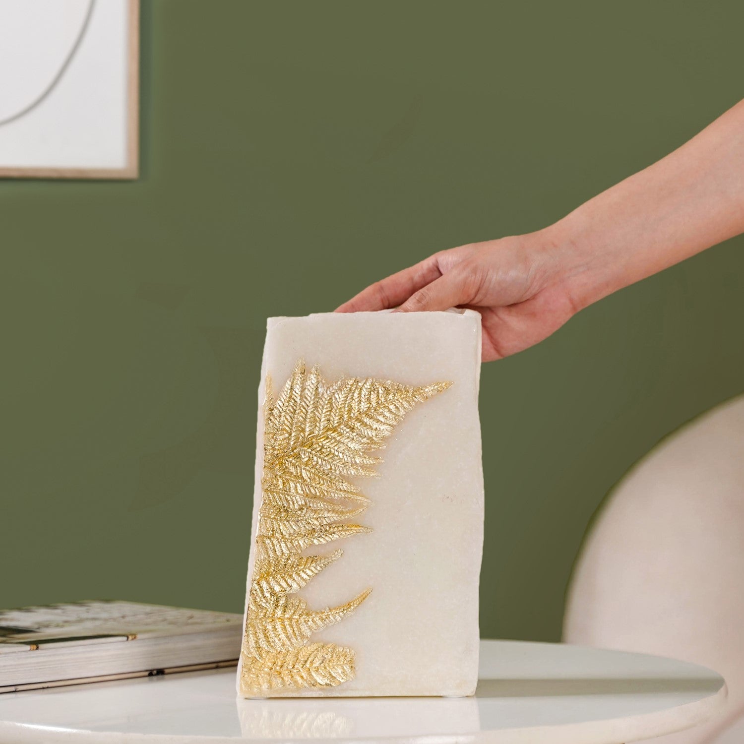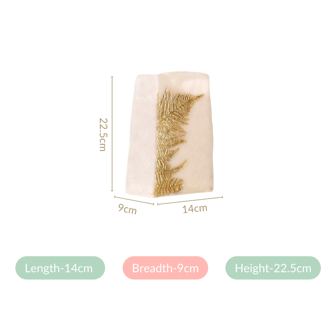 Design: This resin decorative vase stands out with its textured stone finish and a striking golden fern leaf print. The meticulously detailed leaf frond design enhances its visual appeal, making it a true work of art.