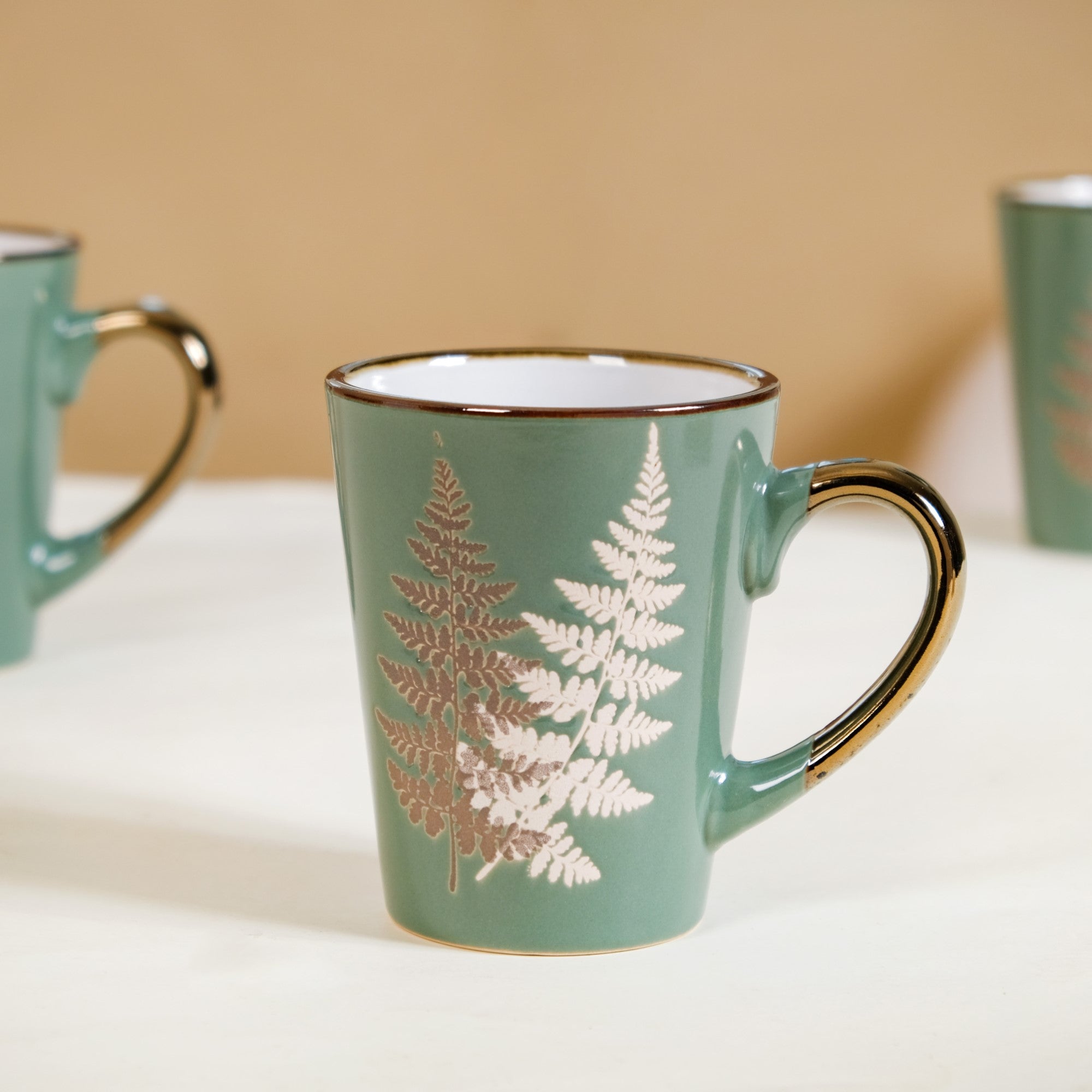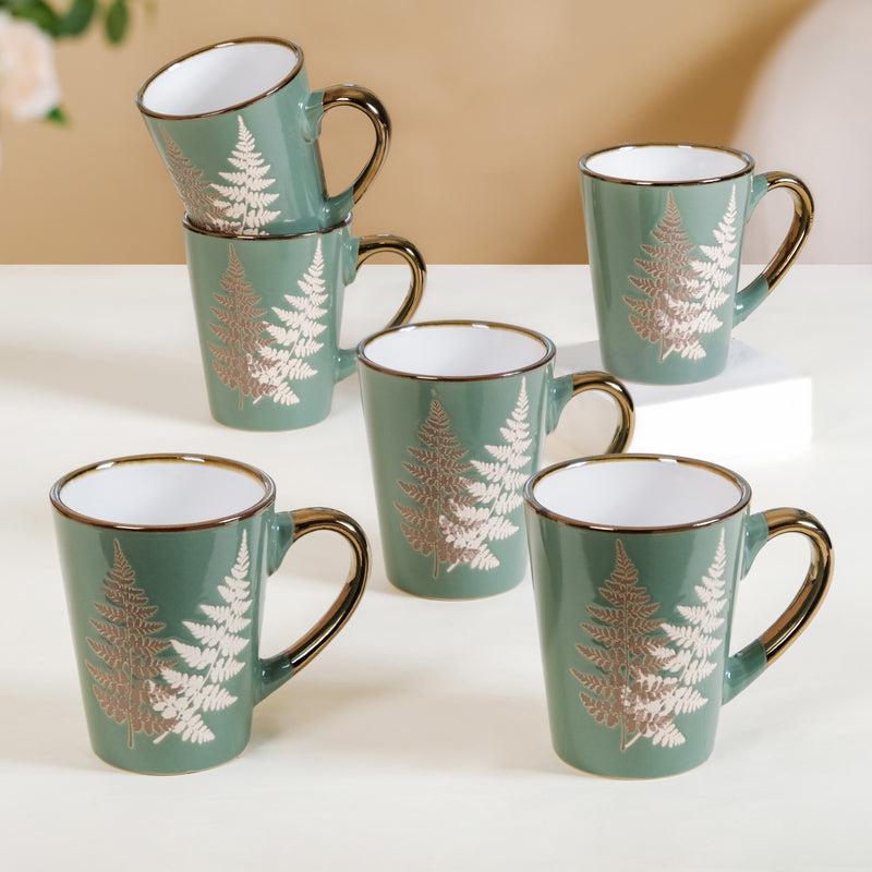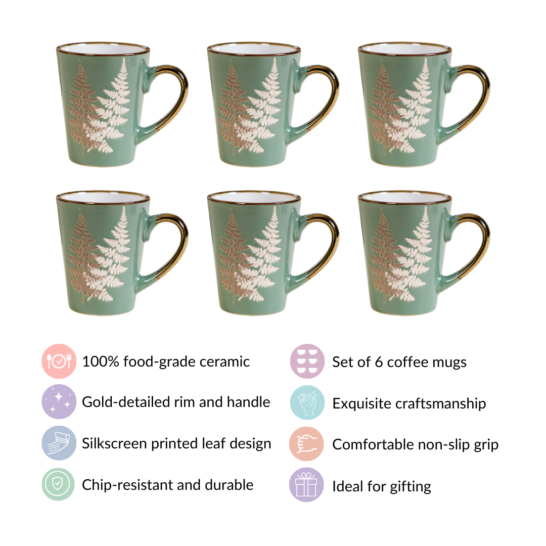 Elevate your morning coffee routine with our fern leaves metallic design coffee mug set of 6 in dark green. Immerse yourself in the allure of nature's beauty as you sip from these premium-quality mugs adorned with a striking silk-screen printed fern leaf design in black and white. The opulent gold metallic rim and handle add a touch of luxury to your daily ritual. Meticulously crafted for durability, these mugs offer a chip-resistant experience. The comfortable non-slip grip ensures every sip is a pleasure.