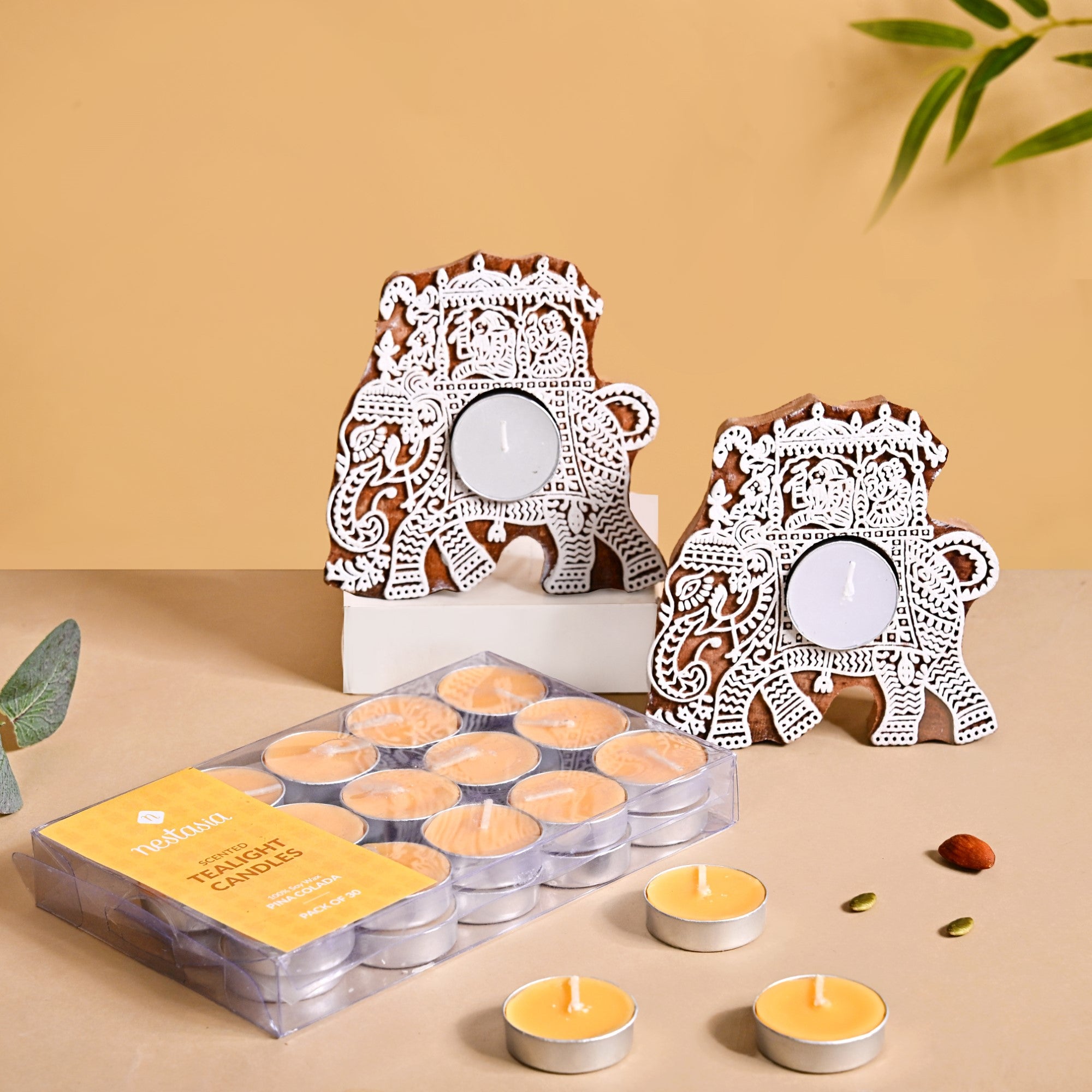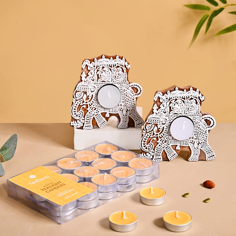 Light up your Diwali celebrations with a gift hamper that’s as vibrant as the festival itself! This enchanting hamper set features 2 wooden elephant chariot tealight holders, intricately handcrafted with Madhubani artistry, capturing the essence of Indian heritage. Each sturdy tealight holder showcases a majestic elephant, perfect for adding a cultural touch to your decor.